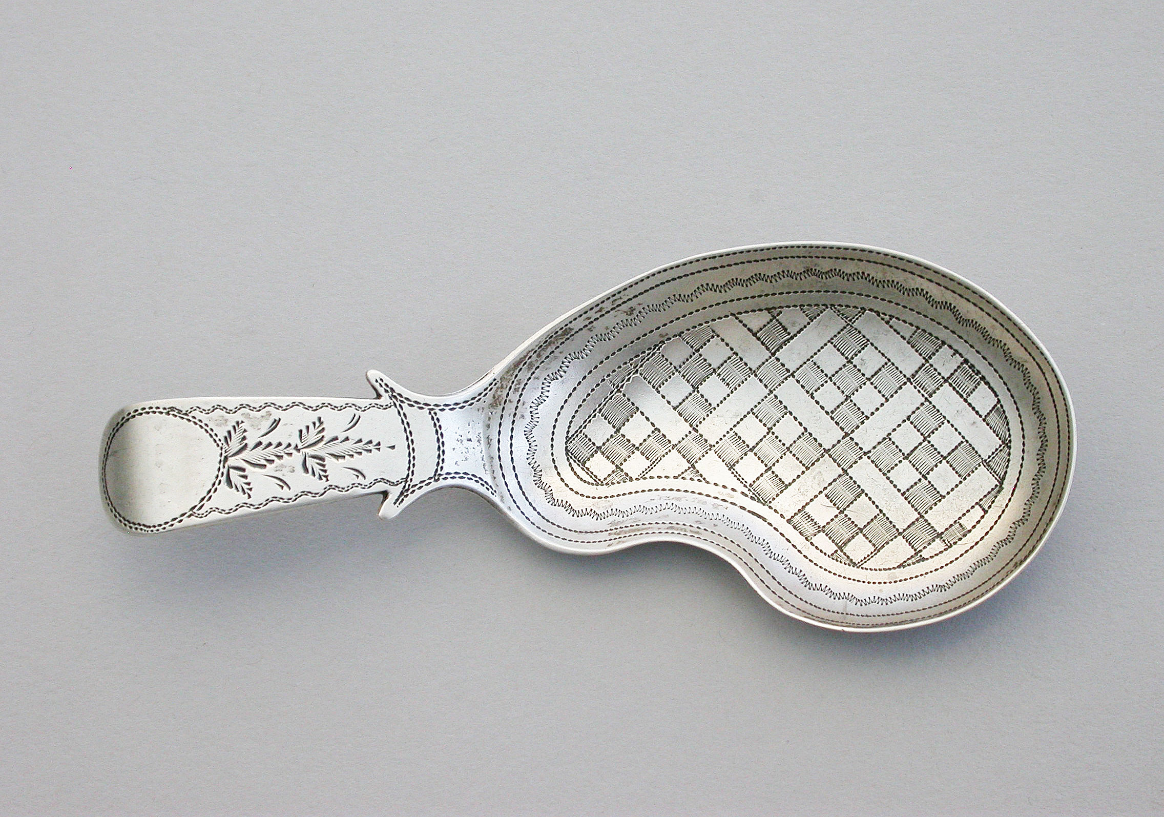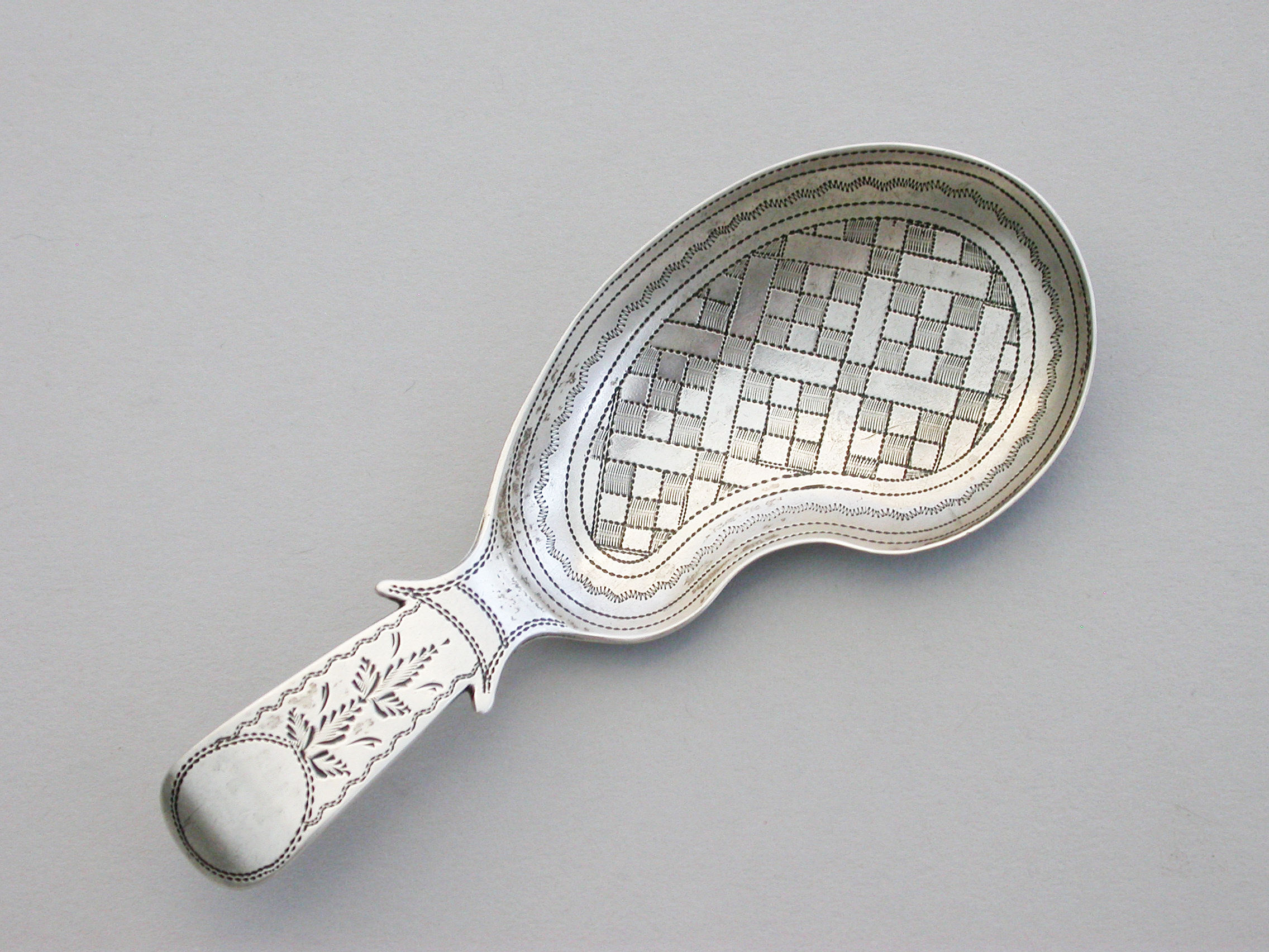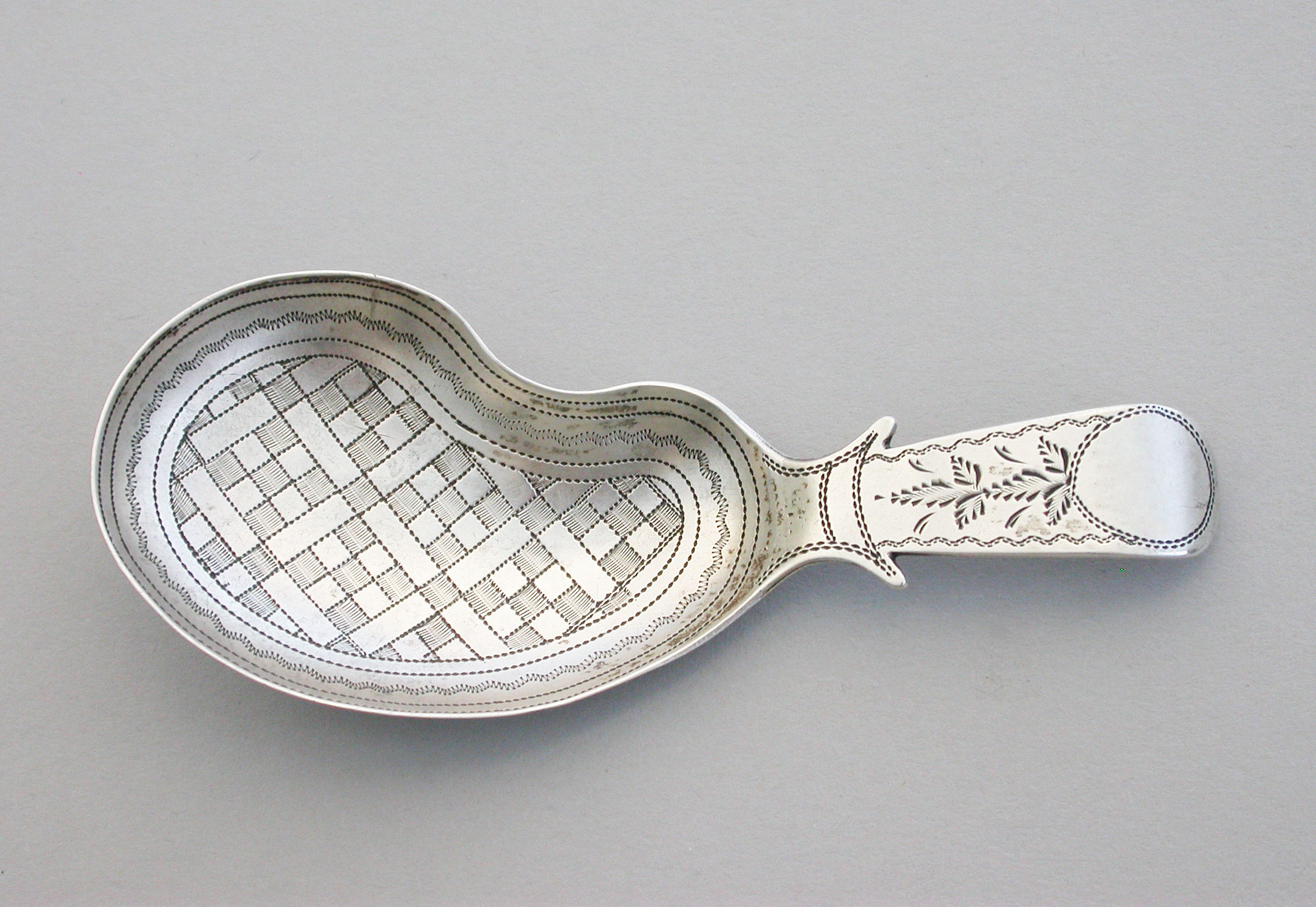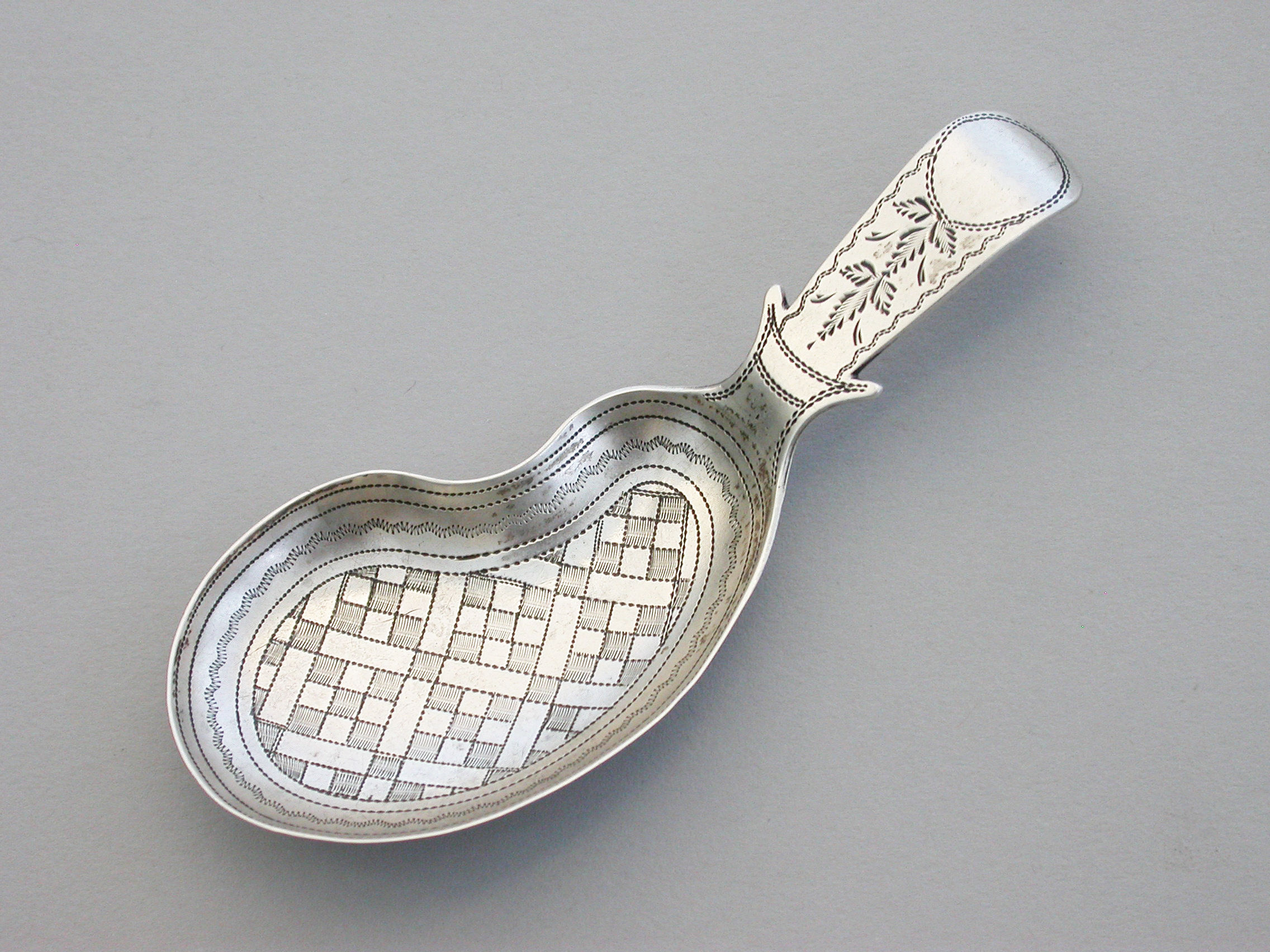 A rare George III silver Caddy Spoon with barbed Old English handle, the kidney bean shaped bowl with bright-cut engraved checkerboard decoration.