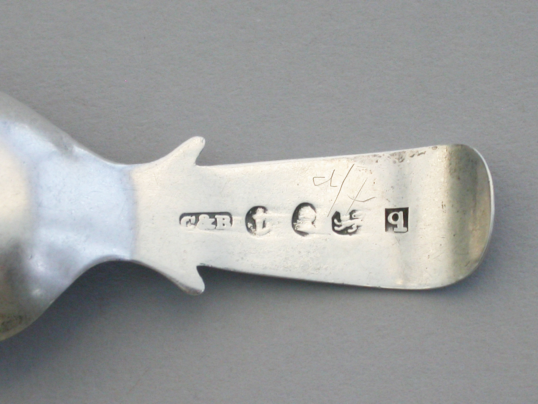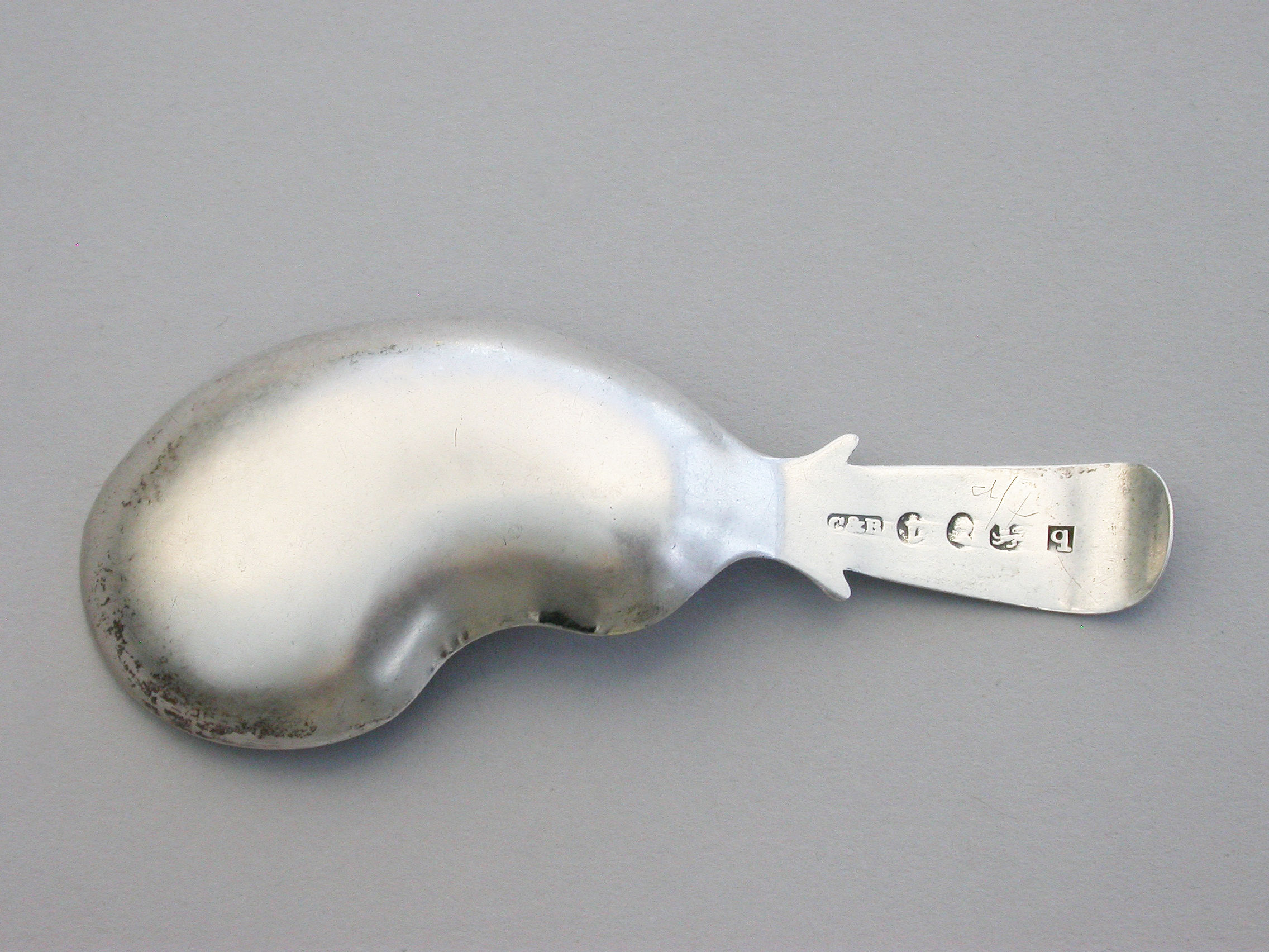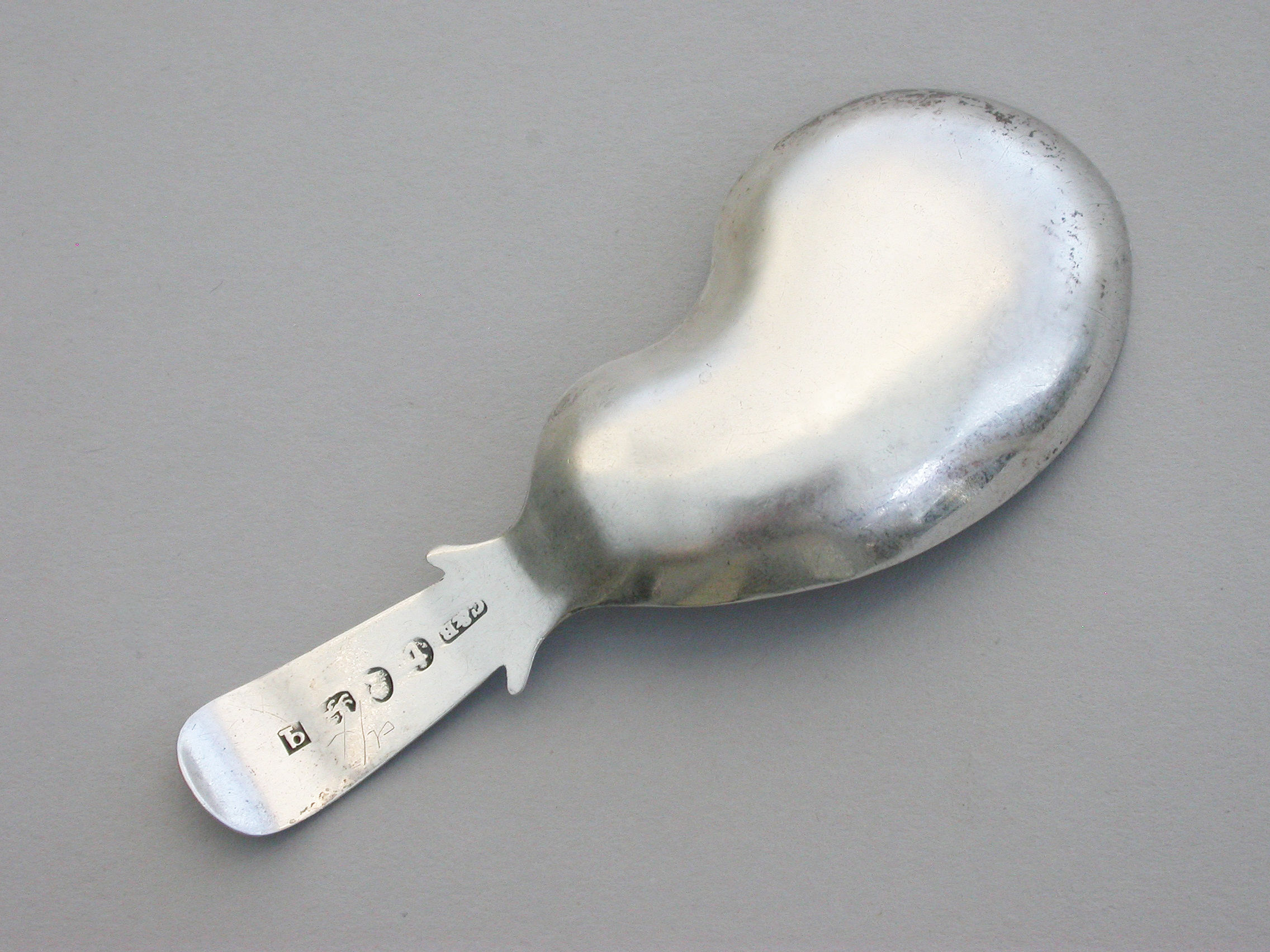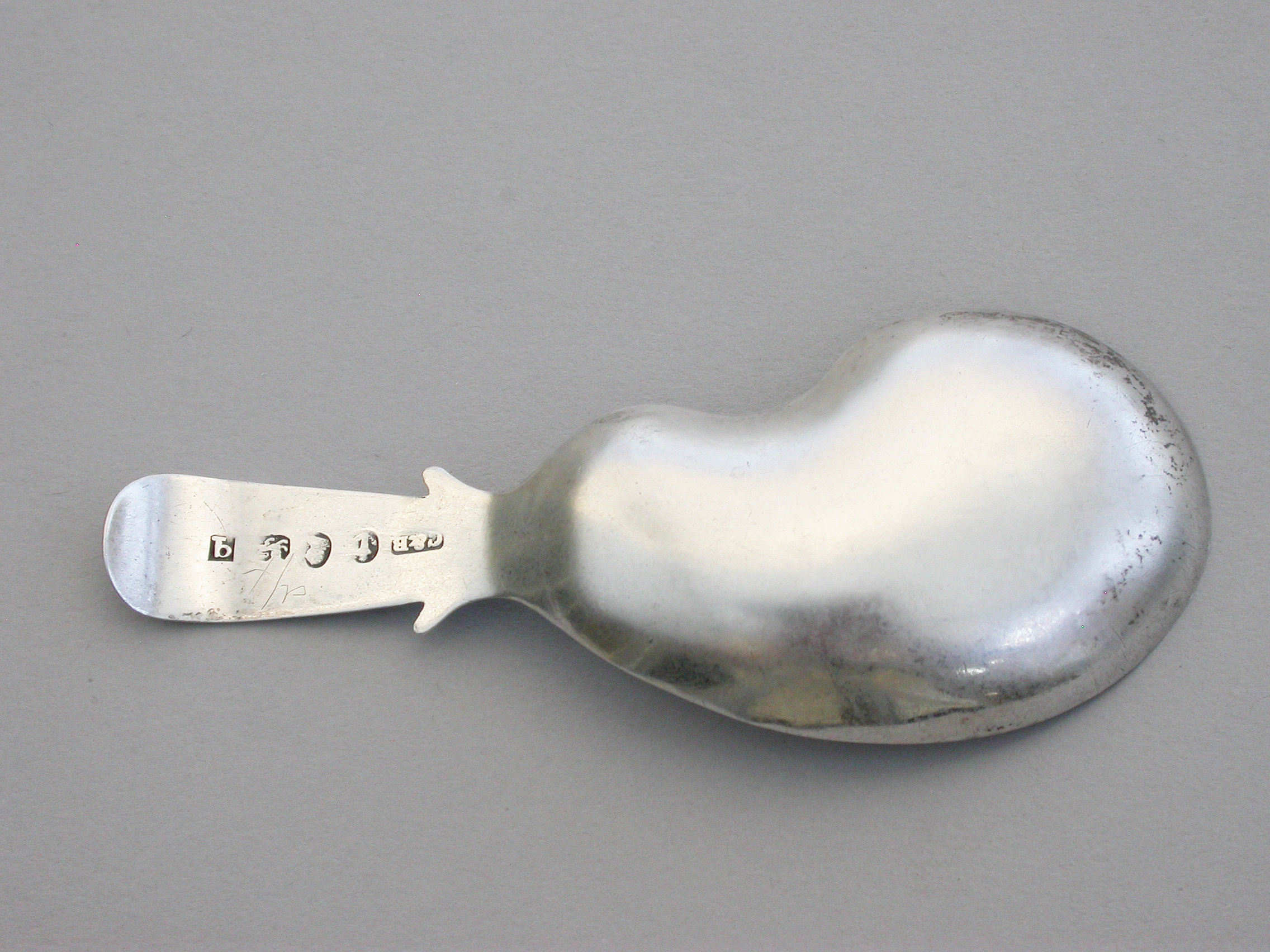 A rare George III silver Caddy Spoon with barbed Old English handle, the kidney bean shaped bowl with bright-cut engraved checkerboard decoration.