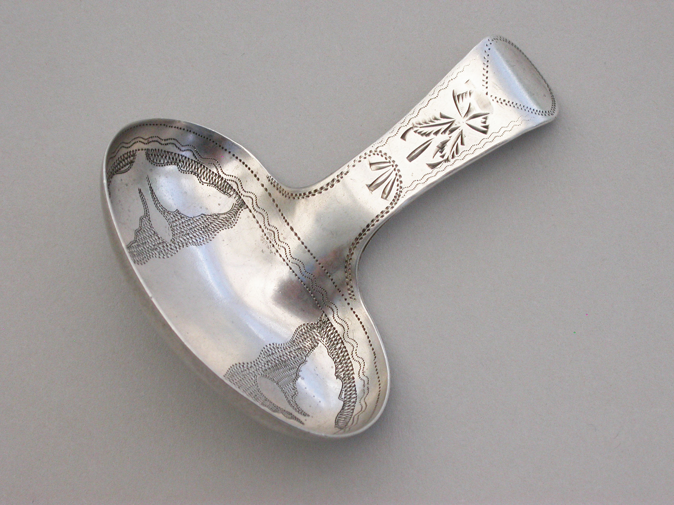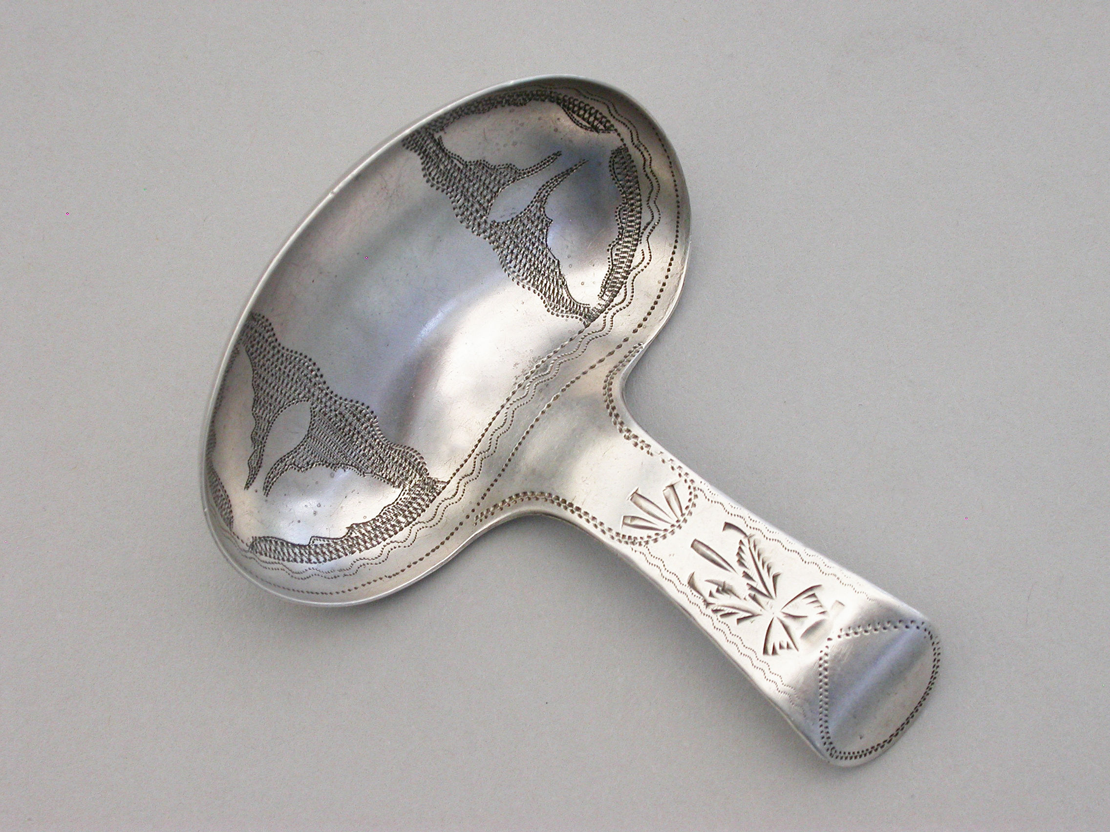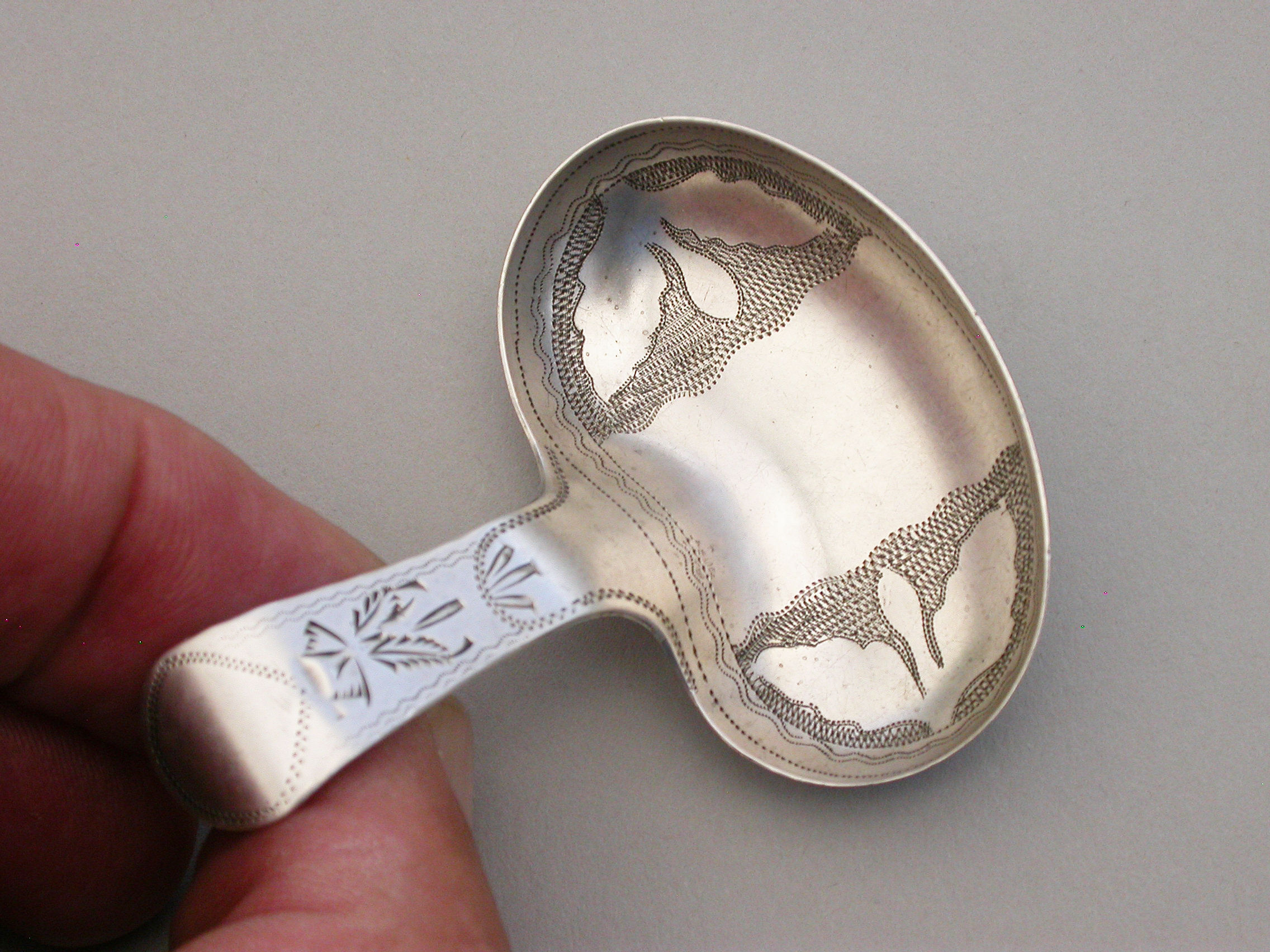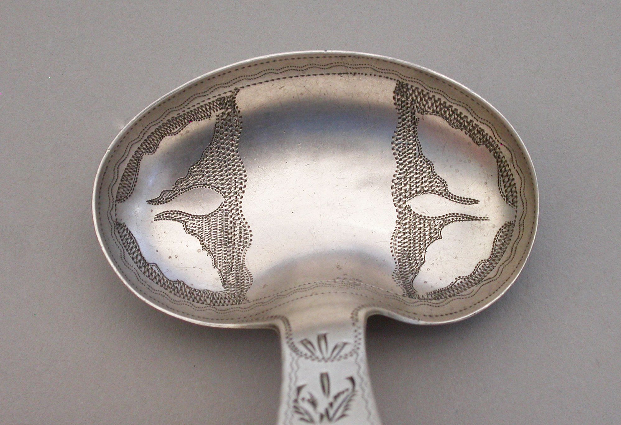A rare George III silver Caddy Spoon, the kidney shaped bowl engraved with foliate sprigs and wriggle work borders, curved Old English handle.