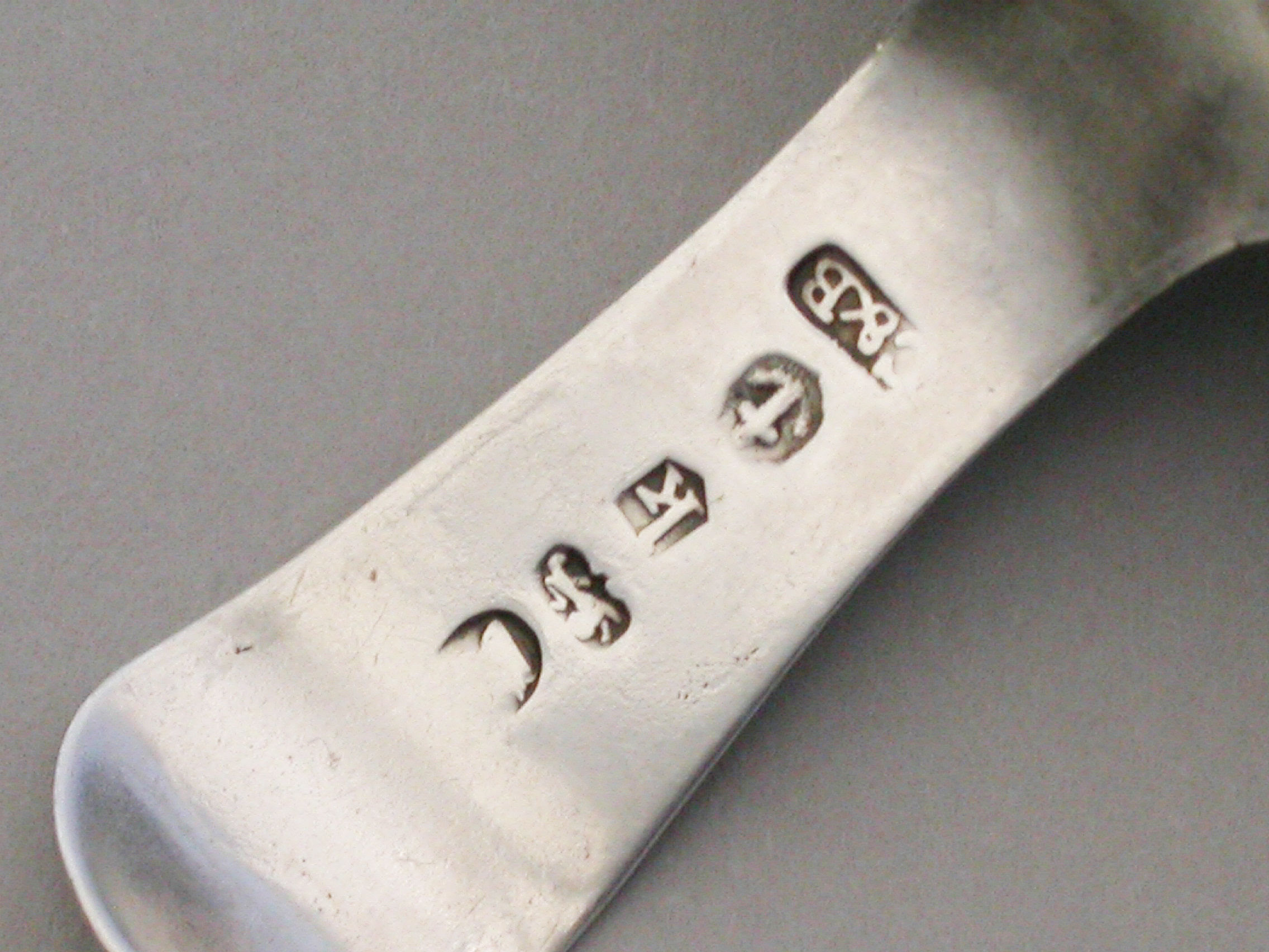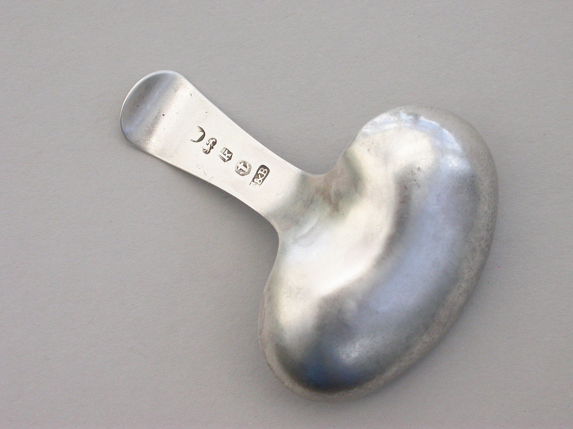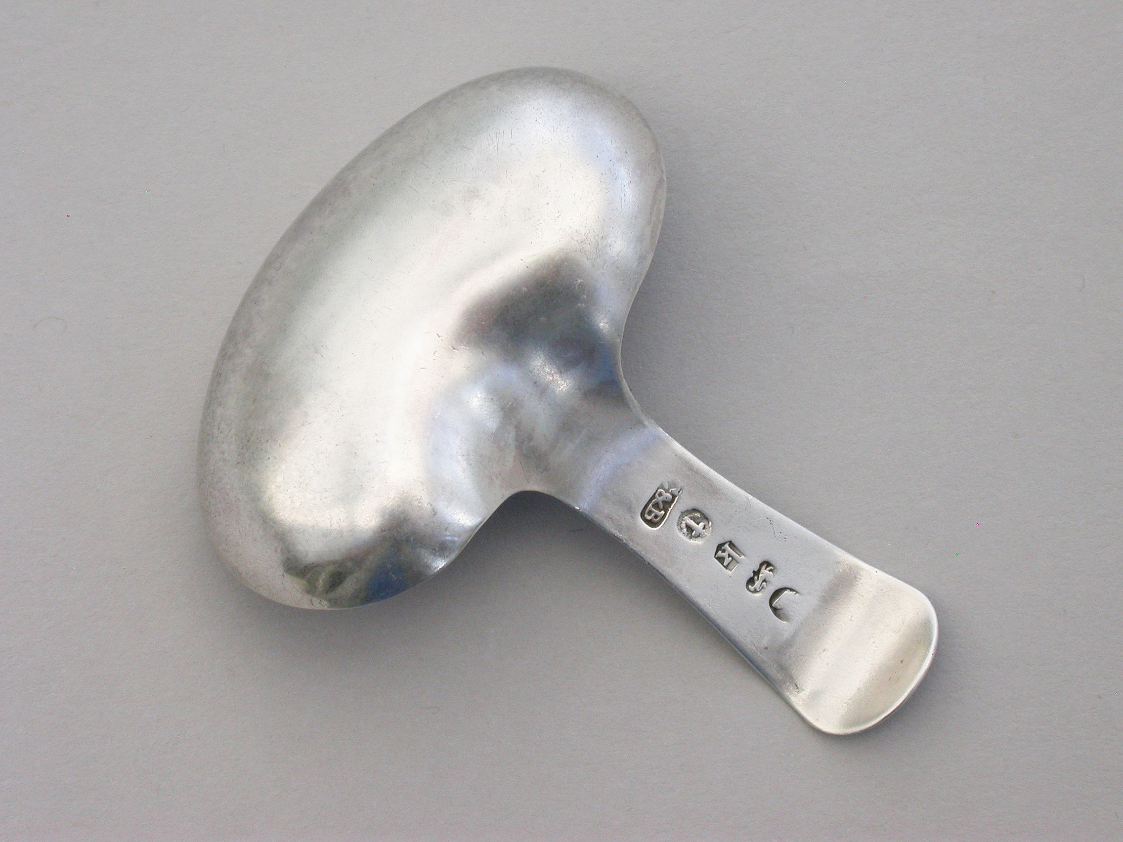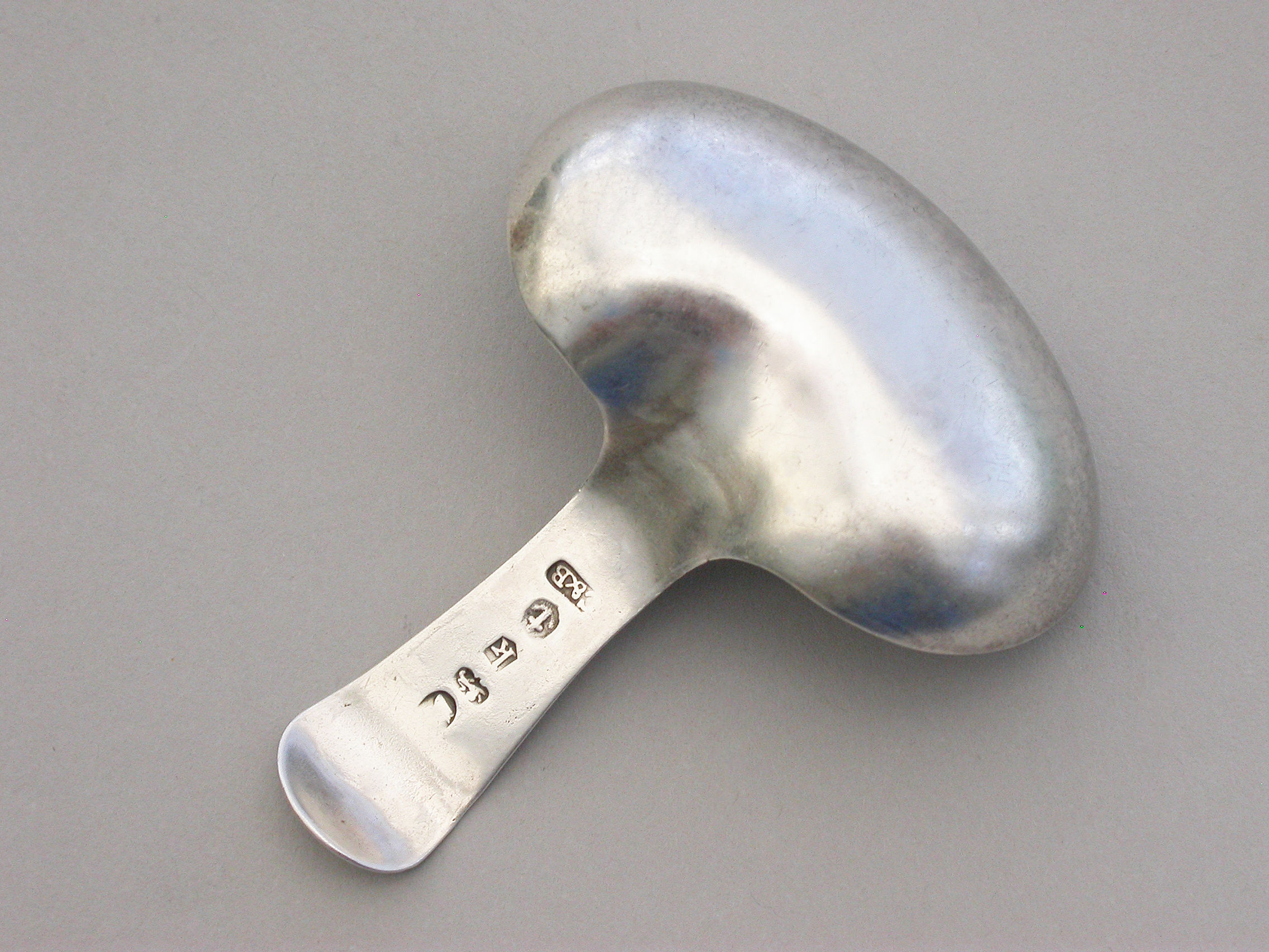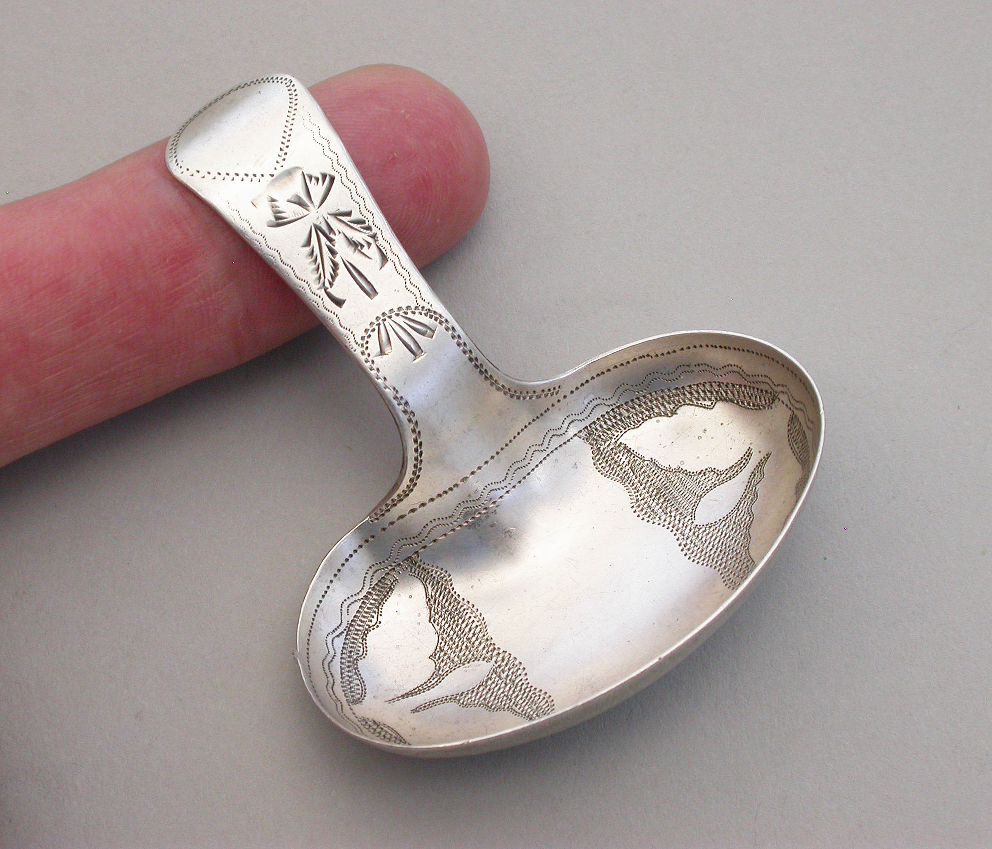 A rare George III silver Caddy Spoon, the kidney shaped bowl engraved with foliate sprigs and wriggle work borders, curved Old English handle.
