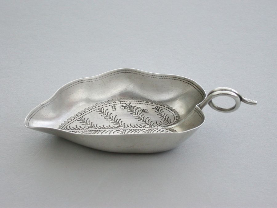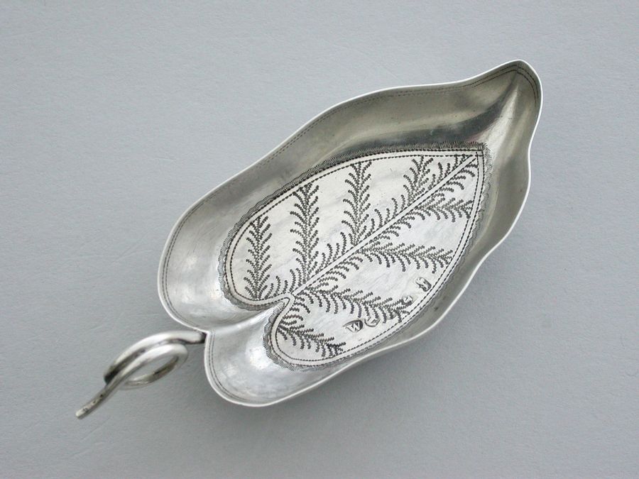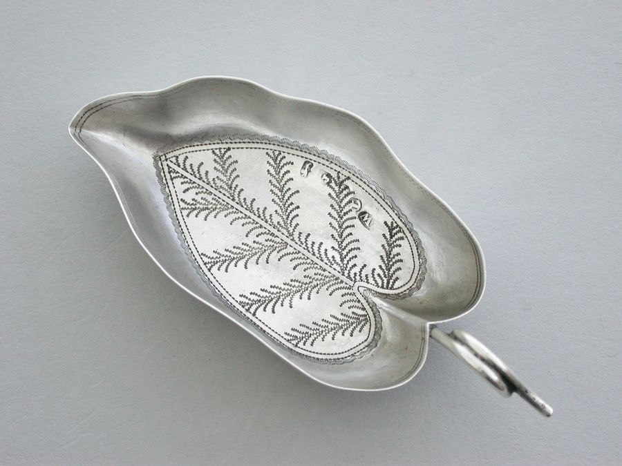 An extremely rare George III silver Caddy Spoon made in the form of a large leaf with raised wavy sides and twisted ring handle, the bowl bright-cut engraved to simulate the veins of the leaf.
