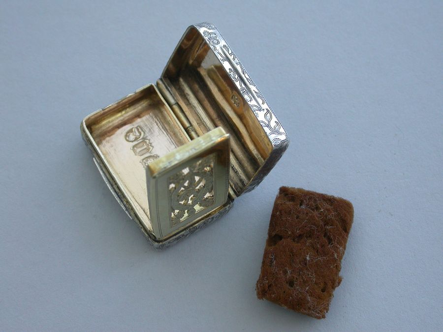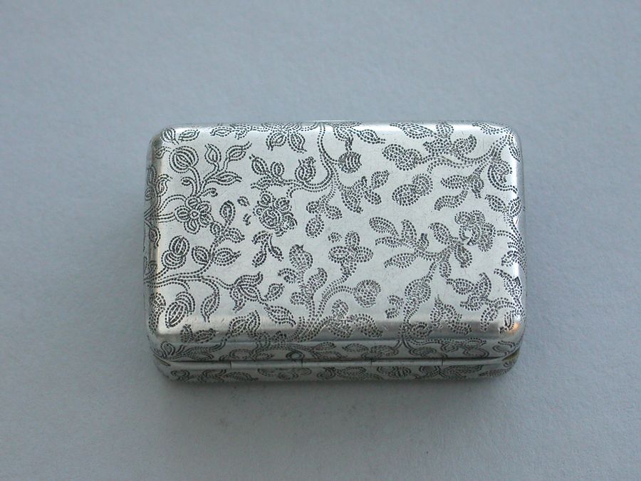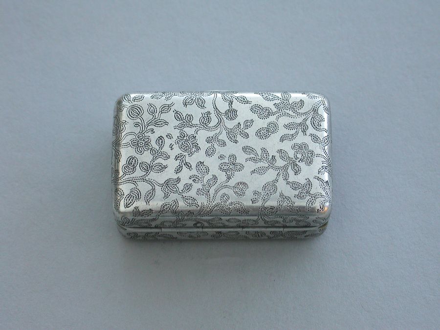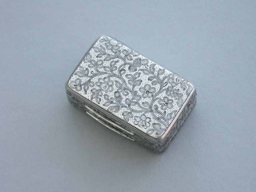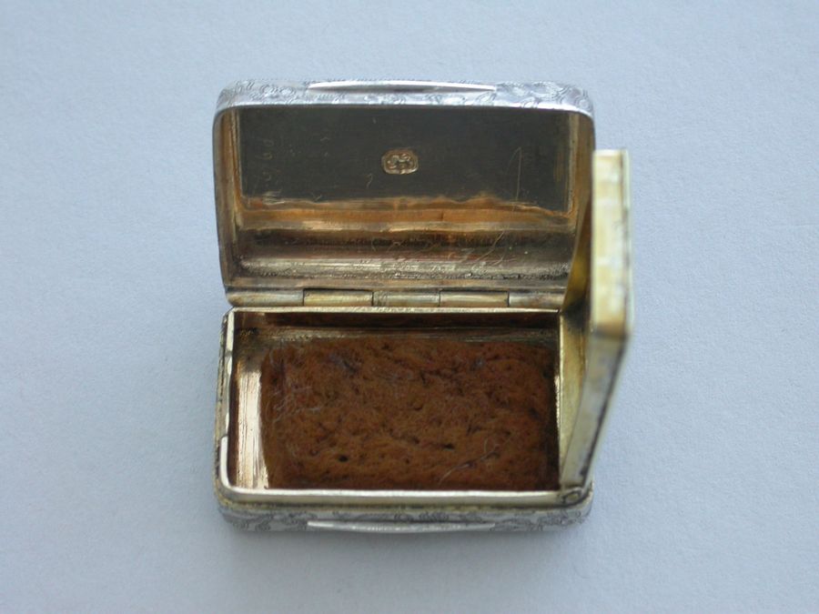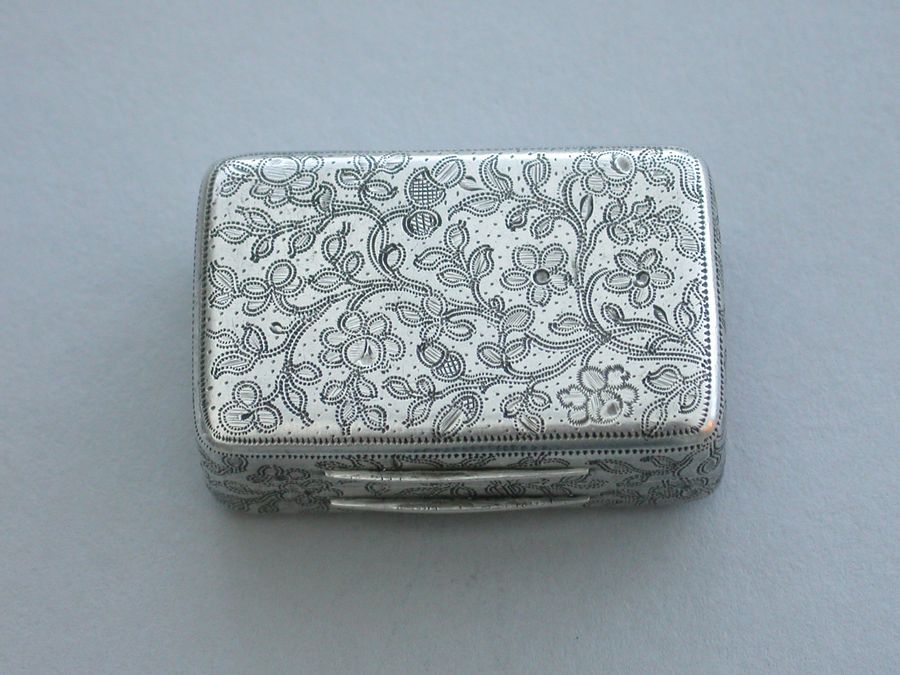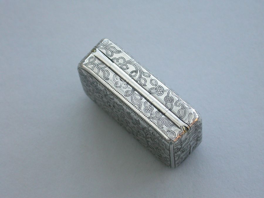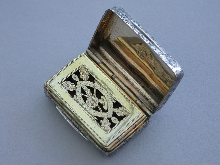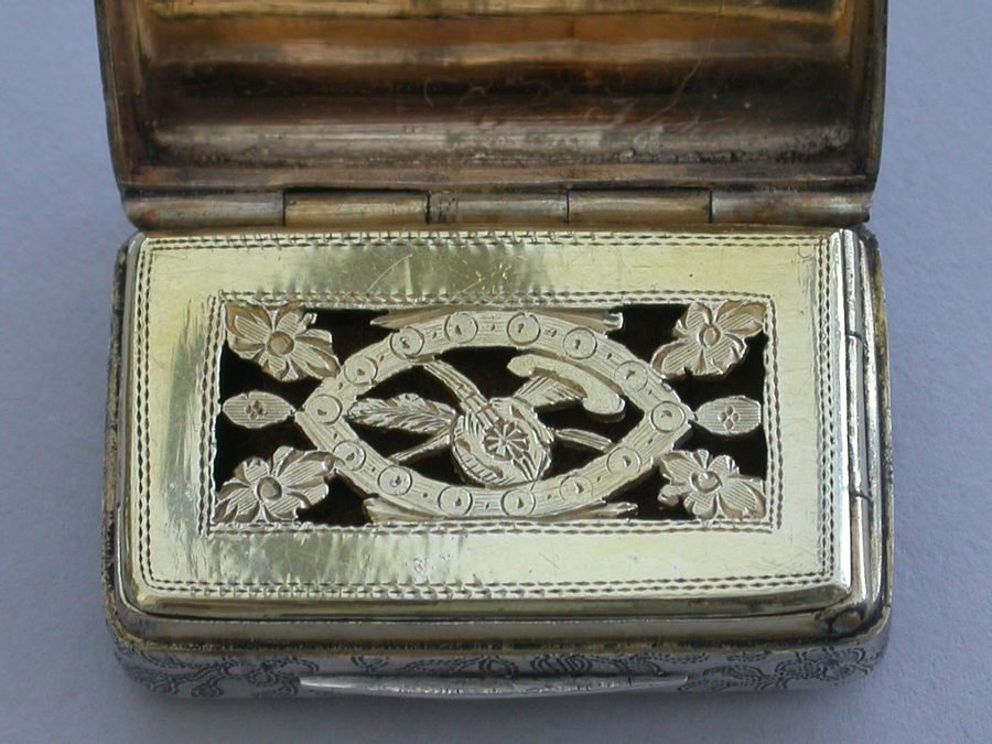 A good George III rectangular silver Vinaigrette with all-over prick-dot rose and acorn engraving, the lid with prick-dot border and plain raised thumb-piece to the base and lid. The silver gilt grille formed horizontally and engraved and cut with musical trophies within a navette frame and flower spandrels. Complete with original sponge.