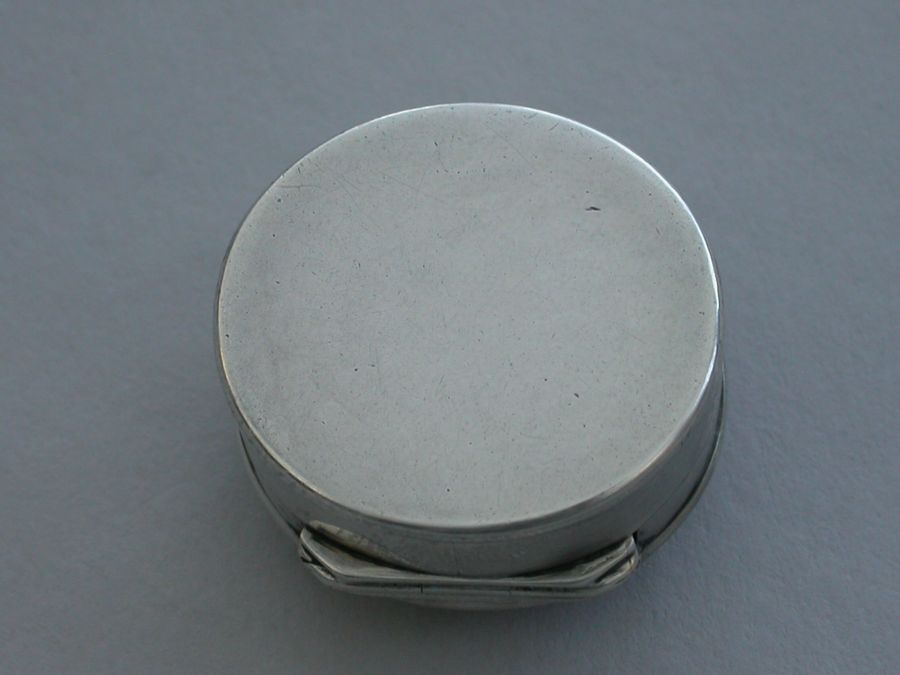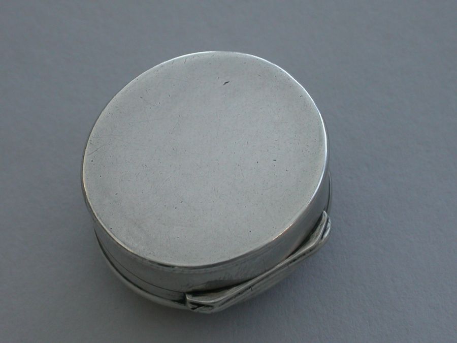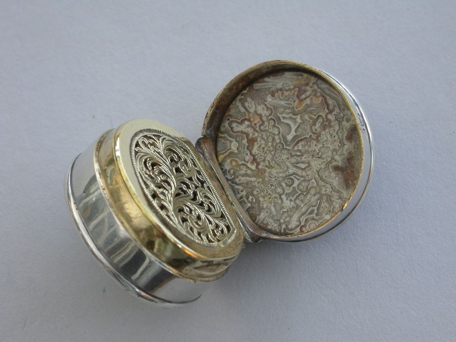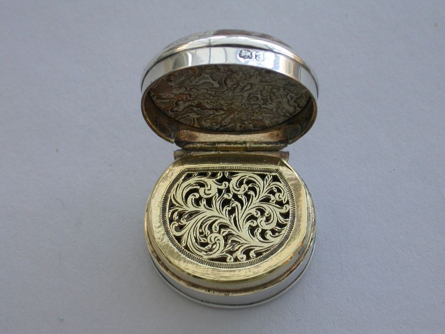 A fine quality George III silver Vinaigrette of plain oval form with three lugged stand-away hinge, the lid set with a piece of polished petrified wood. The silver gilt grille pierced with a scrolling frond within a border.
