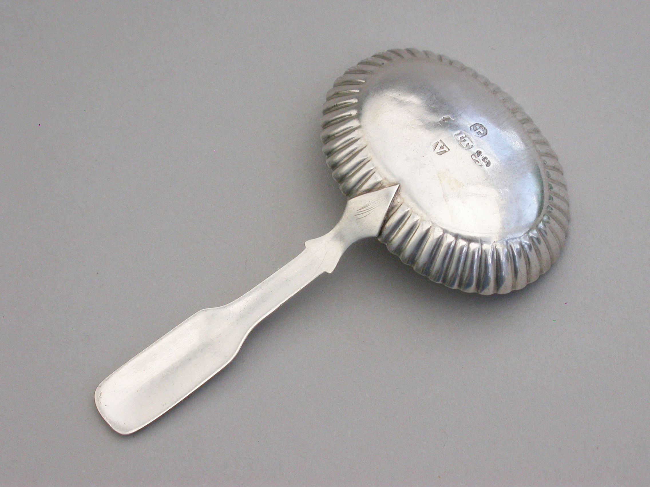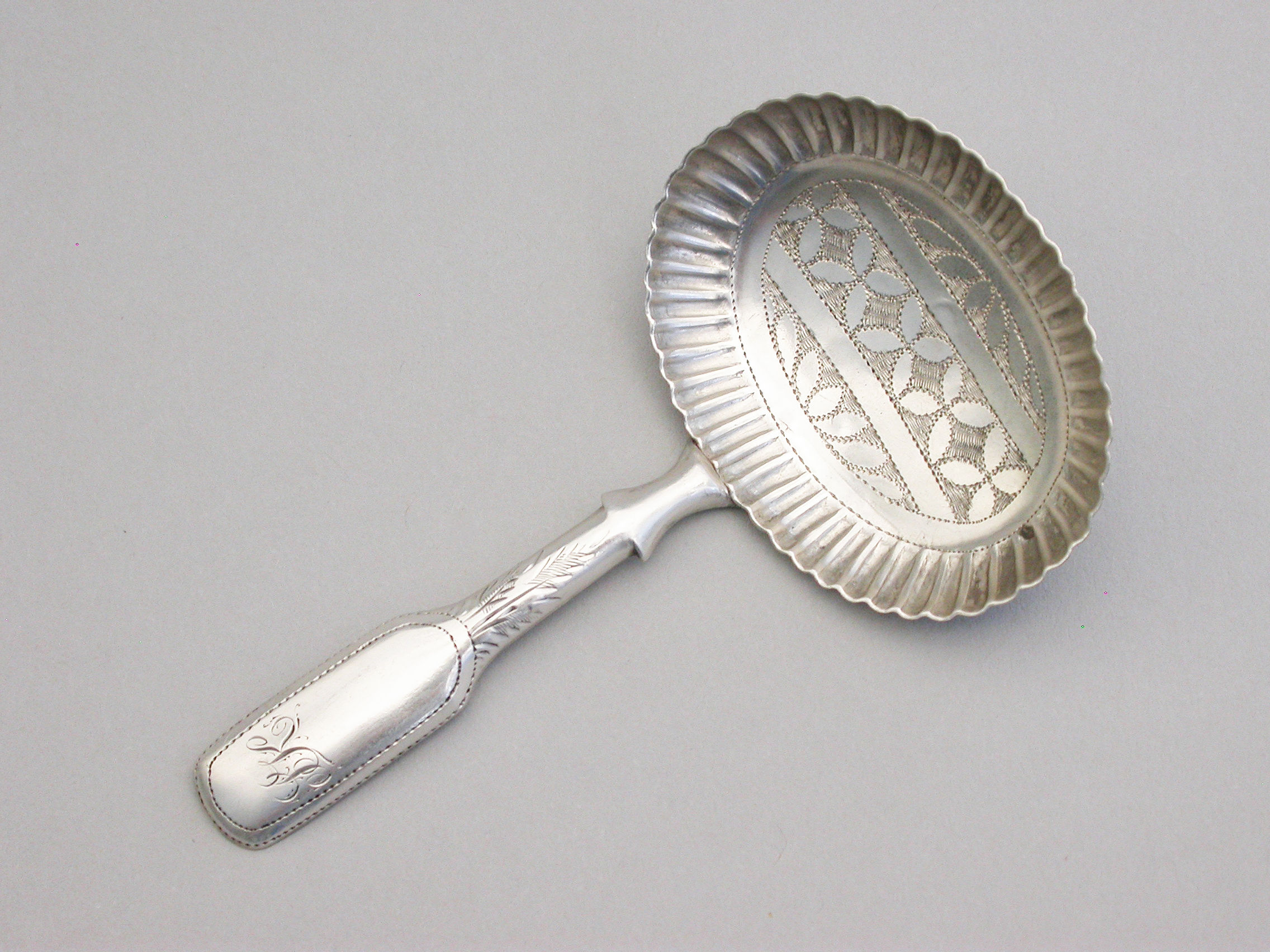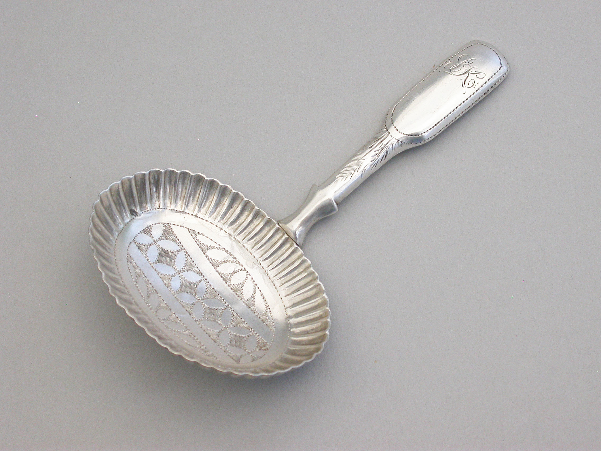 A good George III silver Caddy Spoon, the bright-cut engraved oval bowl with pie crust border, the hollow fiddle pattern handle with shoulders.