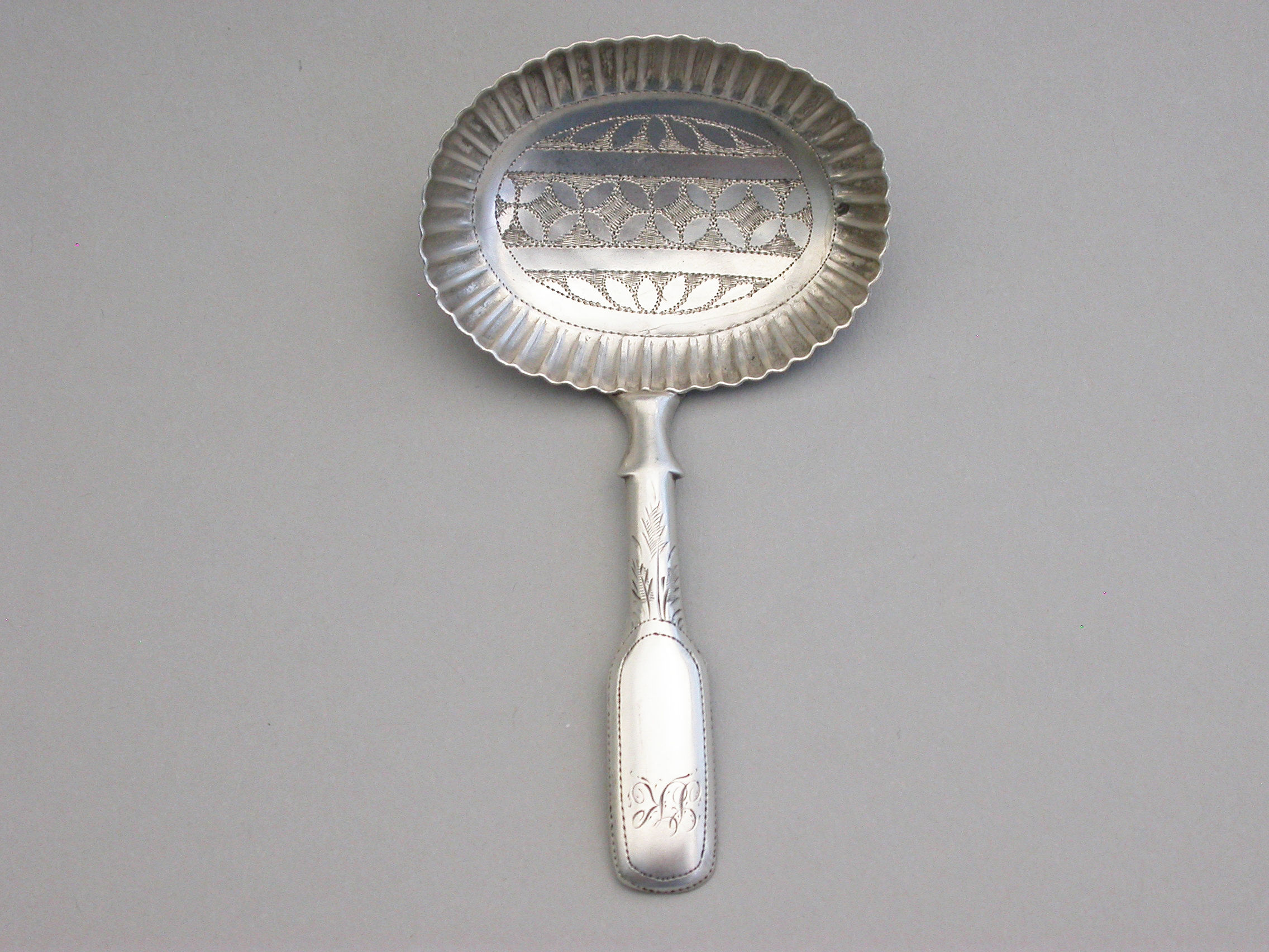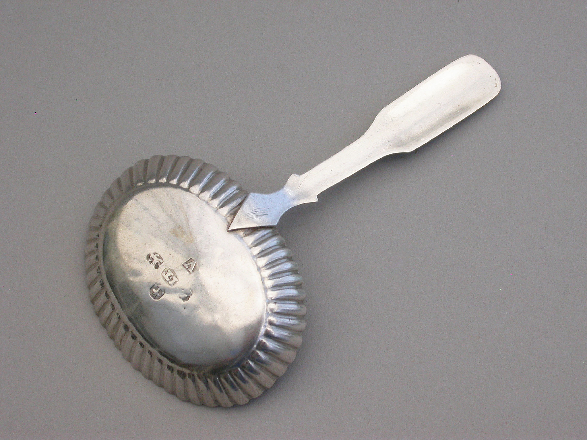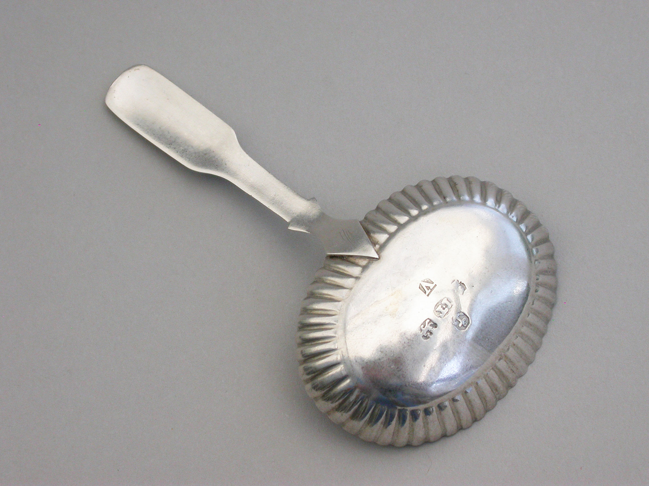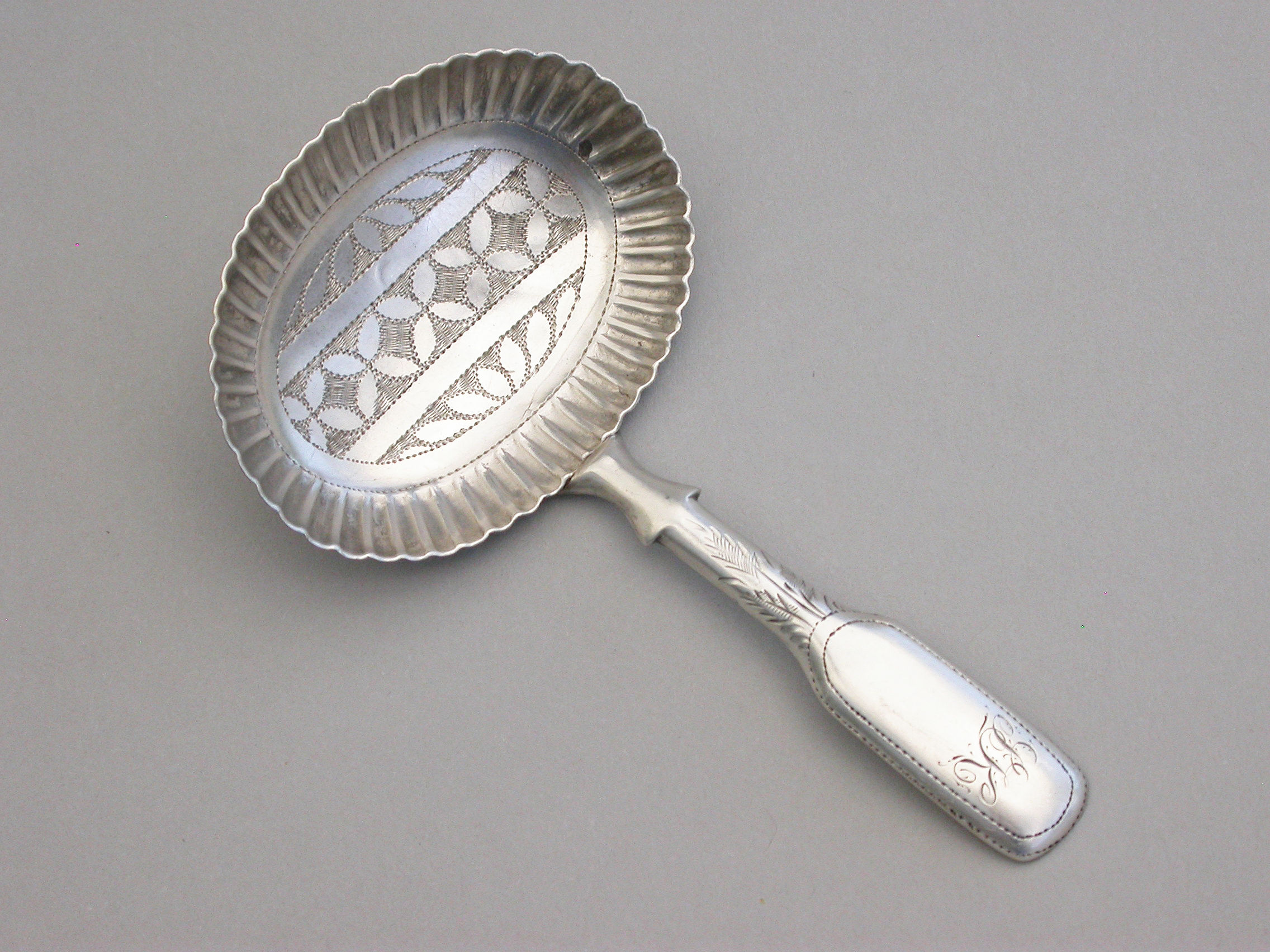 A good George III silver Caddy Spoon, the bright-cut engraved oval bowl with pie crust border, the hollow fiddle pattern handle with shoulders.