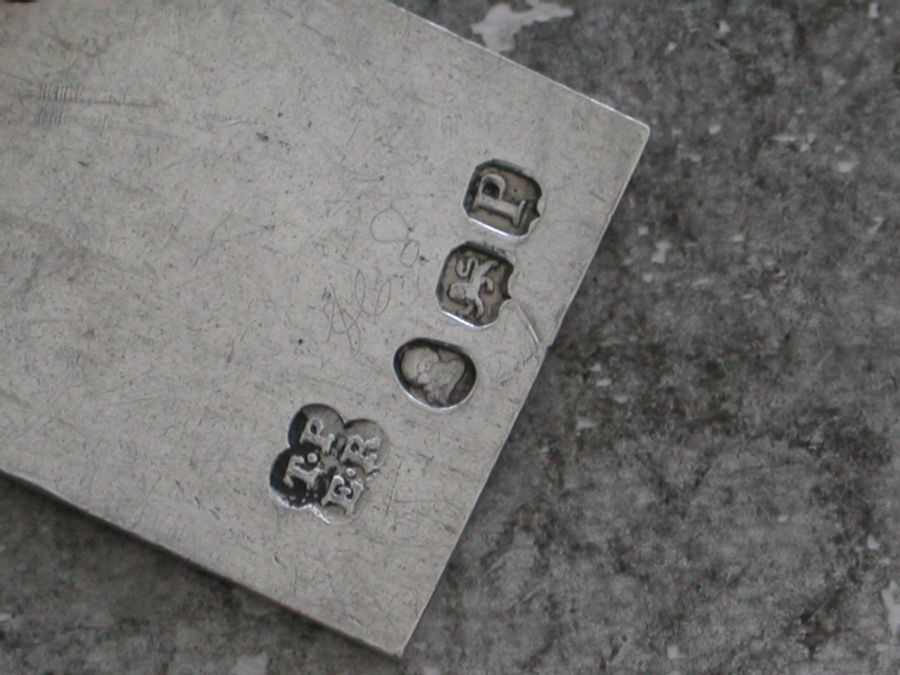 A good George III silver Wine Label of rectangular 'postage stamp' form, with double reeded border, incised and niello filled with a capital letter 'R' (for Rum).
