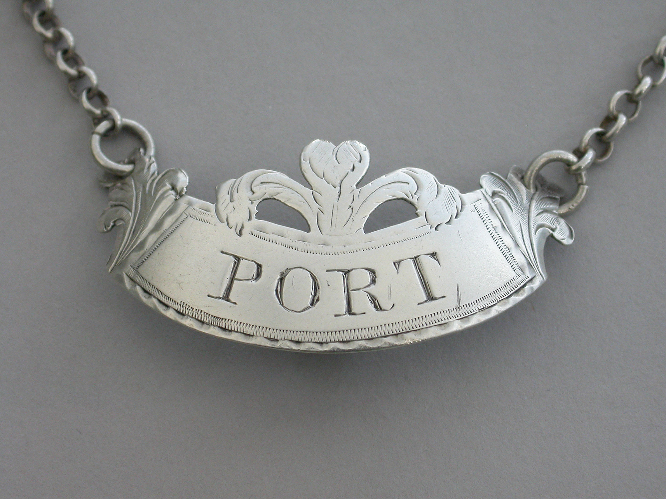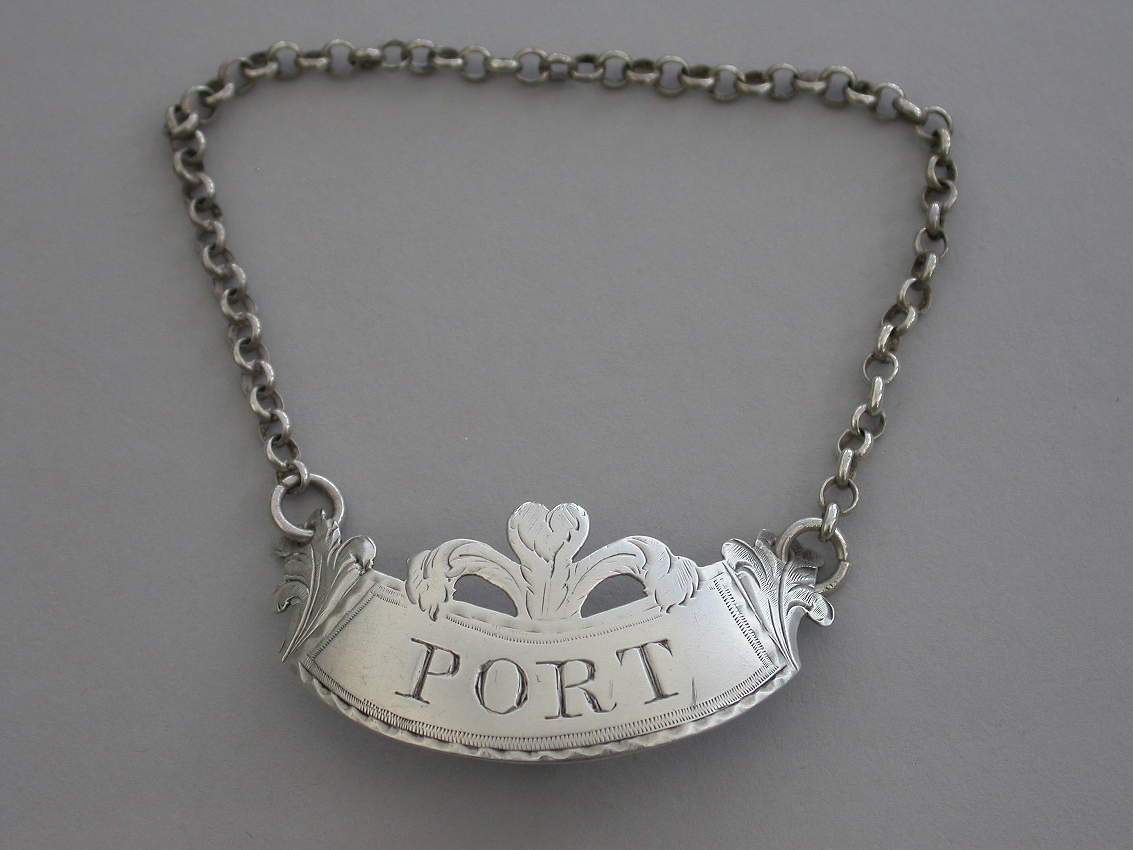 A good George III silver Wine Label of ""Prince of Wales Feathers"" form, featuring a plume of three ostrich feathers above a bright-cut engraved curved narrow rectangular label with engraved foliate feathered ends, incised for Port.
