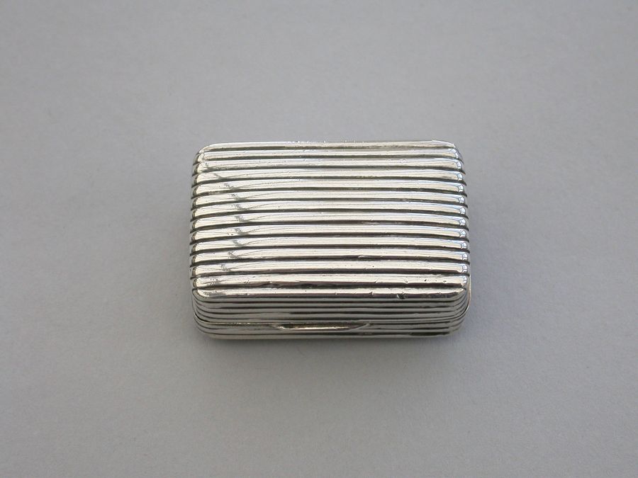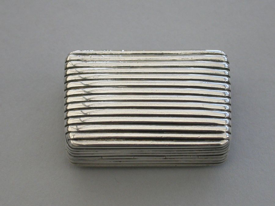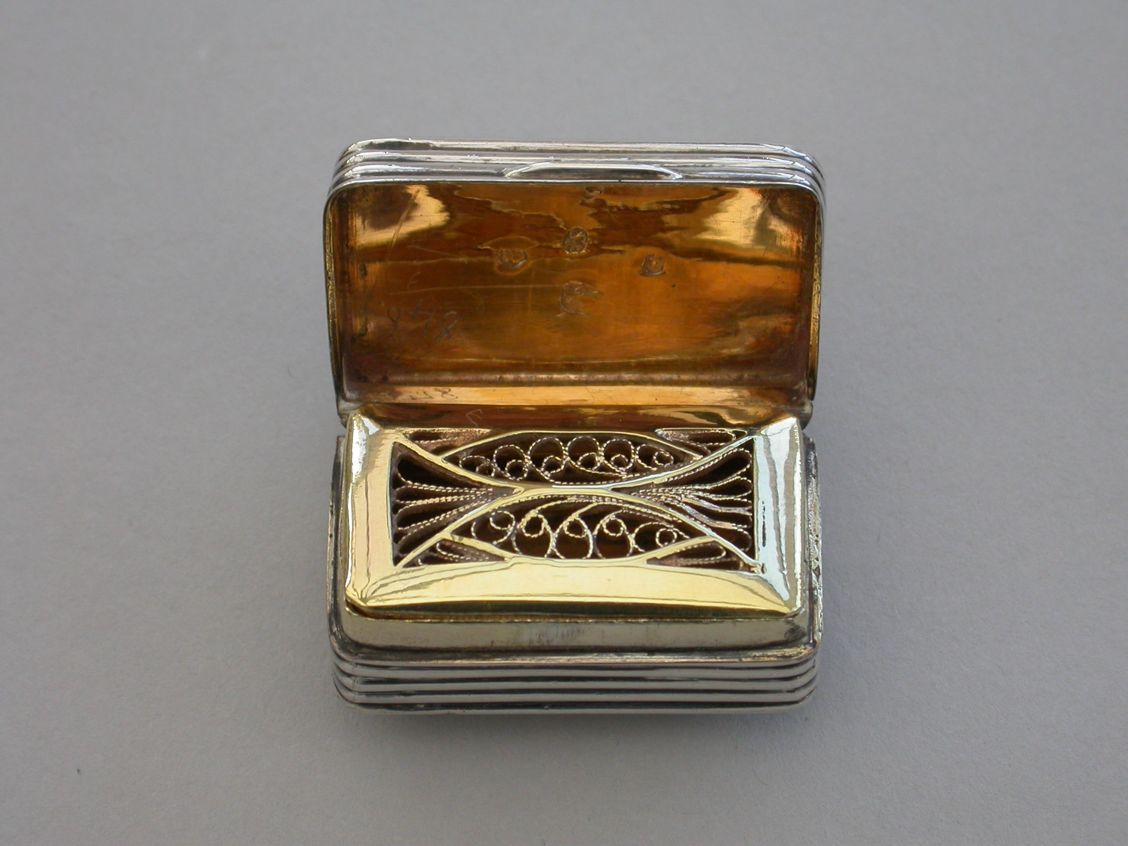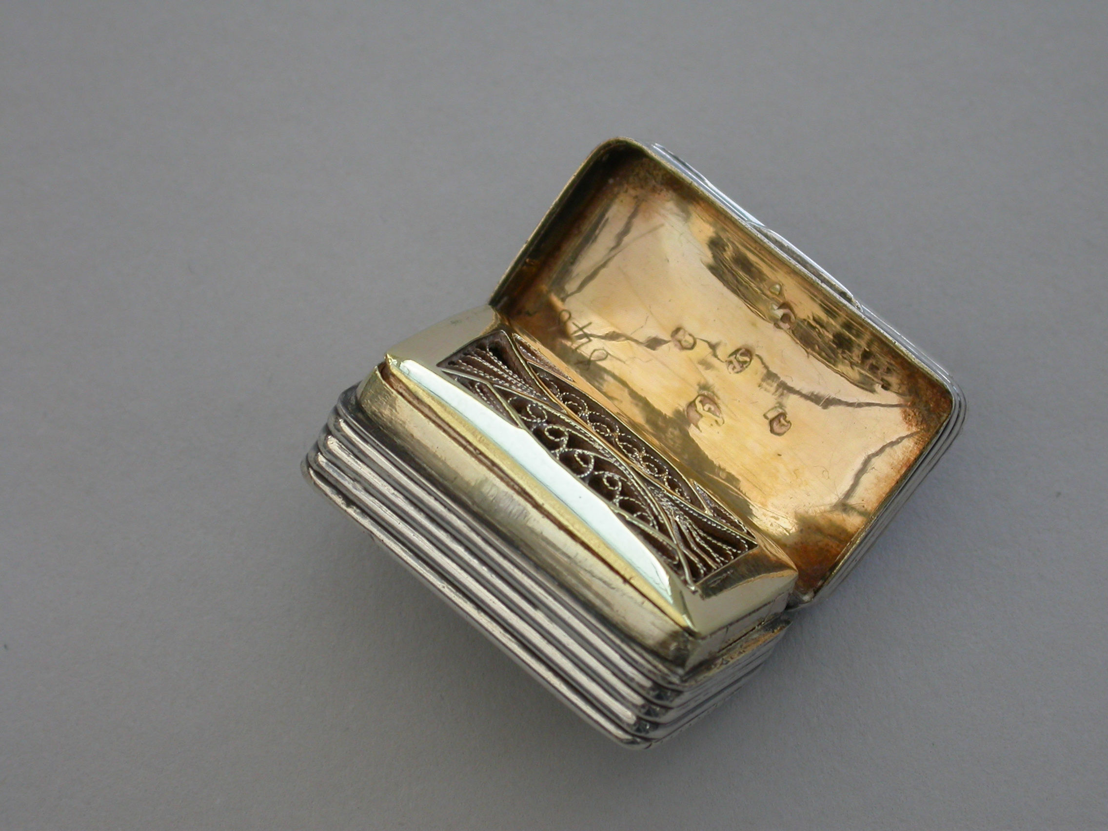 A good George III silver Vinaigrette of deep reeded rectangular form, the silver gilt filigree grille of unusual segmented design formed horizontally.