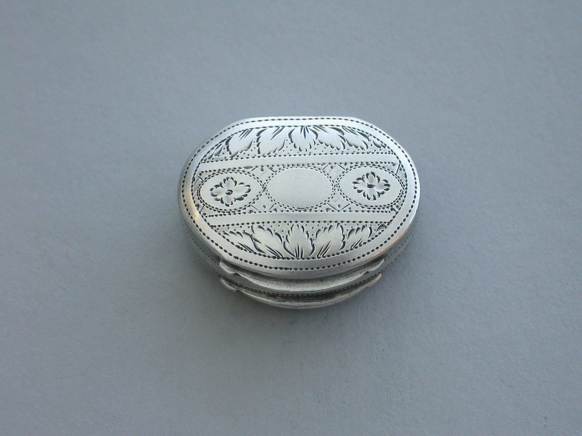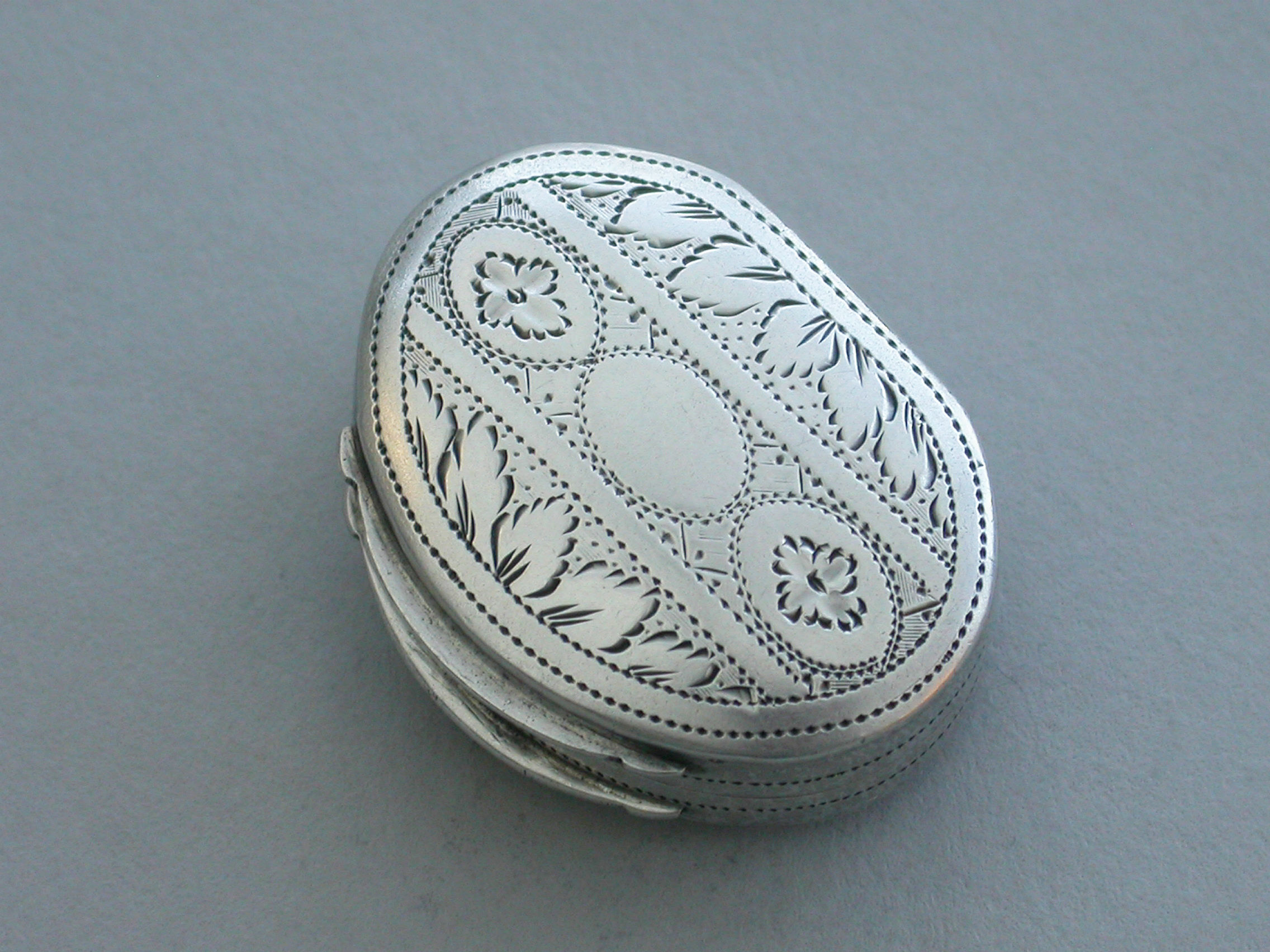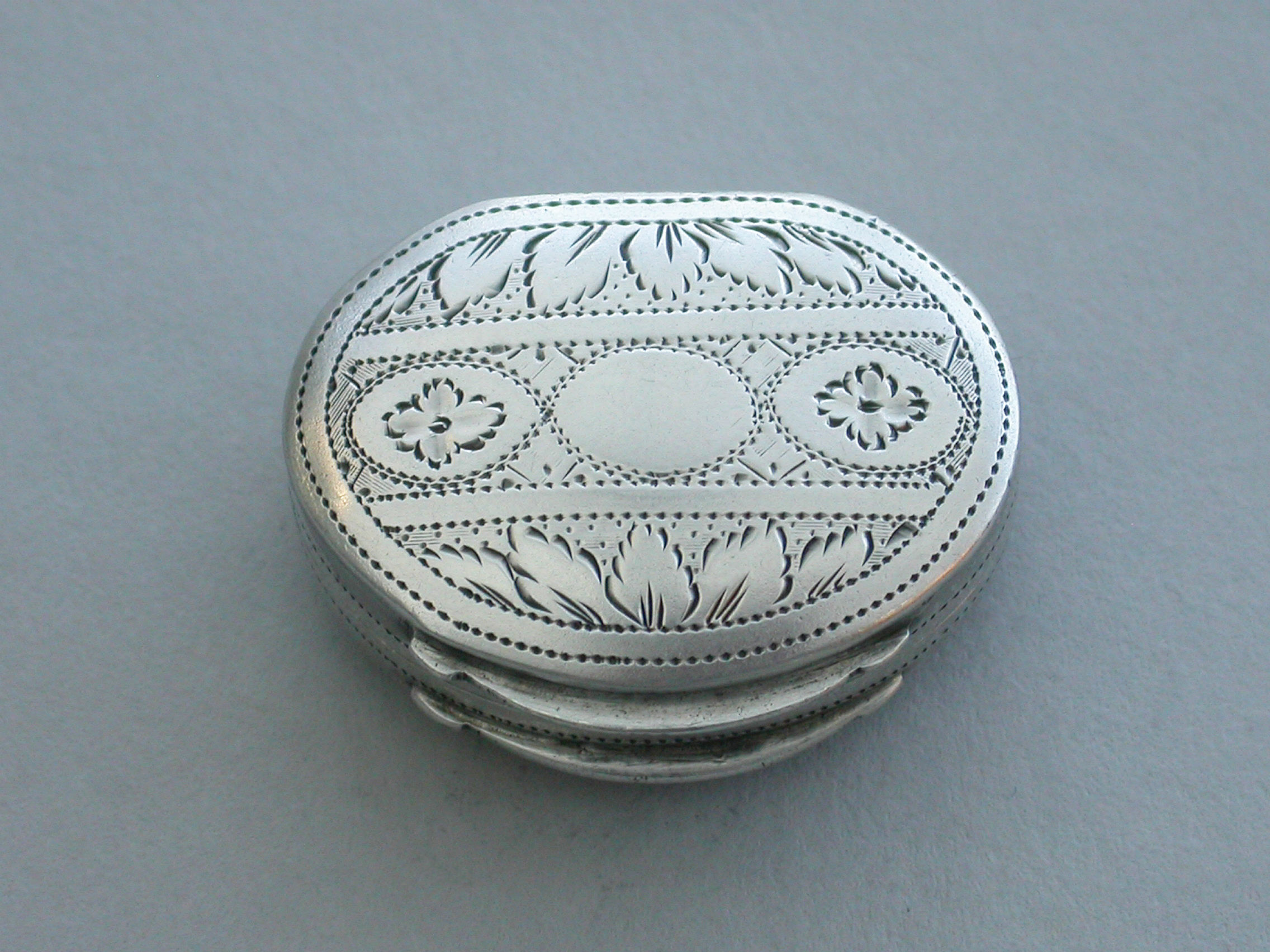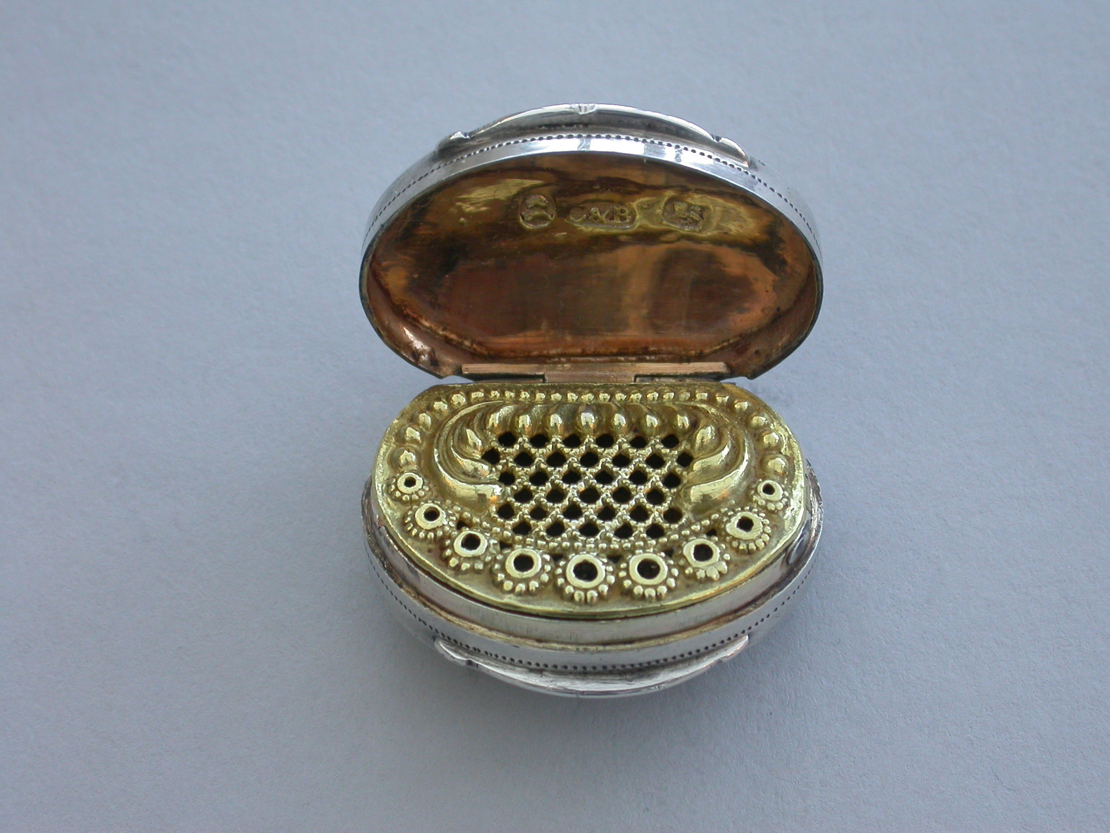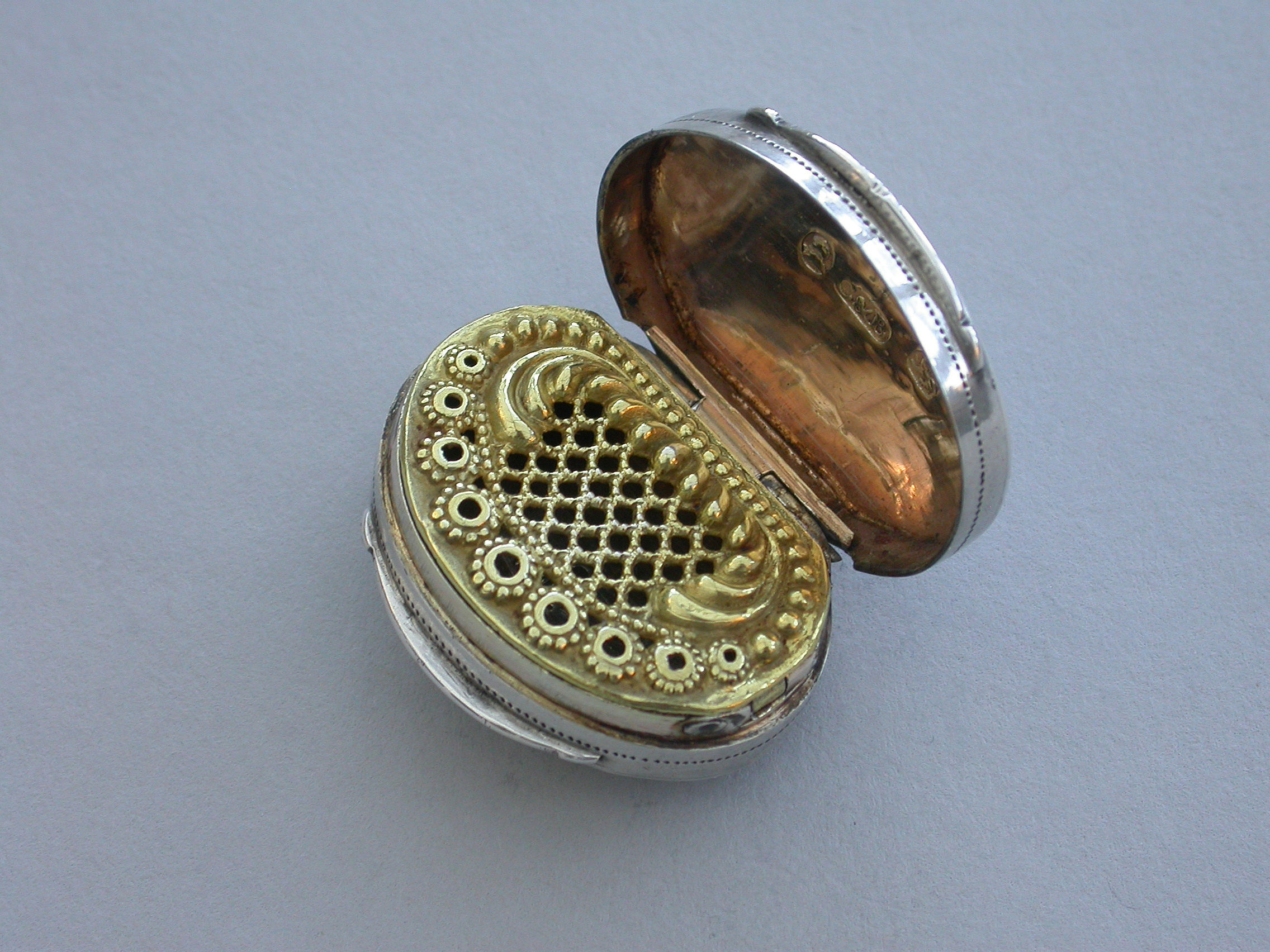 A good George III silver Vinaigrette of oval form, the cover with bright cut engraved design of leaves and flowers in bands, the unusual silver gilt repousse grille with simulated filigree centre below a stylised anthemion.