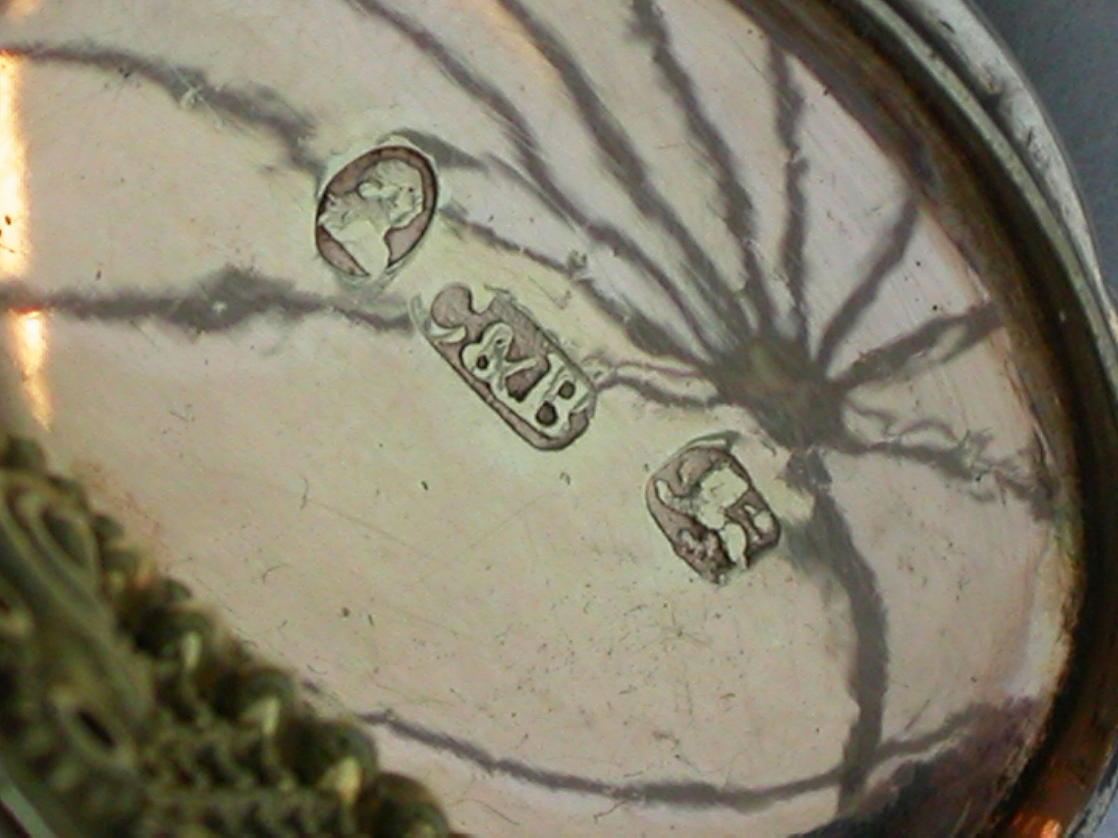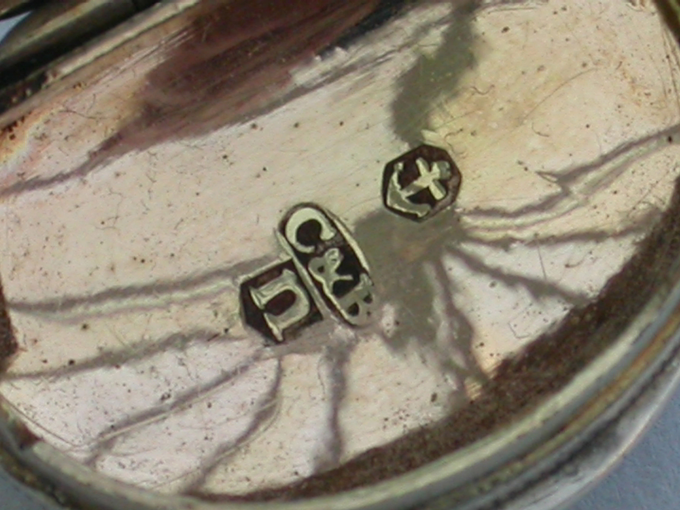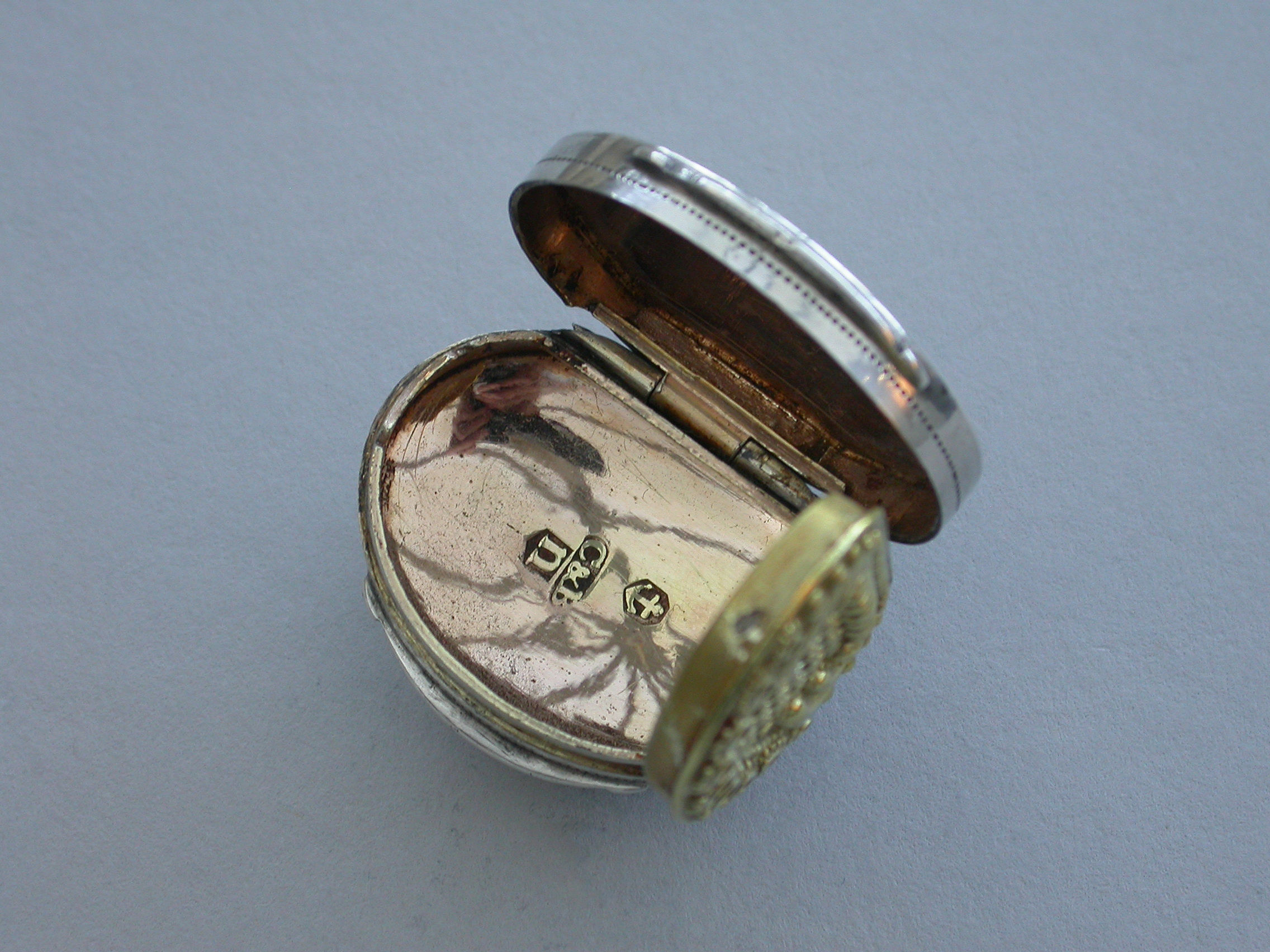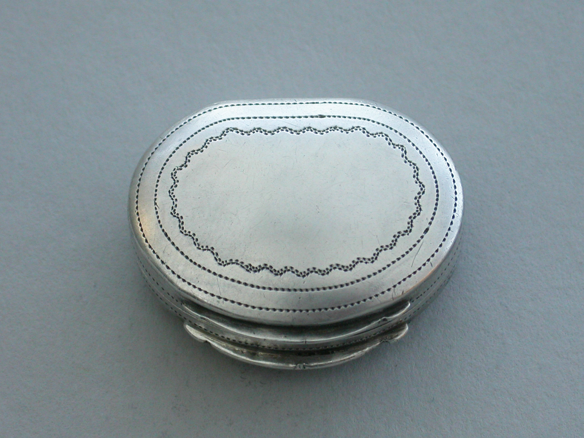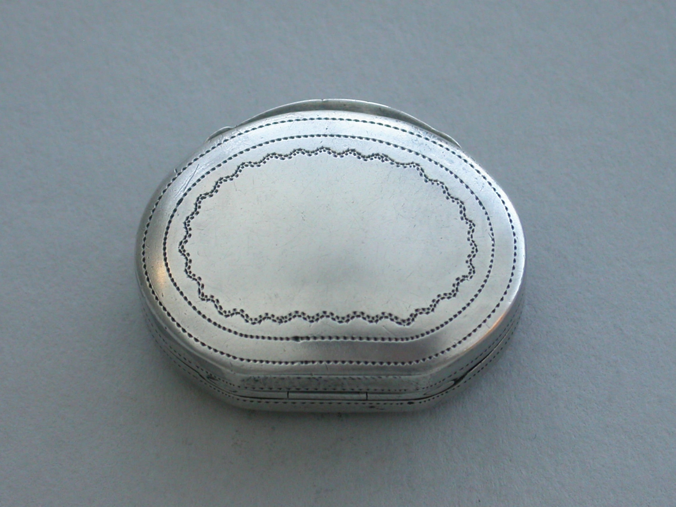 A good George III silver Vinaigrette of oval form, the cover with bright cut engraved design of leaves and flowers in bands, the unusual silver gilt repousse grille with simulated filigree centre below a stylised anthemion.