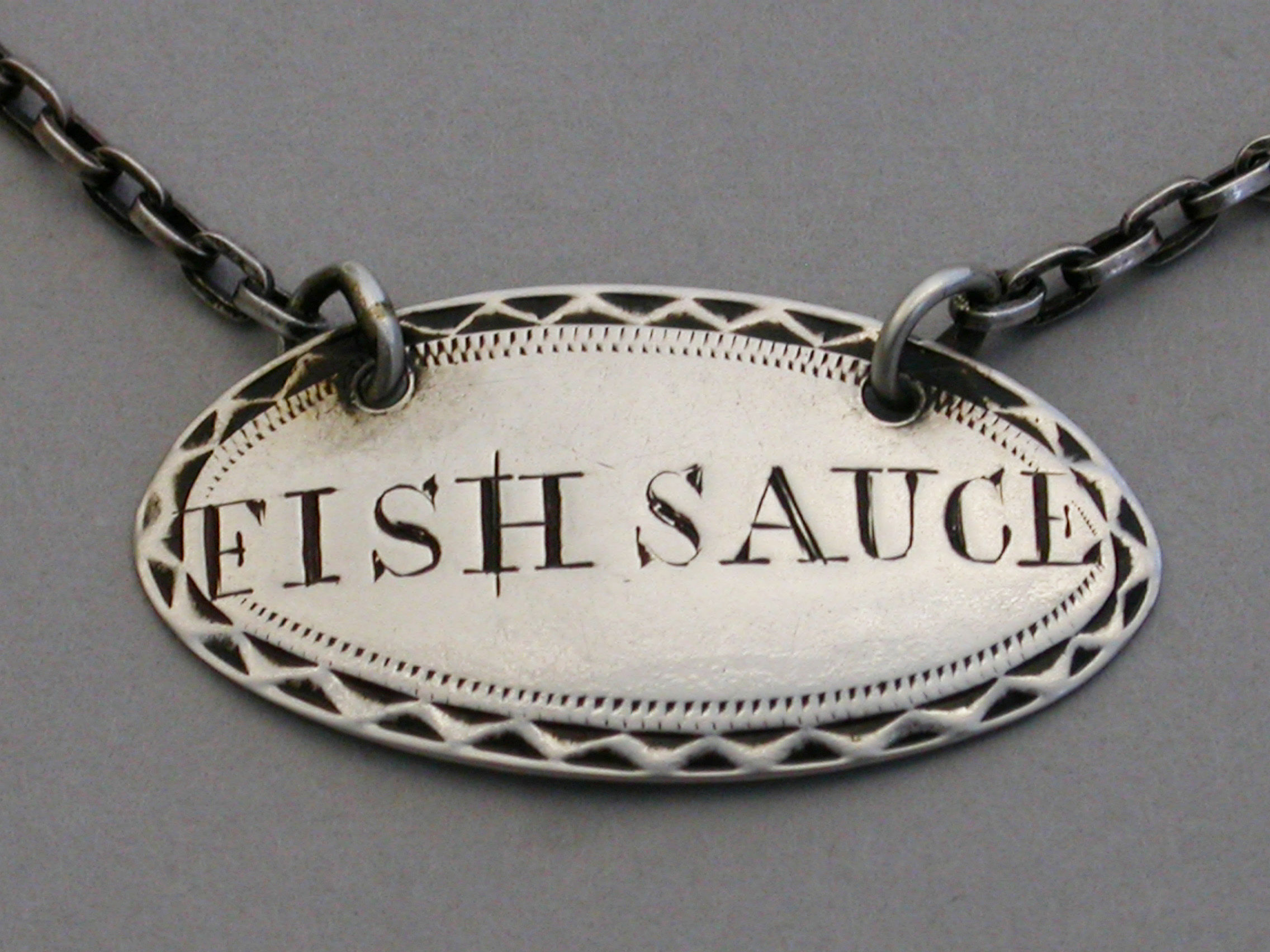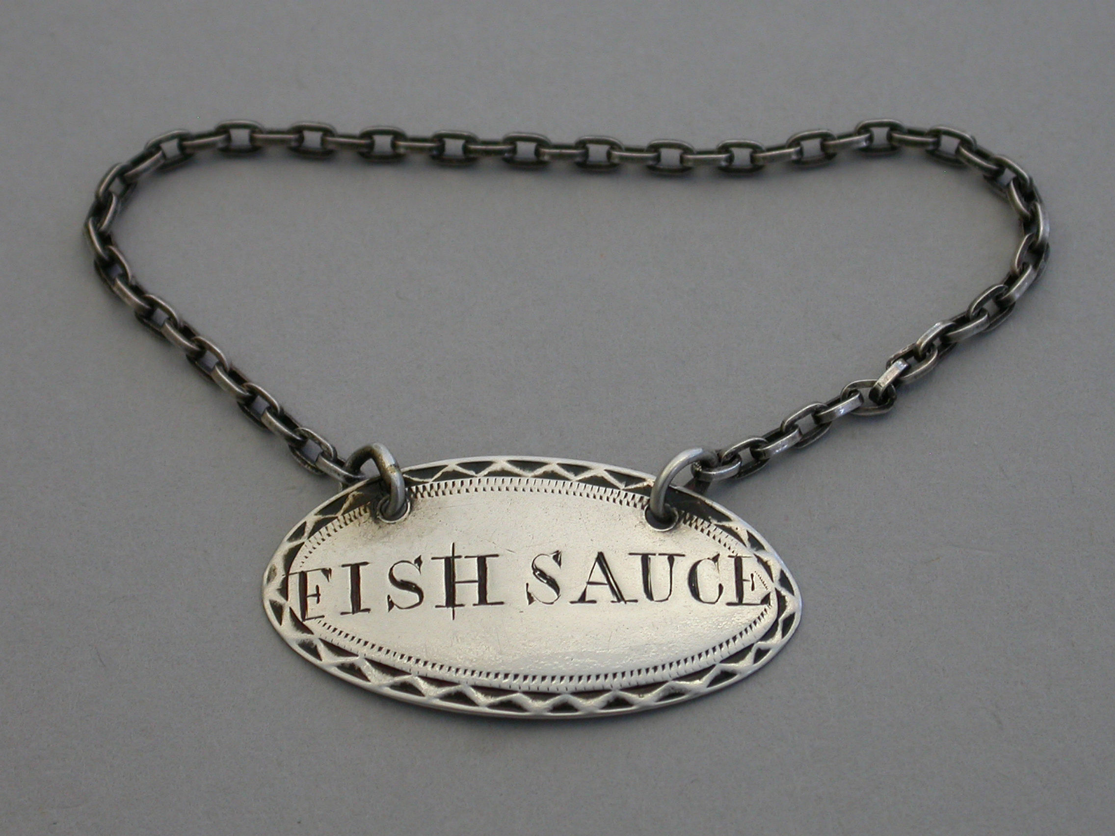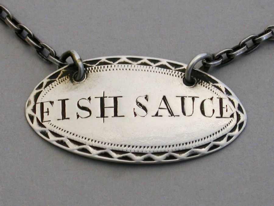 A rare George III silver Sauce Label of oval form with bright-cut engraved border, incised for FISH-SAUCE.