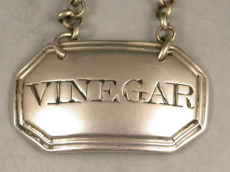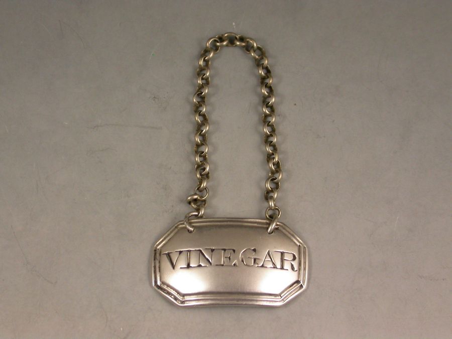 A rare George III silver Sauce Label of cut-cornered rectangular form with double reeded border, incised for Vinegar.
