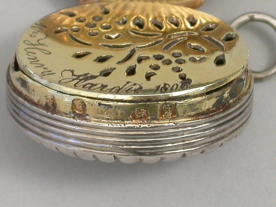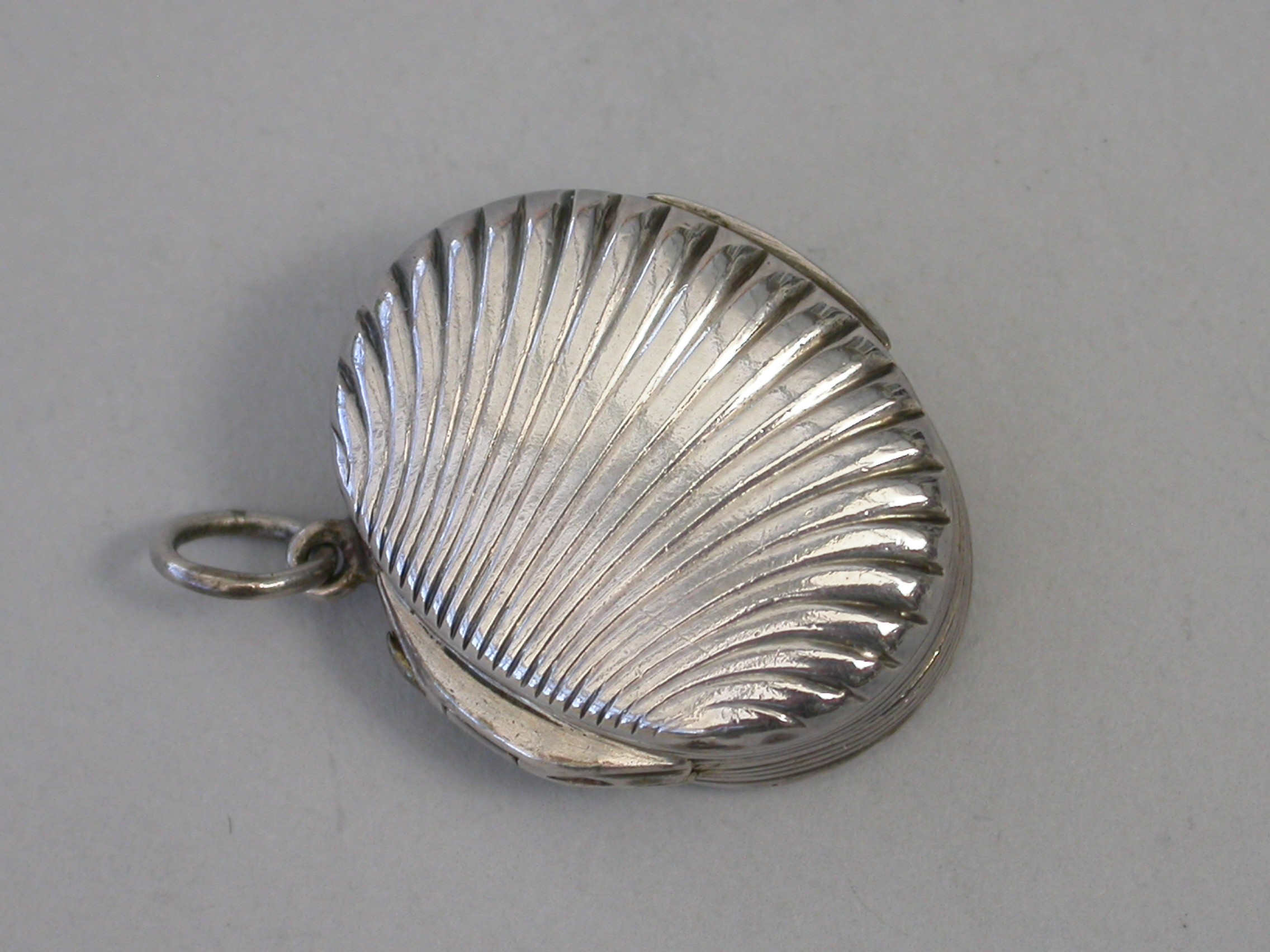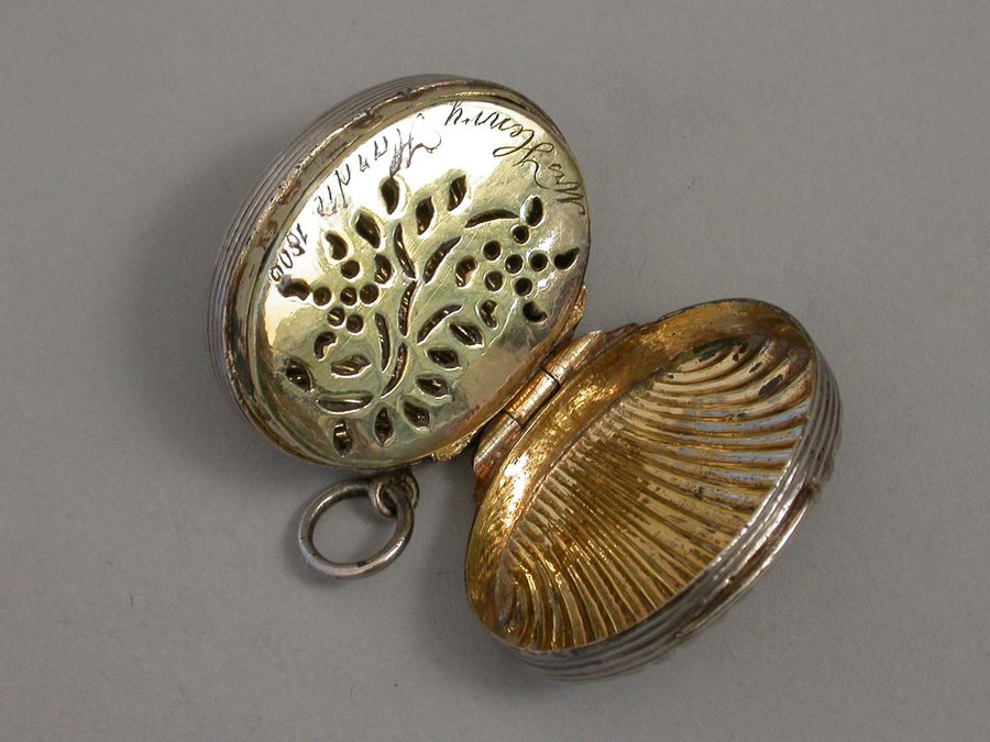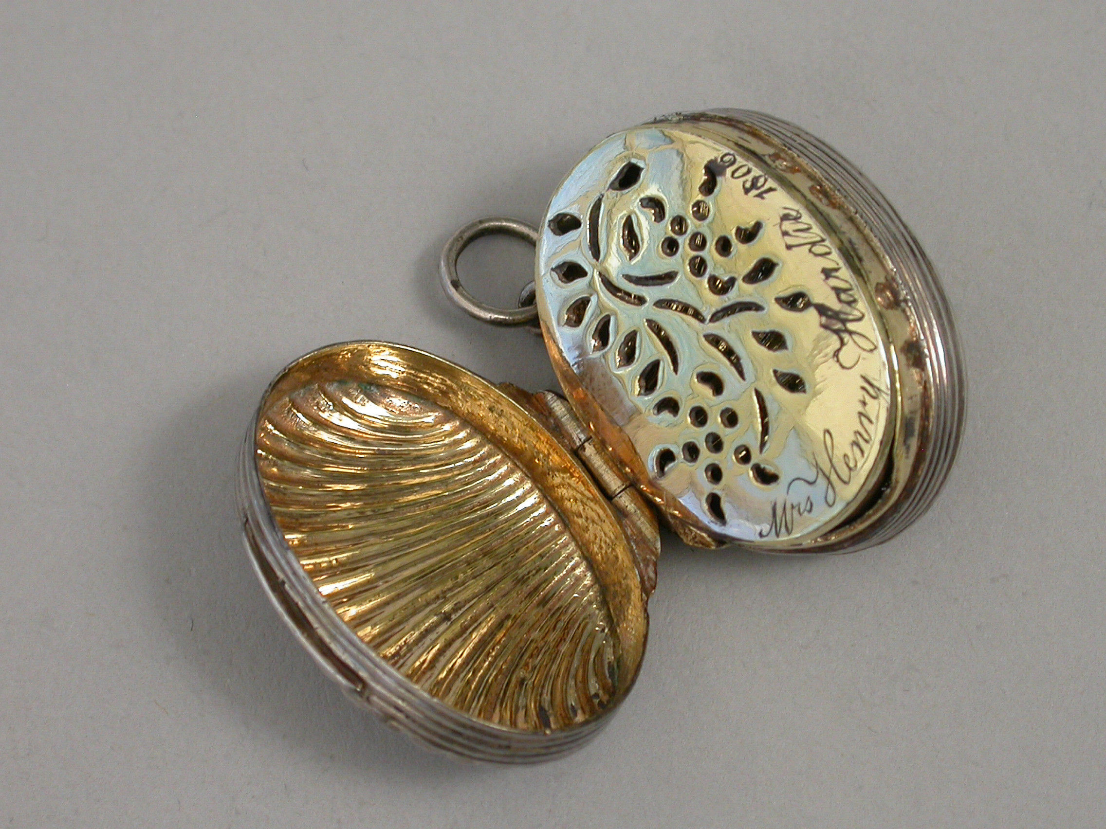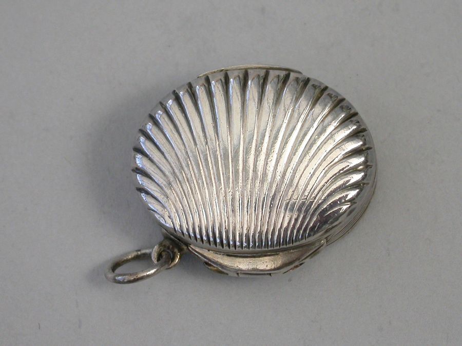 A George III silver Vinaigrette made in the form of a scallop shell, with stand-away hinge and ring attachment, the fluted shells with reeded rims, the silver gilt grille pierced with a flower spray and engraved with contemporary inscription - ""Mrs Henry Hardie 1806"".