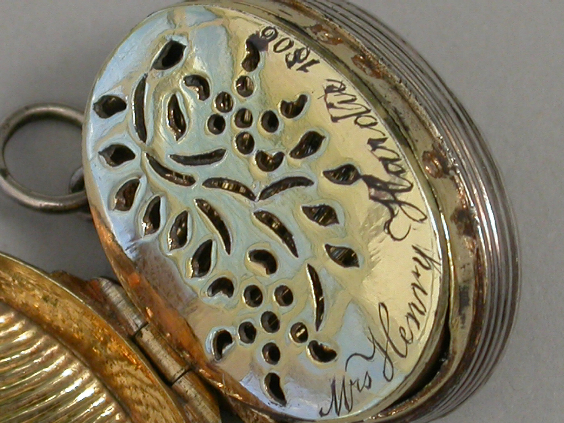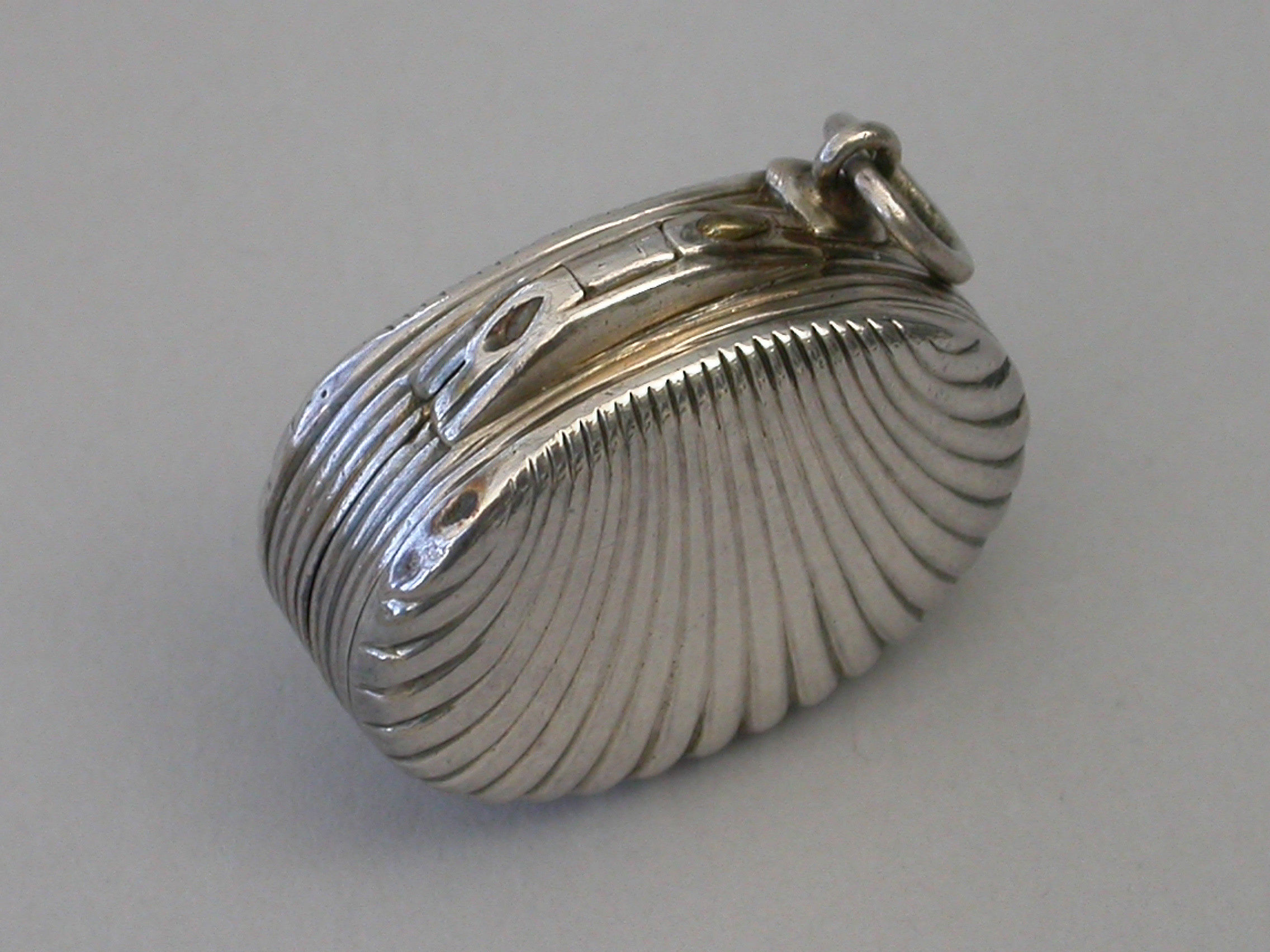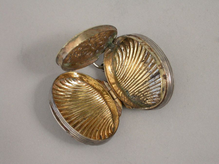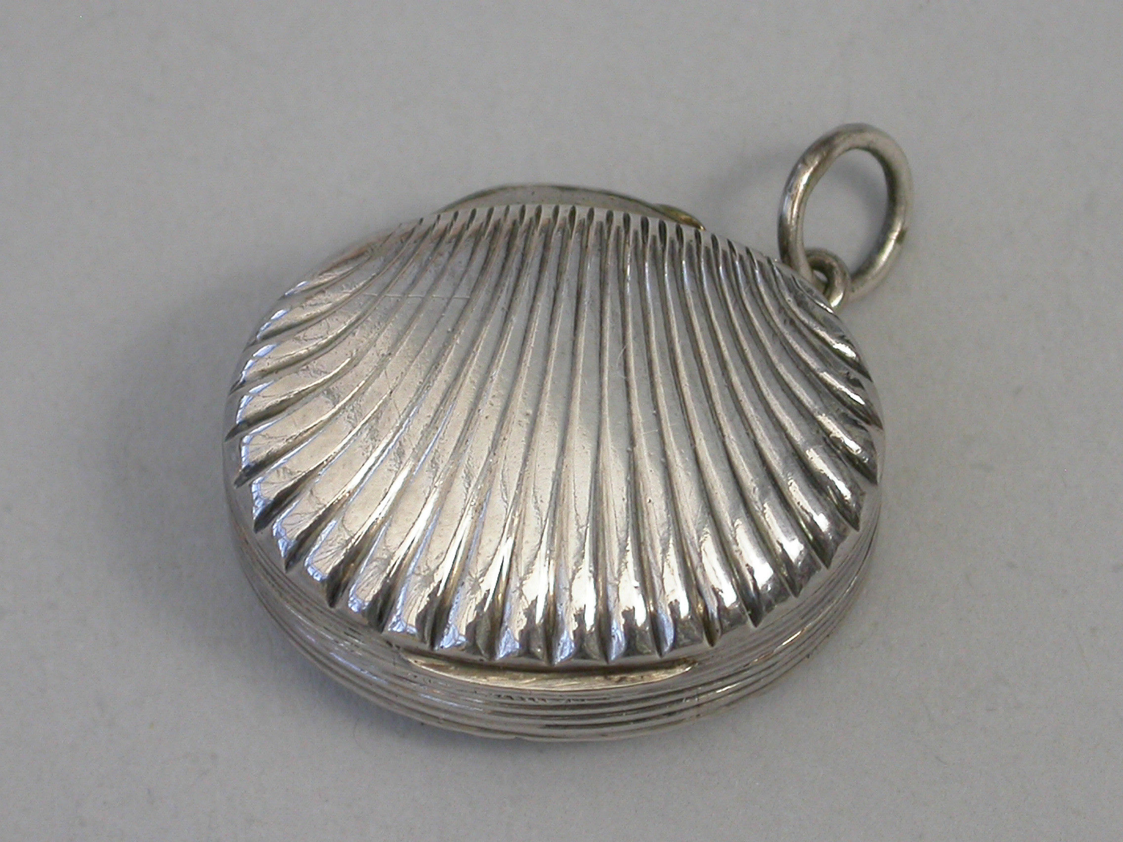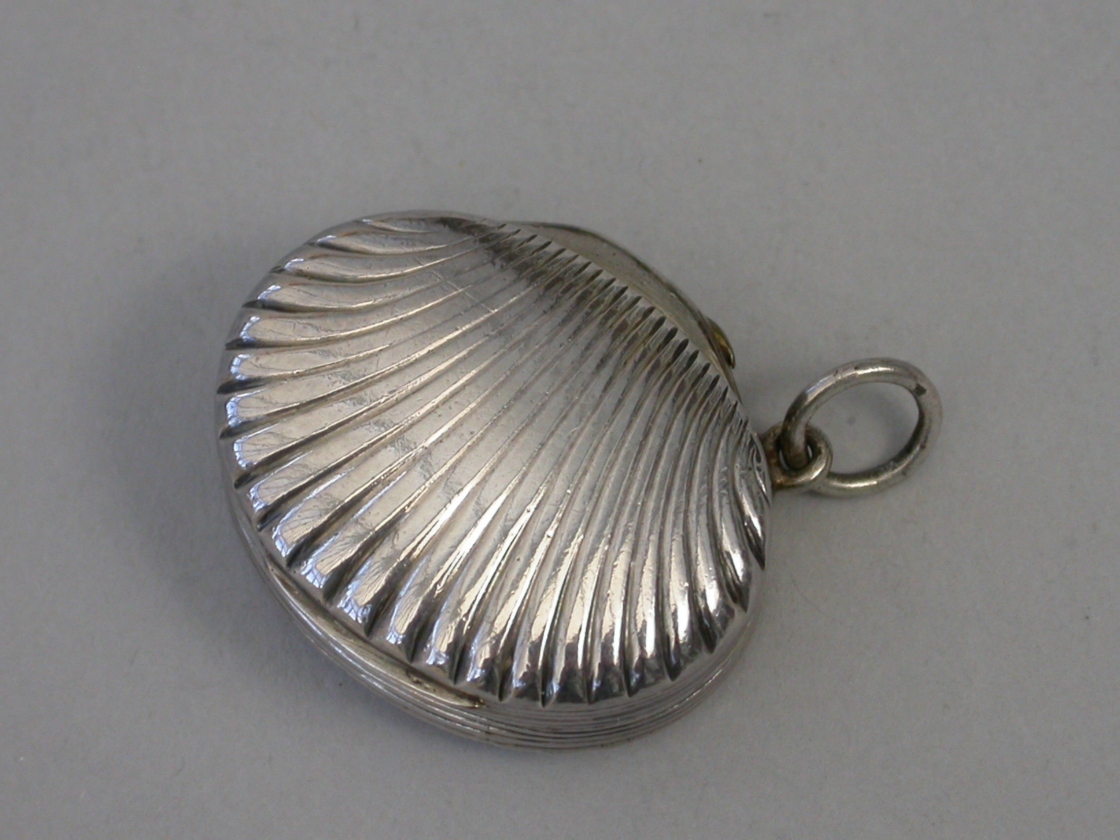 A George III silver Vinaigrette made in the form of a scallop shell, with stand-away hinge and ring attachment, the fluted shells with reeded rims, the silver gilt grille pierced with a flower spray and engraved with contemporary inscription - ""Mrs Henry Hardie 1806"".