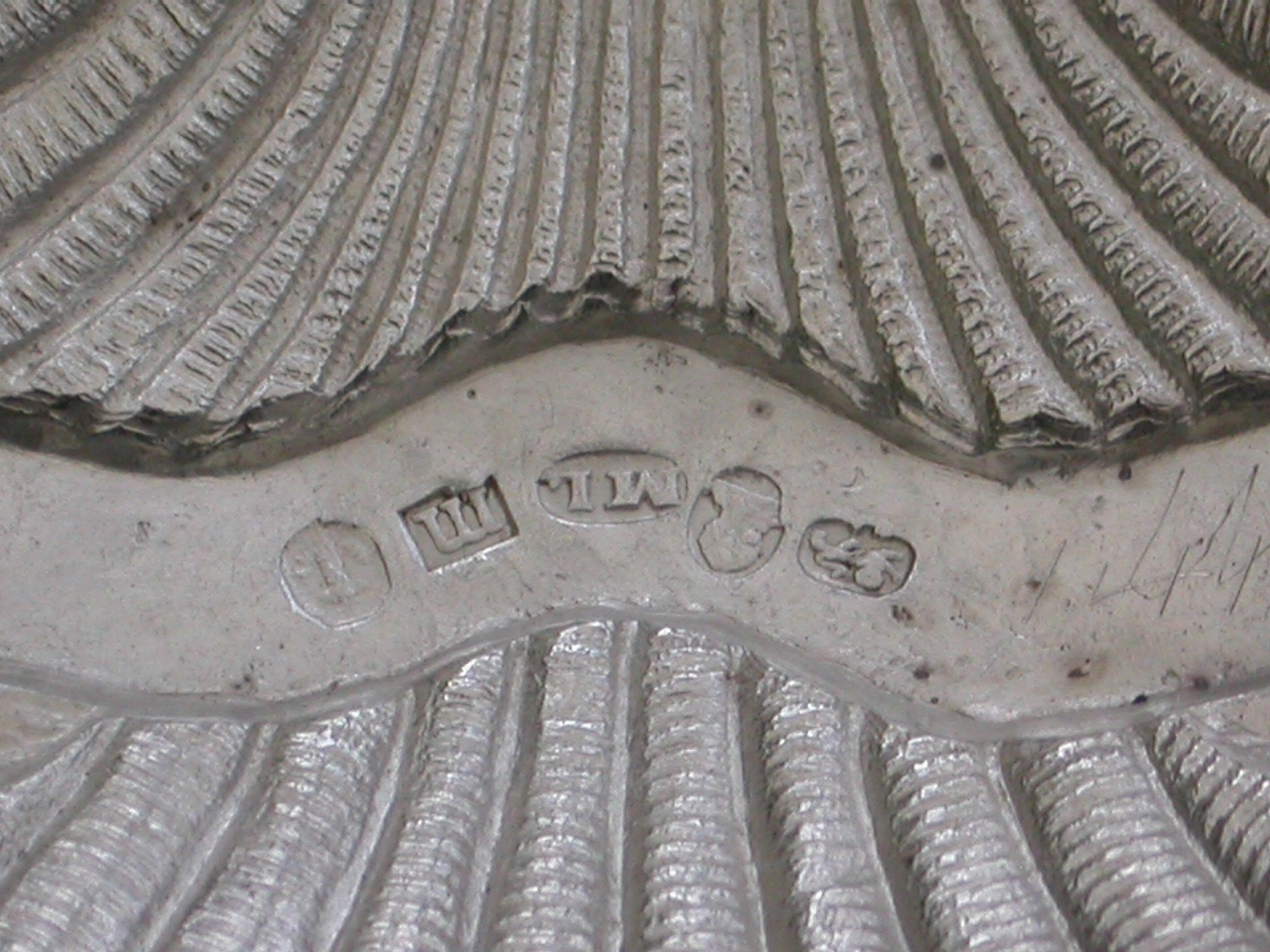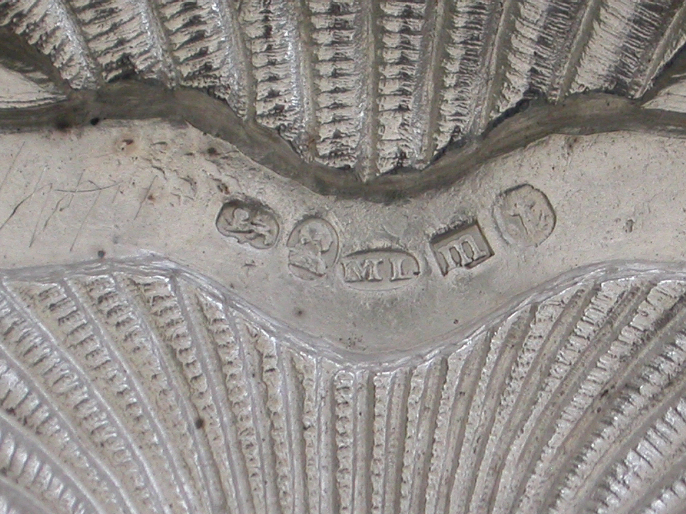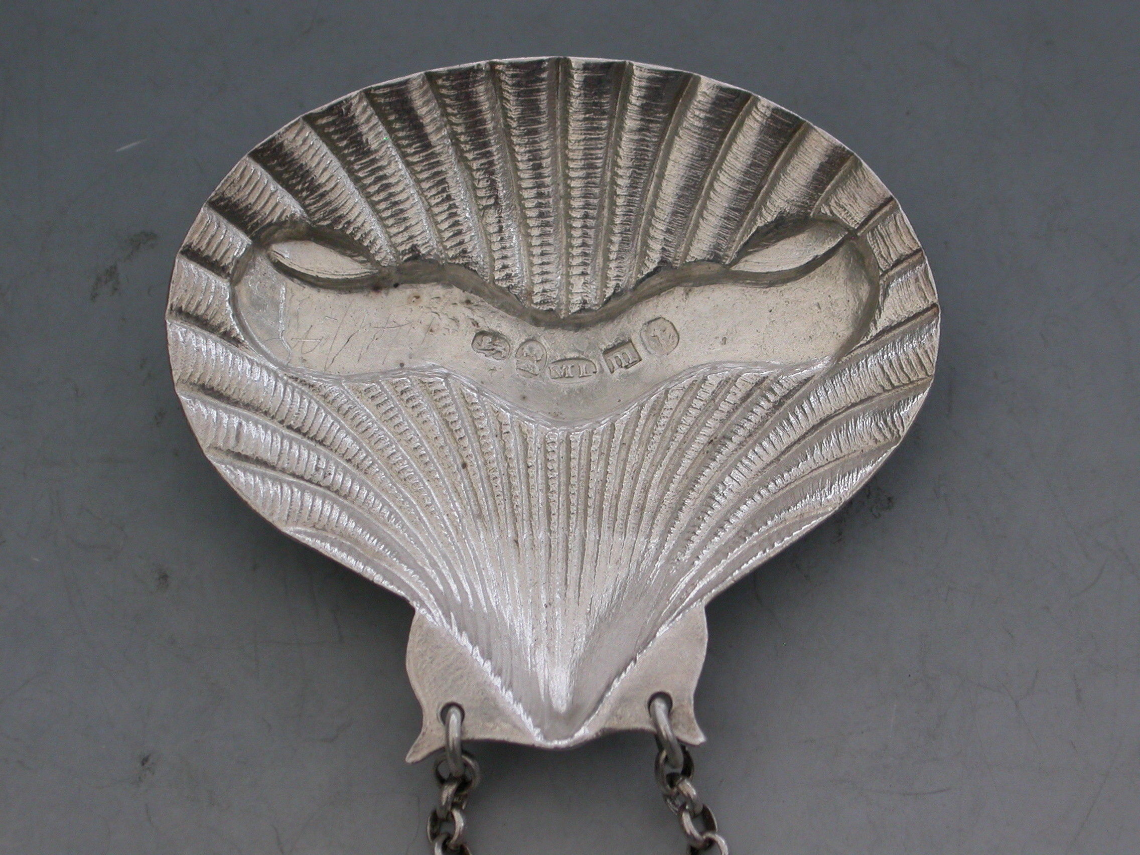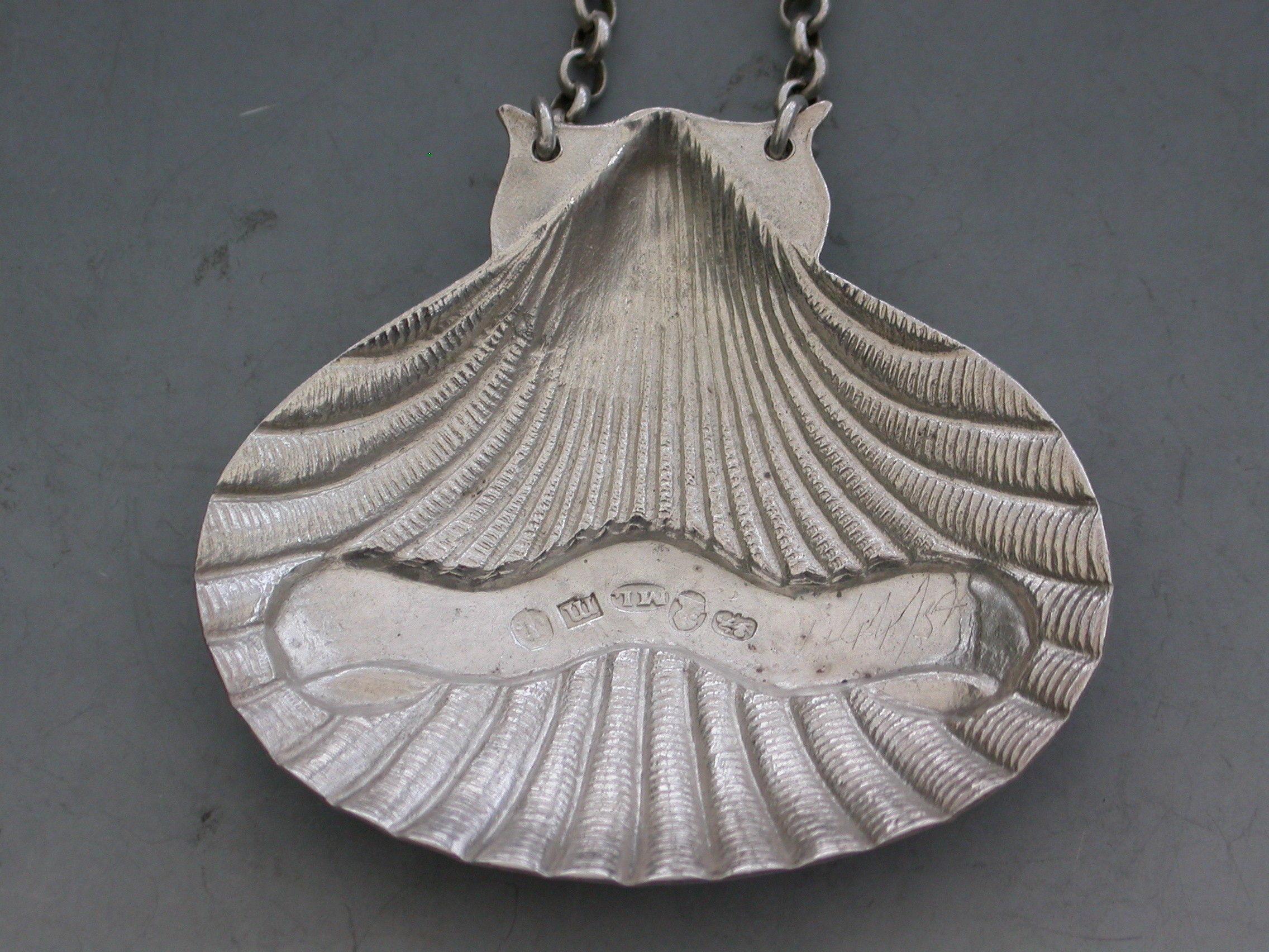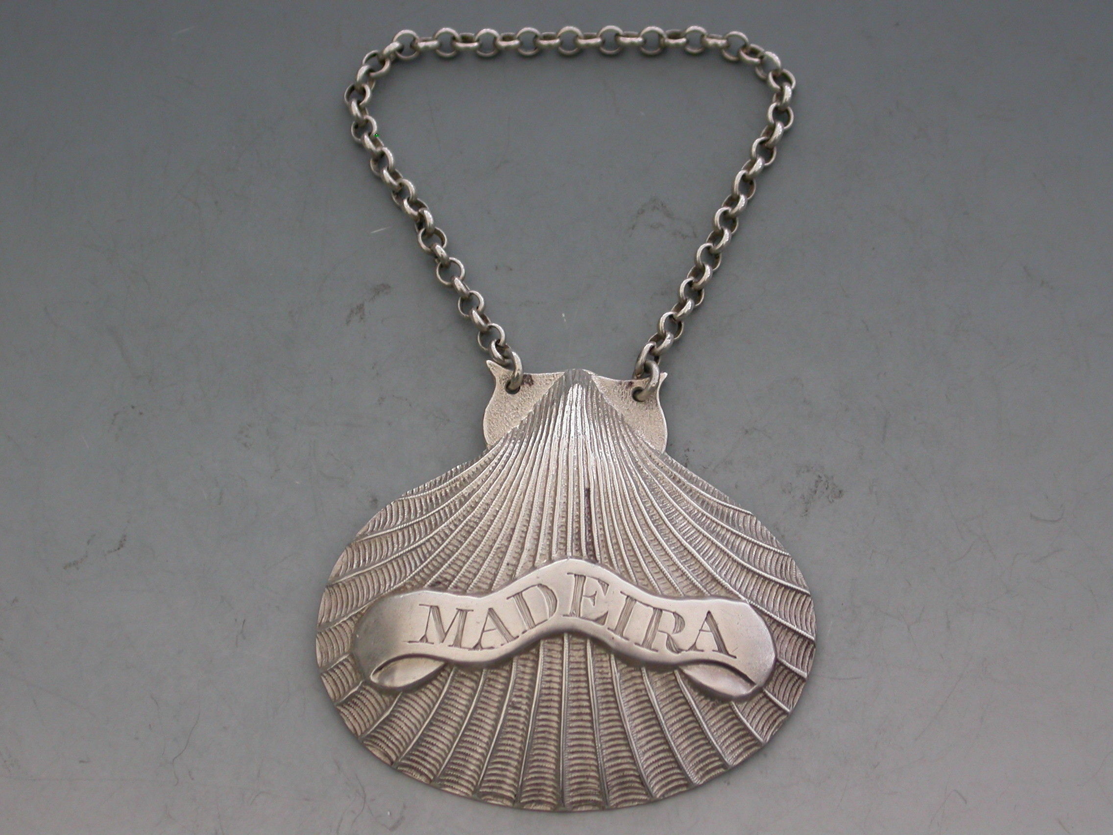 A rare George III silver Wine Label of scallop shell form, the scrolled name plate incised for Madeira.