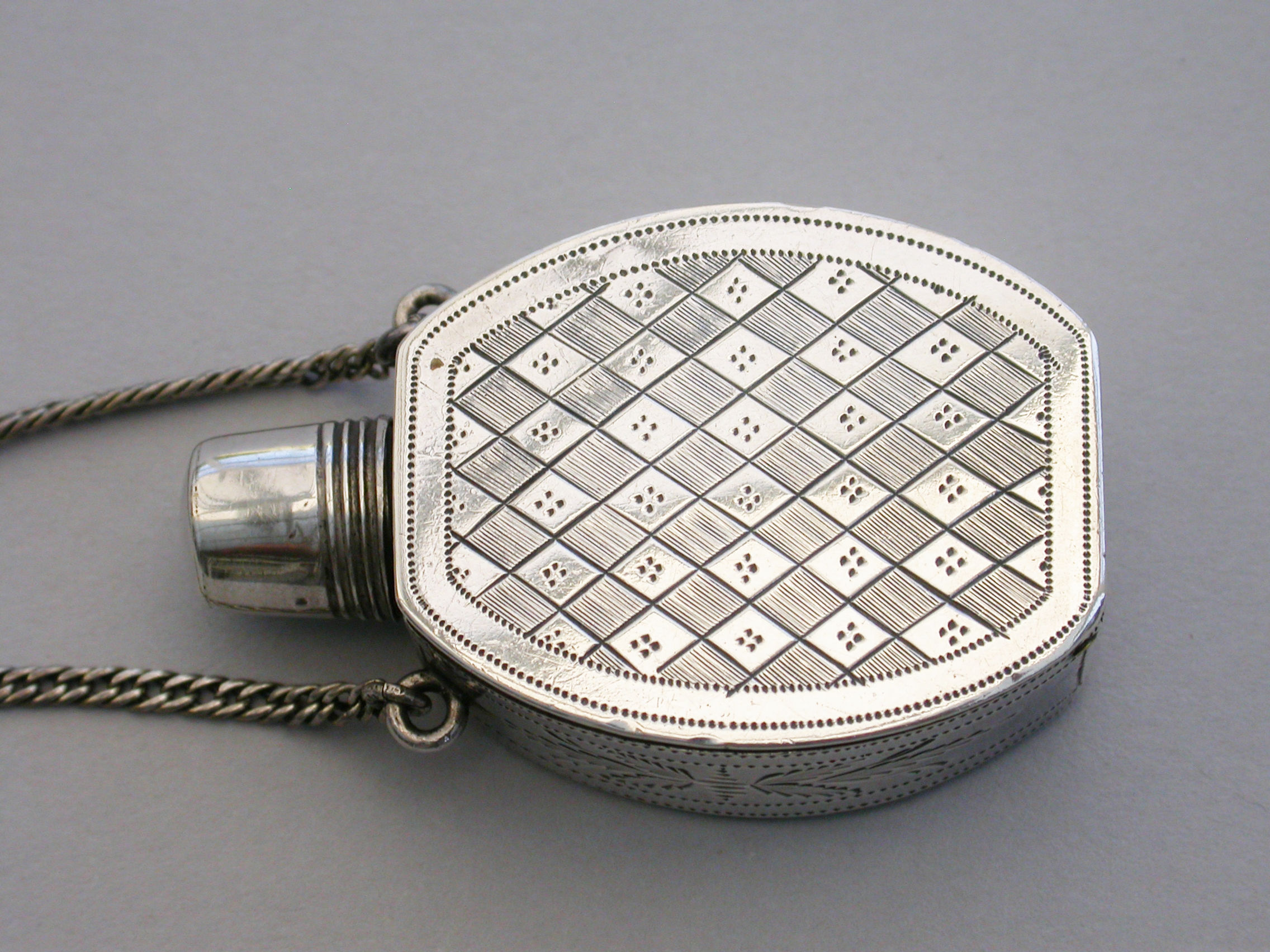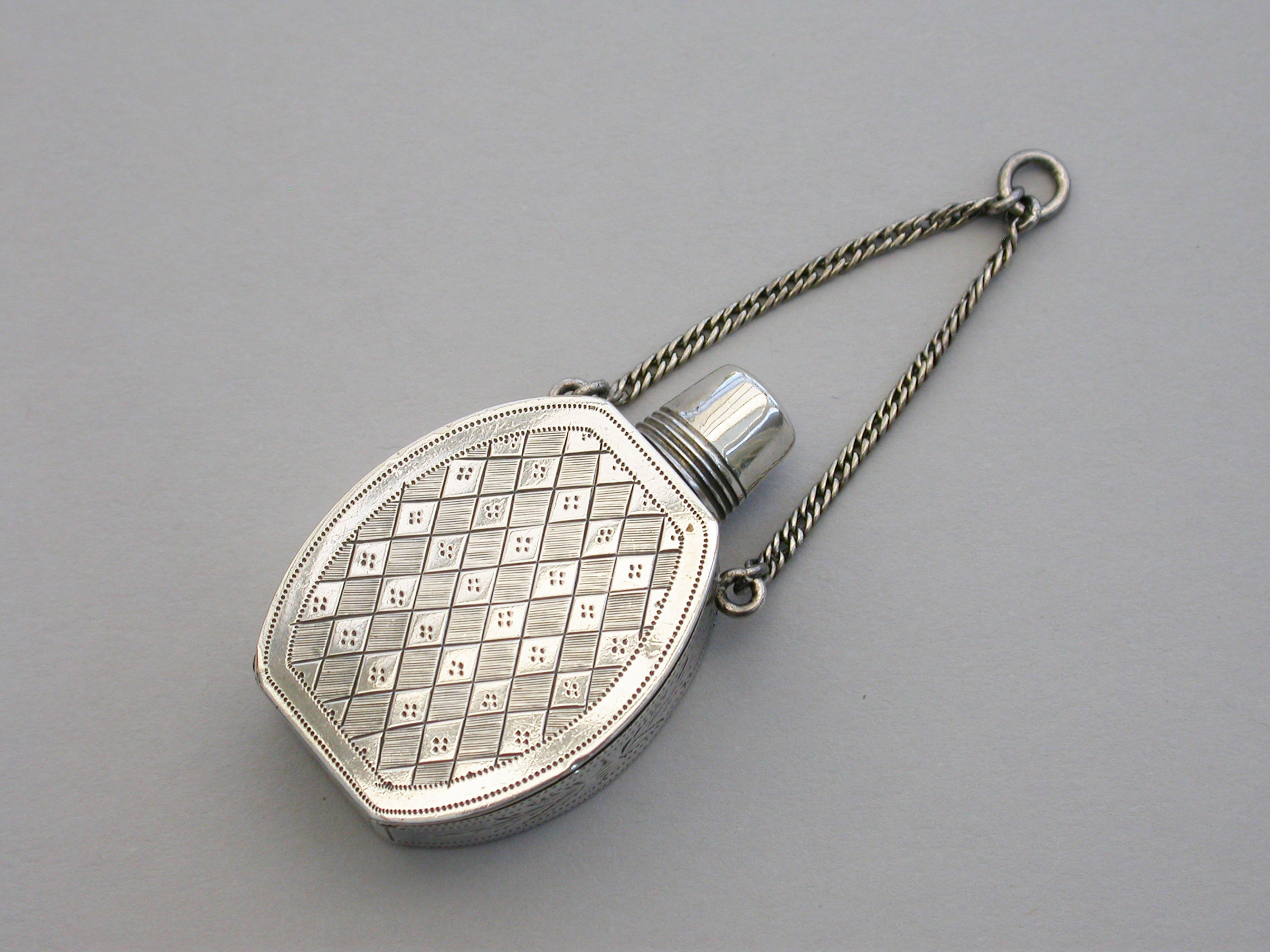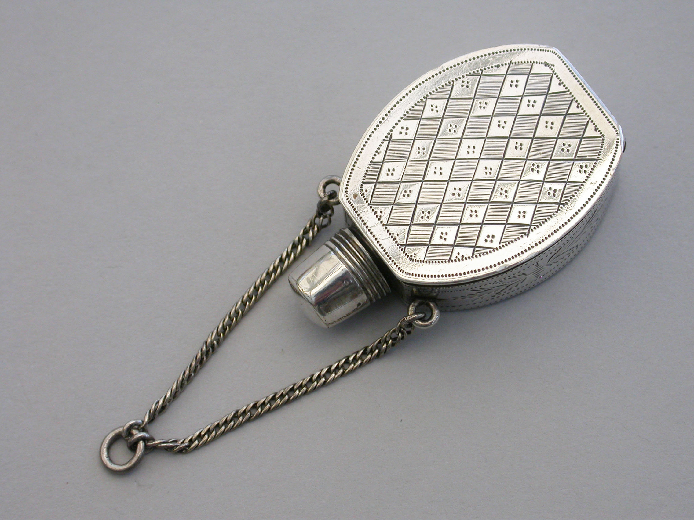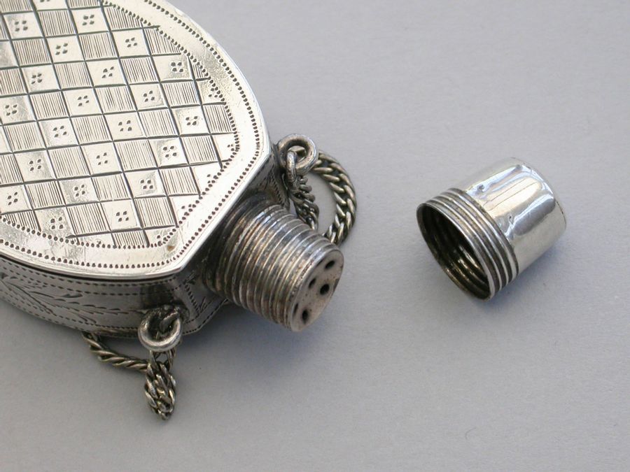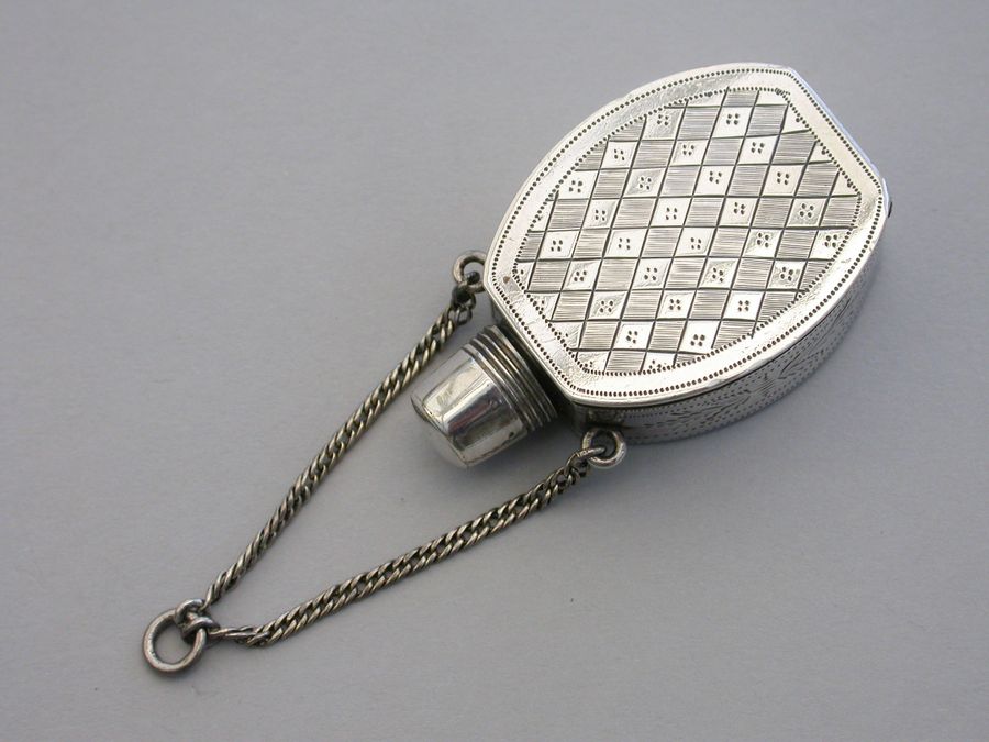 An extremely fine and rare George III silver Vinaigrette of ""Scent Bottle"" form, the screw-off lid revealing the pierced top, flush hinge to shaped oval body, beautifully bright-cut engraved with foliate and chequorboard patterns. Attached suspension chain.