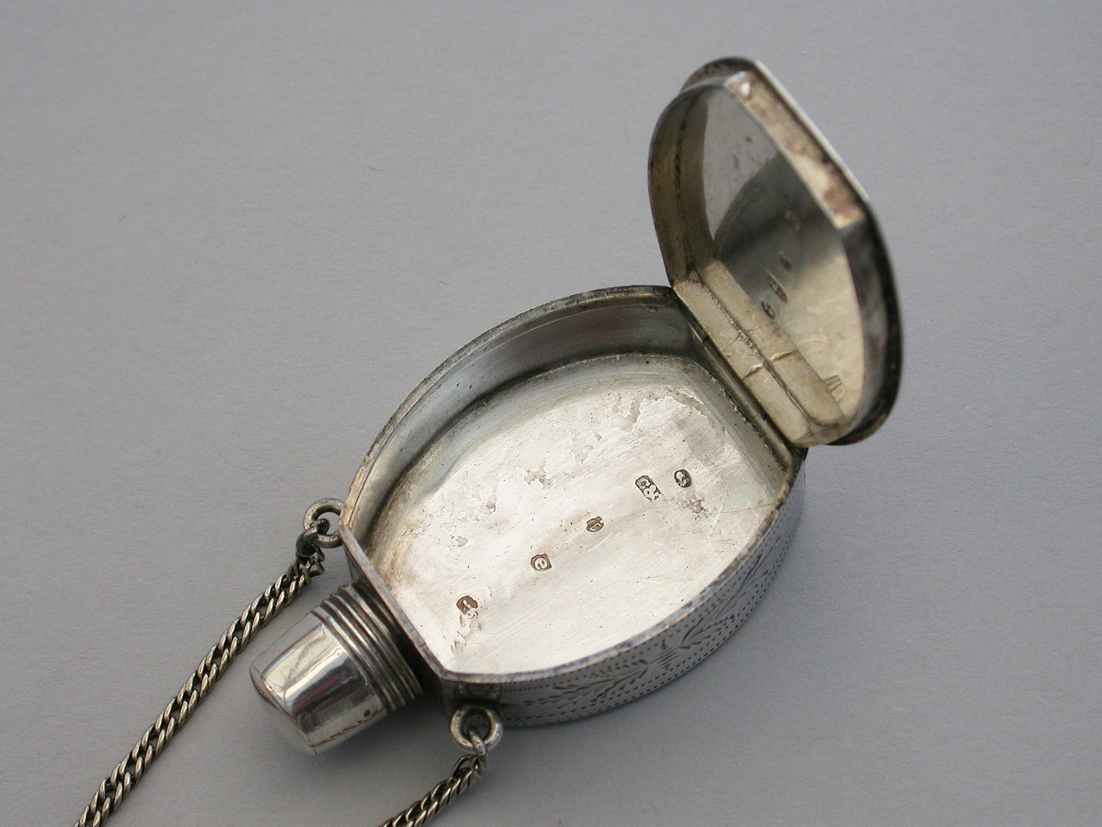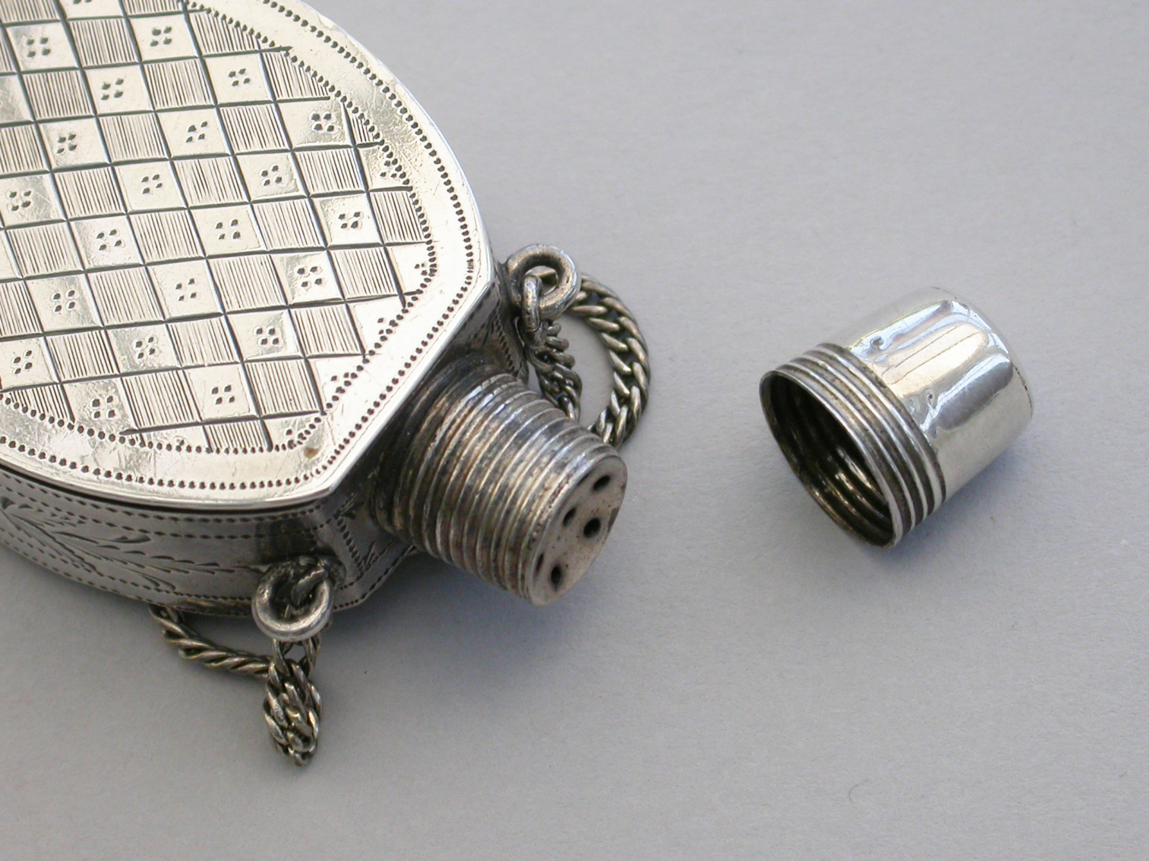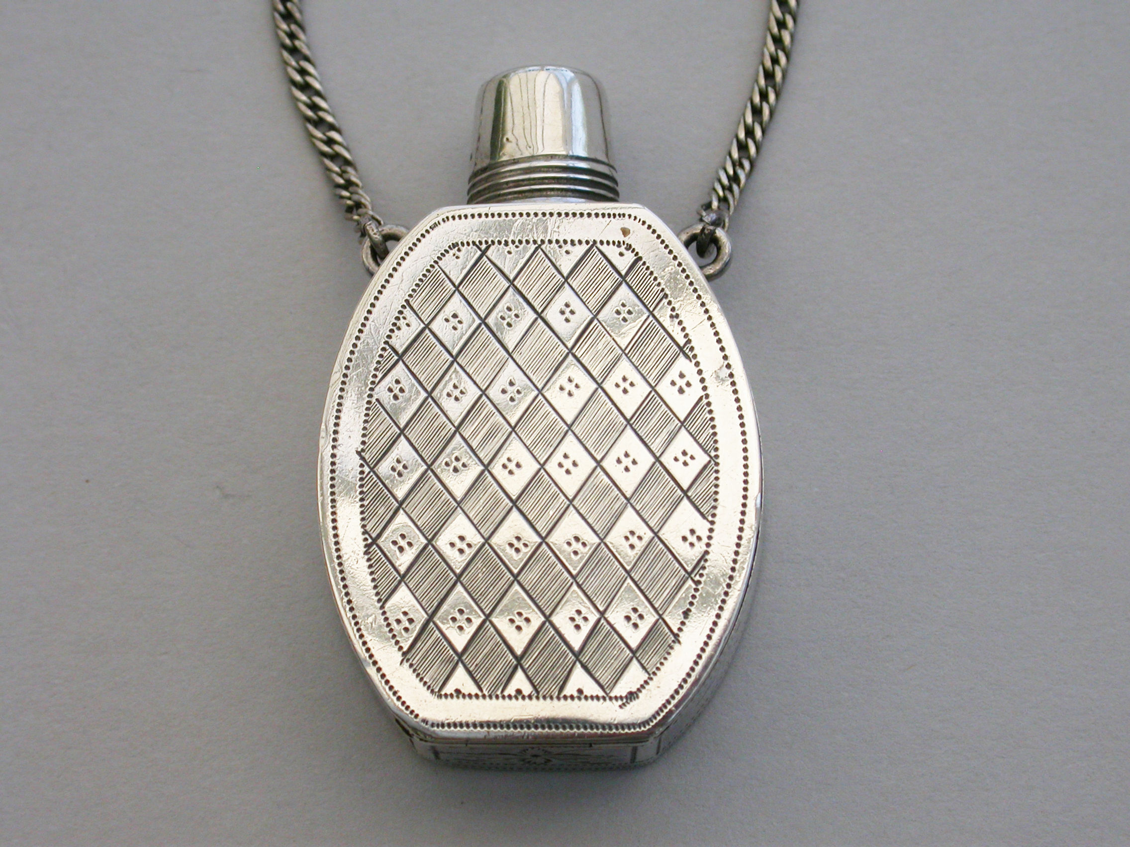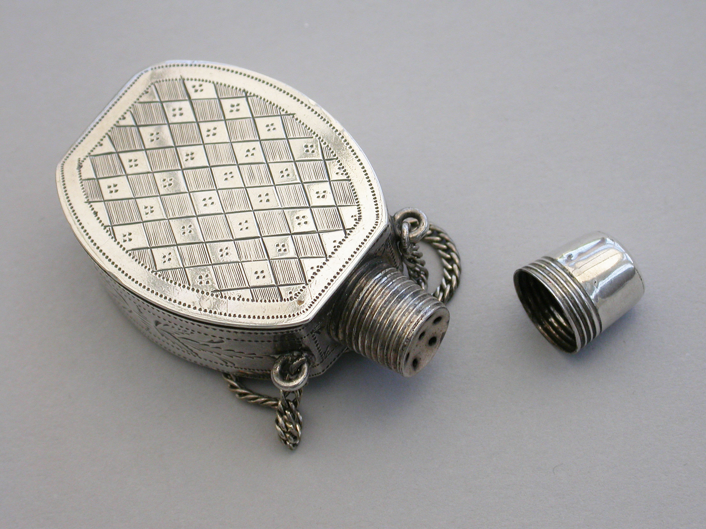 An extremely fine and rare George III silver Vinaigrette of ""Scent Bottle"" form, the screw-off lid revealing the pierced top, flush hinge to shaped oval body, beautifully bright-cut engraved with foliate and chequorboard patterns. Attached suspension chain.
