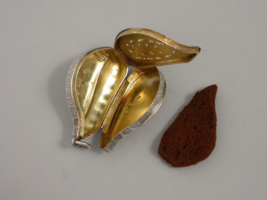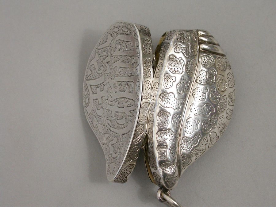 A fine and rare George III silver Vinaigrette made in the form of a Sea Snail Shell,with attached suspension ring, the top and sides with bright-cut engraved seaweed or amoeba type decoration, the base with simulated Chinese characters on a prick-dot ground. The silver gilt grille pierced with a single fern leaf.