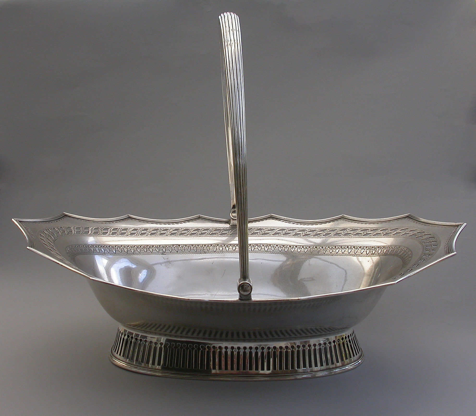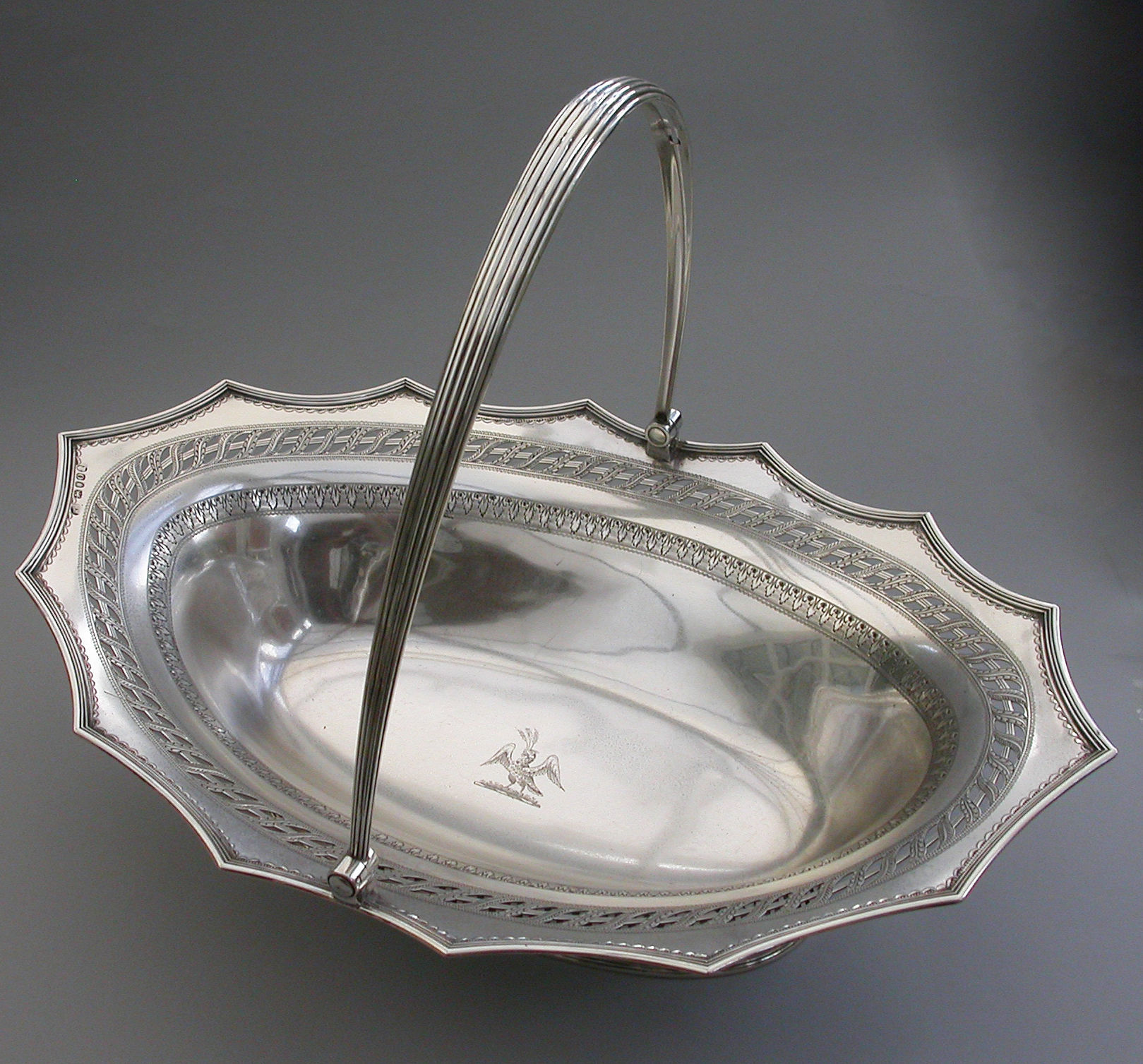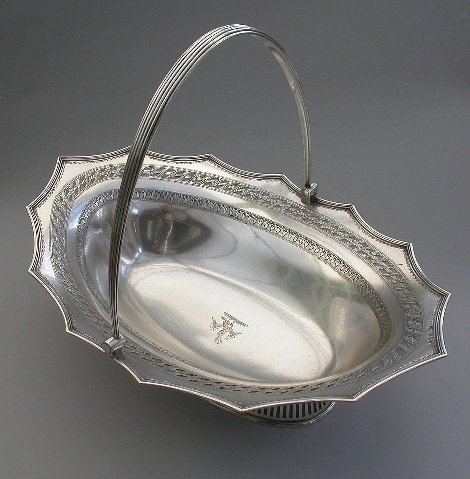A very fine quality George III silver Cake Basket of oval form with pierced collet foot and reeded swing handle, the shaped scalloped rim with applied reeded border and decorated with bands of pierced and bright-cut engraved leaves and scrolls, the centre engraved with a crest of an eagle holding three ears of corn.