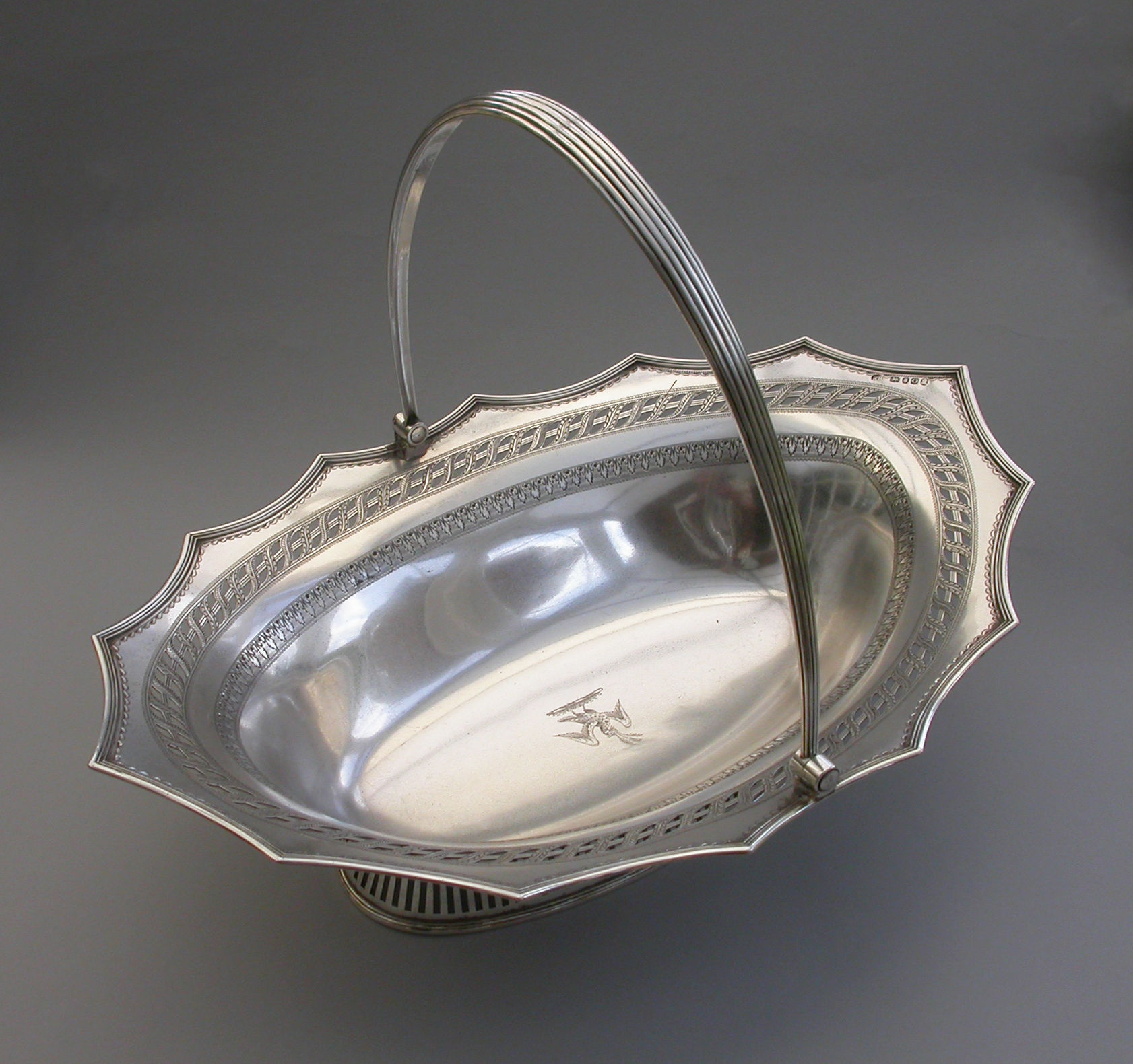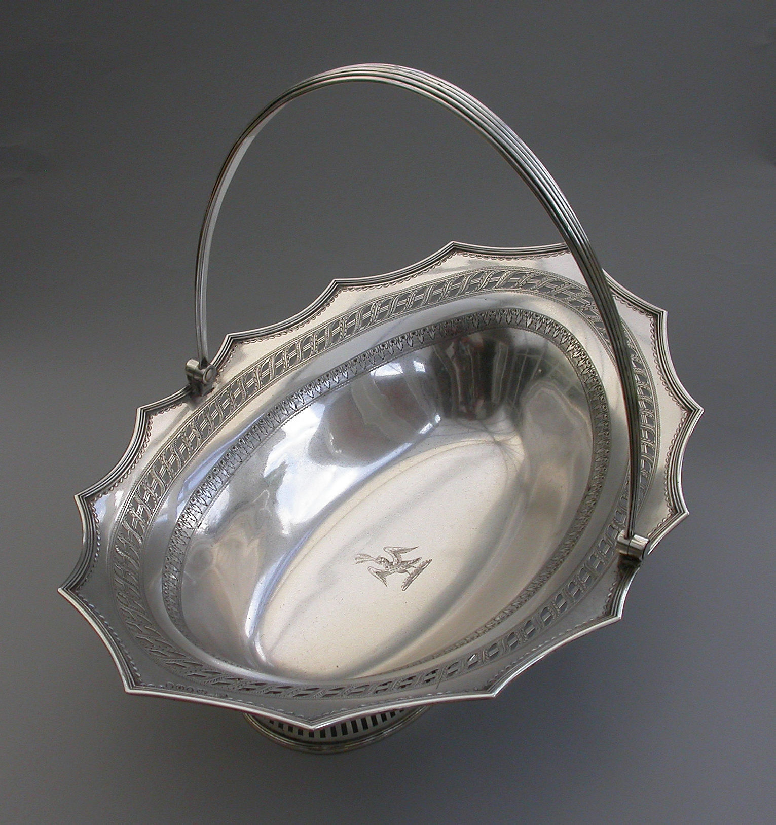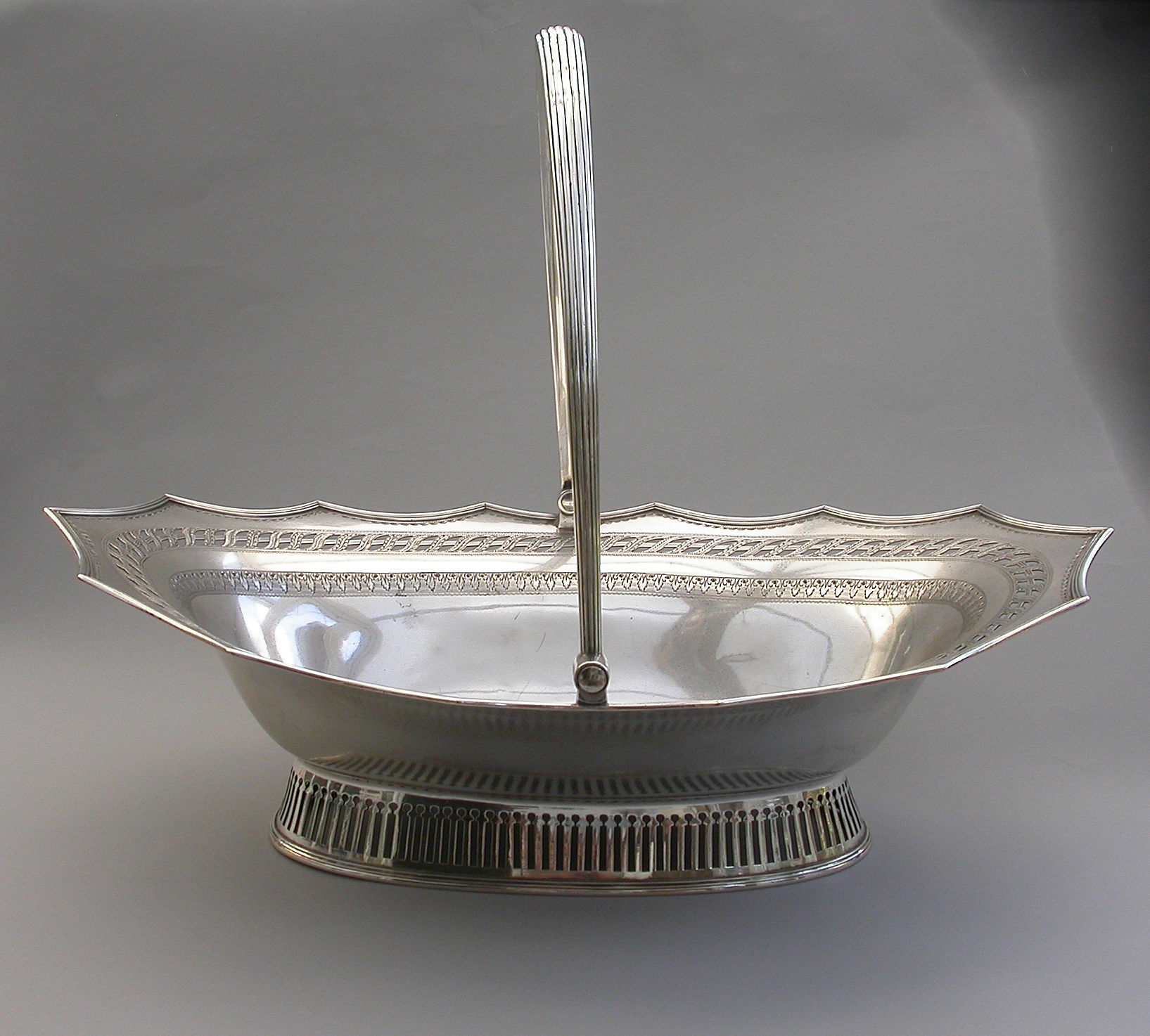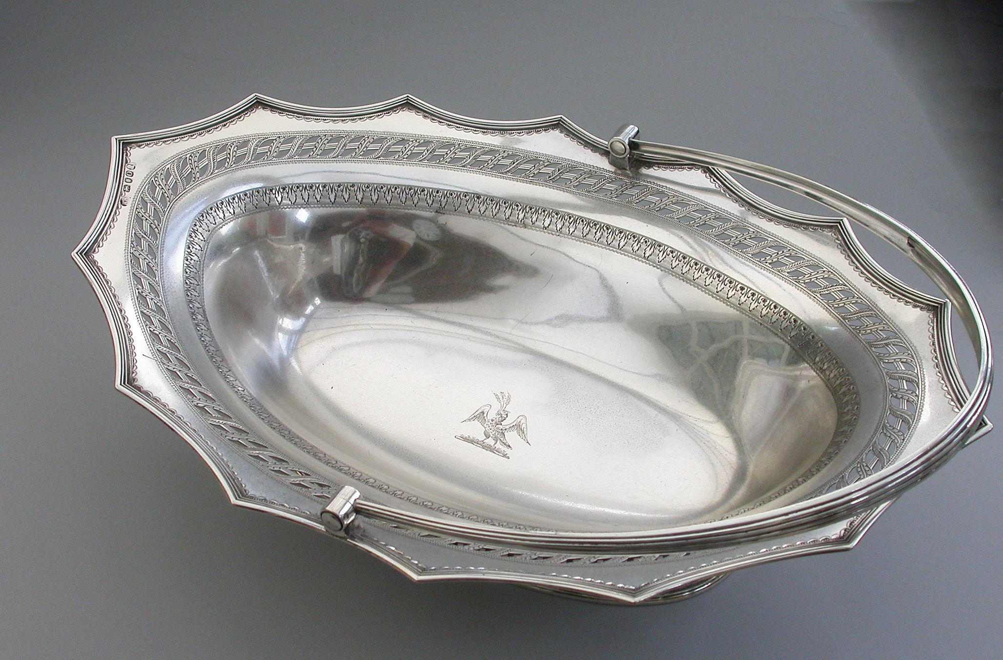 A very fine quality George III silver Cake Basket of oval form with pierced collet foot and reeded swing handle, the shaped scalloped rim with applied reeded border and decorated with bands of pierced and bright-cut engraved leaves and scrolls, the centre engraved with a crest of an eagle holding three ears of corn.