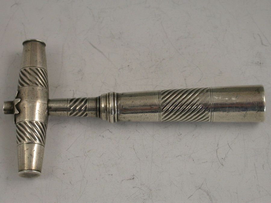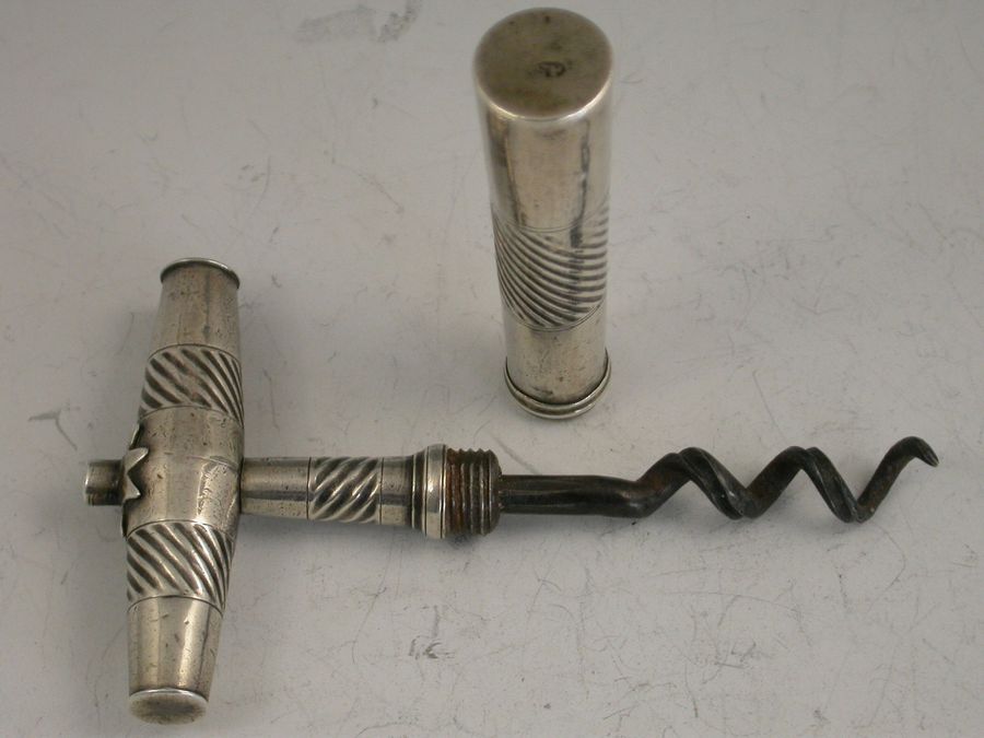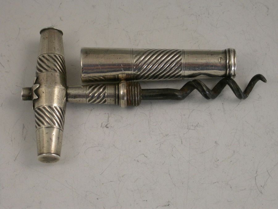 A good George III silver Travelling Cork Screw of ‘straight – pull’ form with screw off cover, the handle and body with bands of reeded decoration.