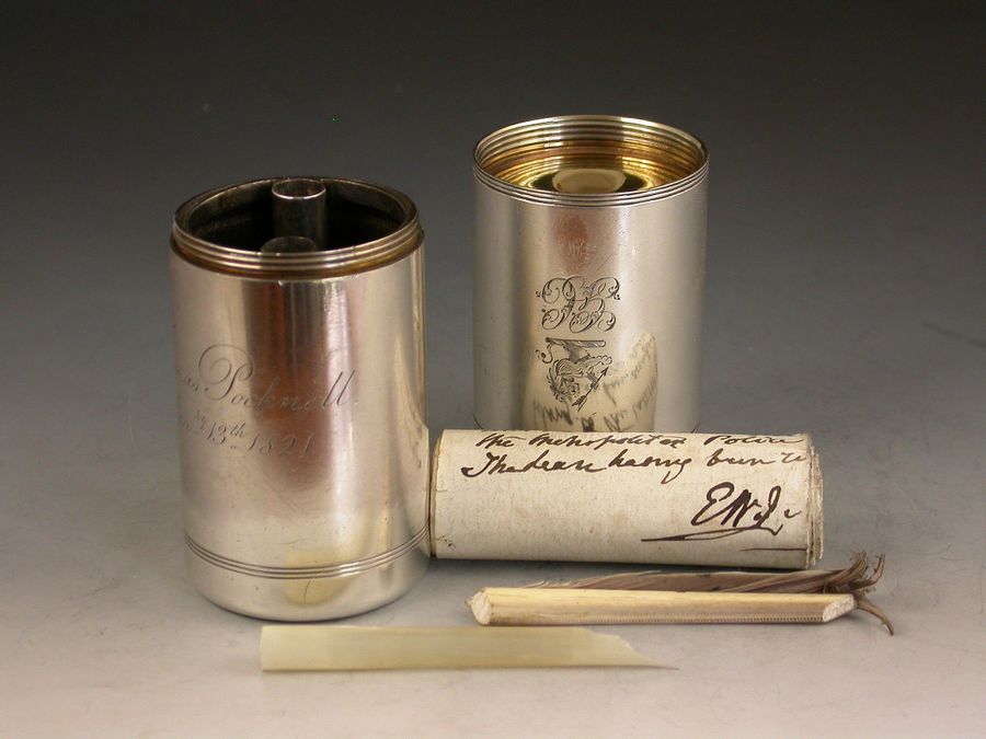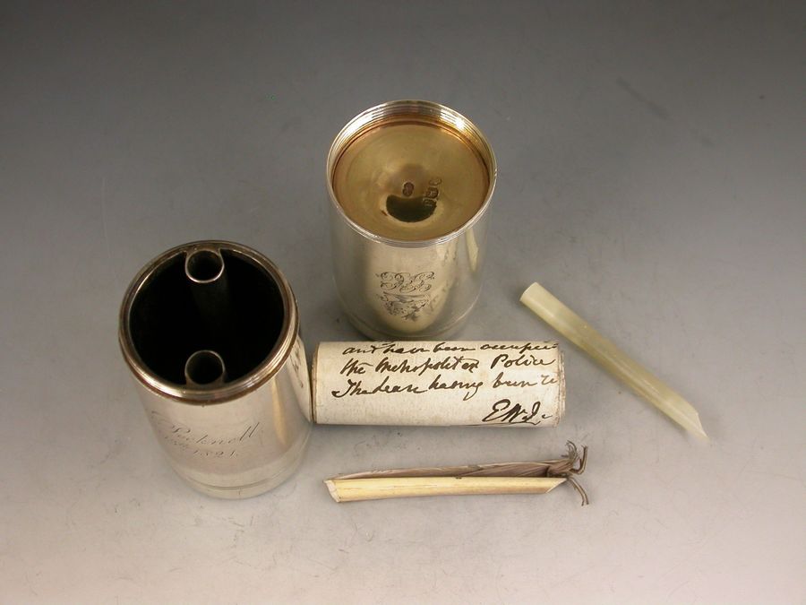 An extremely fine and rare George III silver Travelling Inkwell and Quill Case with British Prime Ministerial interest, the plain cylindrical case with reeded decoration to the body and unscrewing at the centre to reveal a silver gilt interior with two tubes housing contemporary quills. The top of the case unscrewing to reveal the inkwell compartment containing the silver mounted glass inkwell. The case engraved with contemporary presentation inscription and the crest and monogram of George Canning MP.