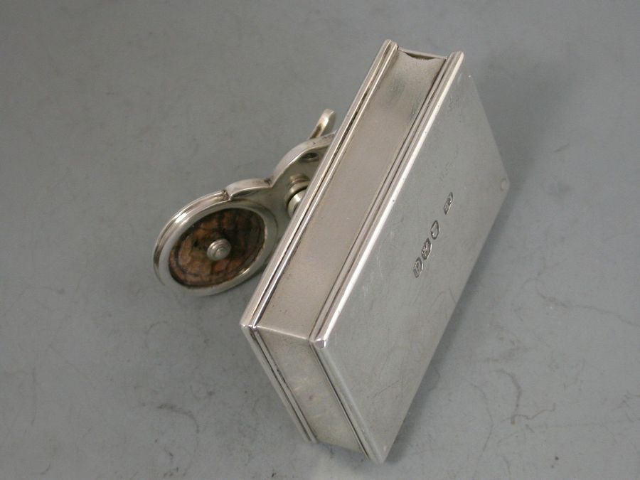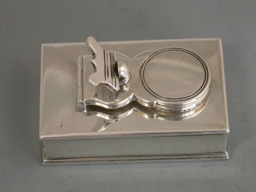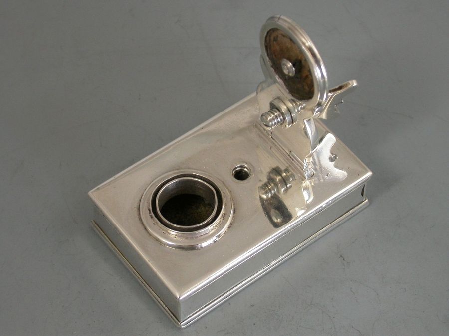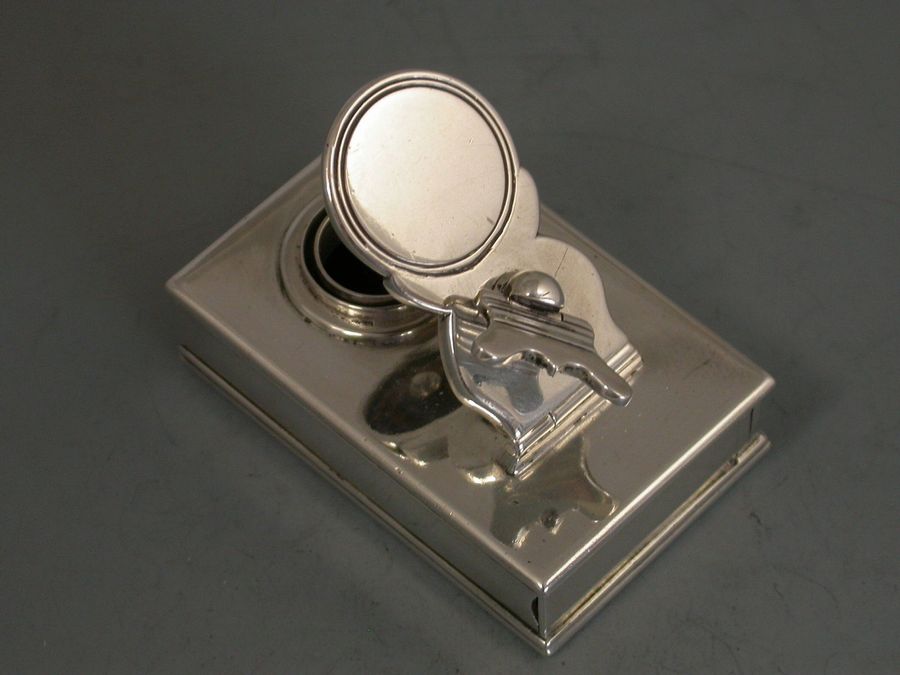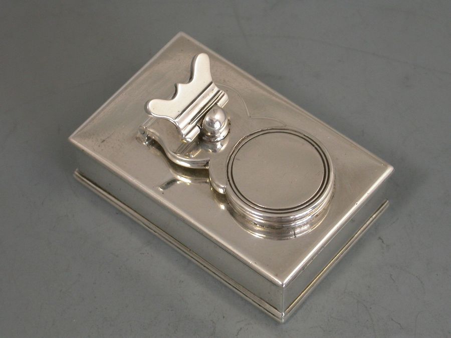 A fine George III silver Travelling Inkwell of shallow rectangular form with hinged screw down cover and a concealed wafer seal compartment to one end.