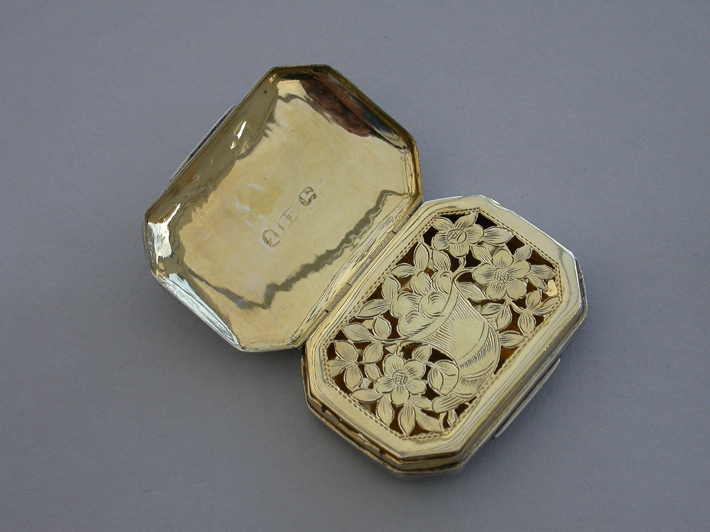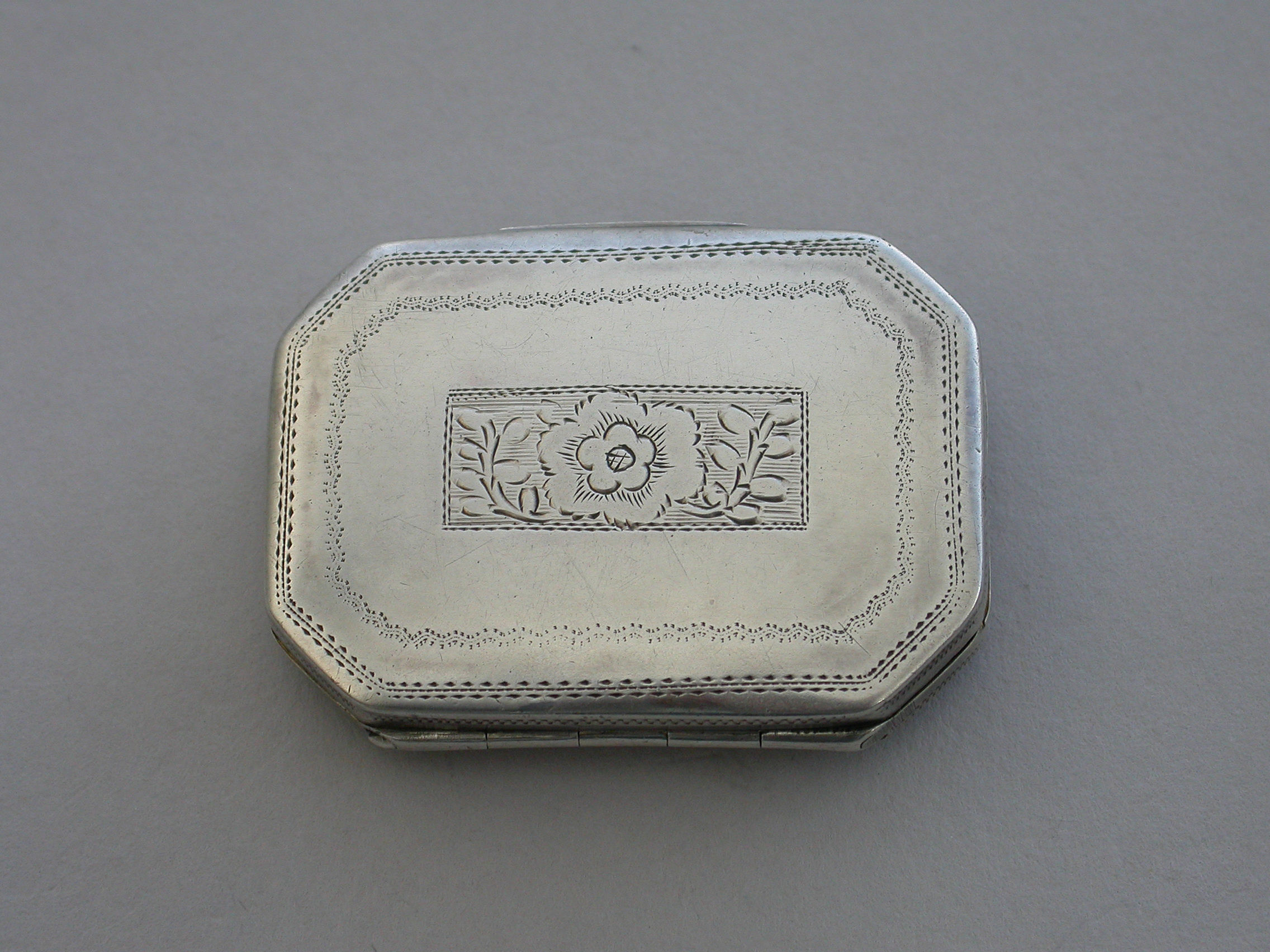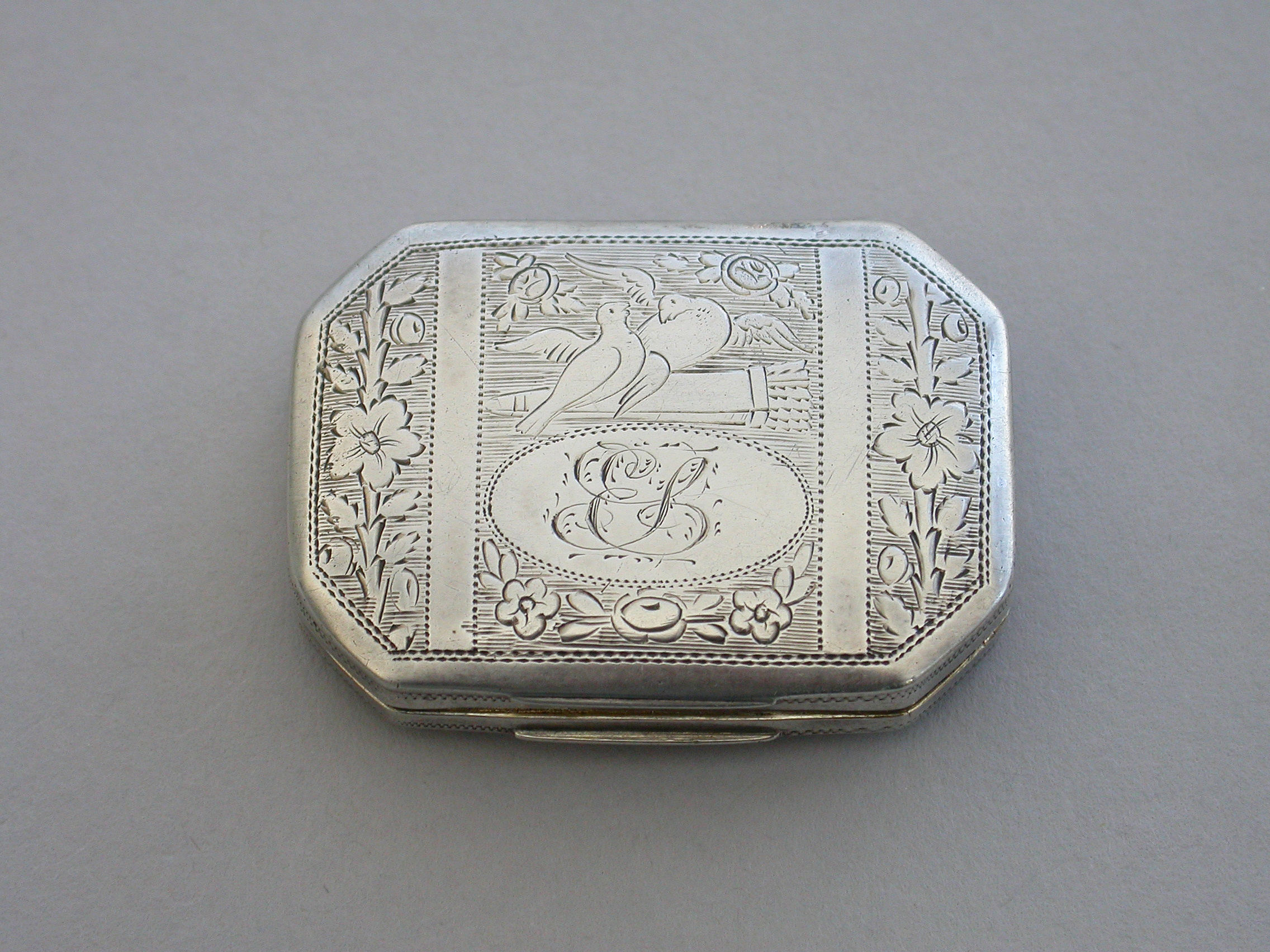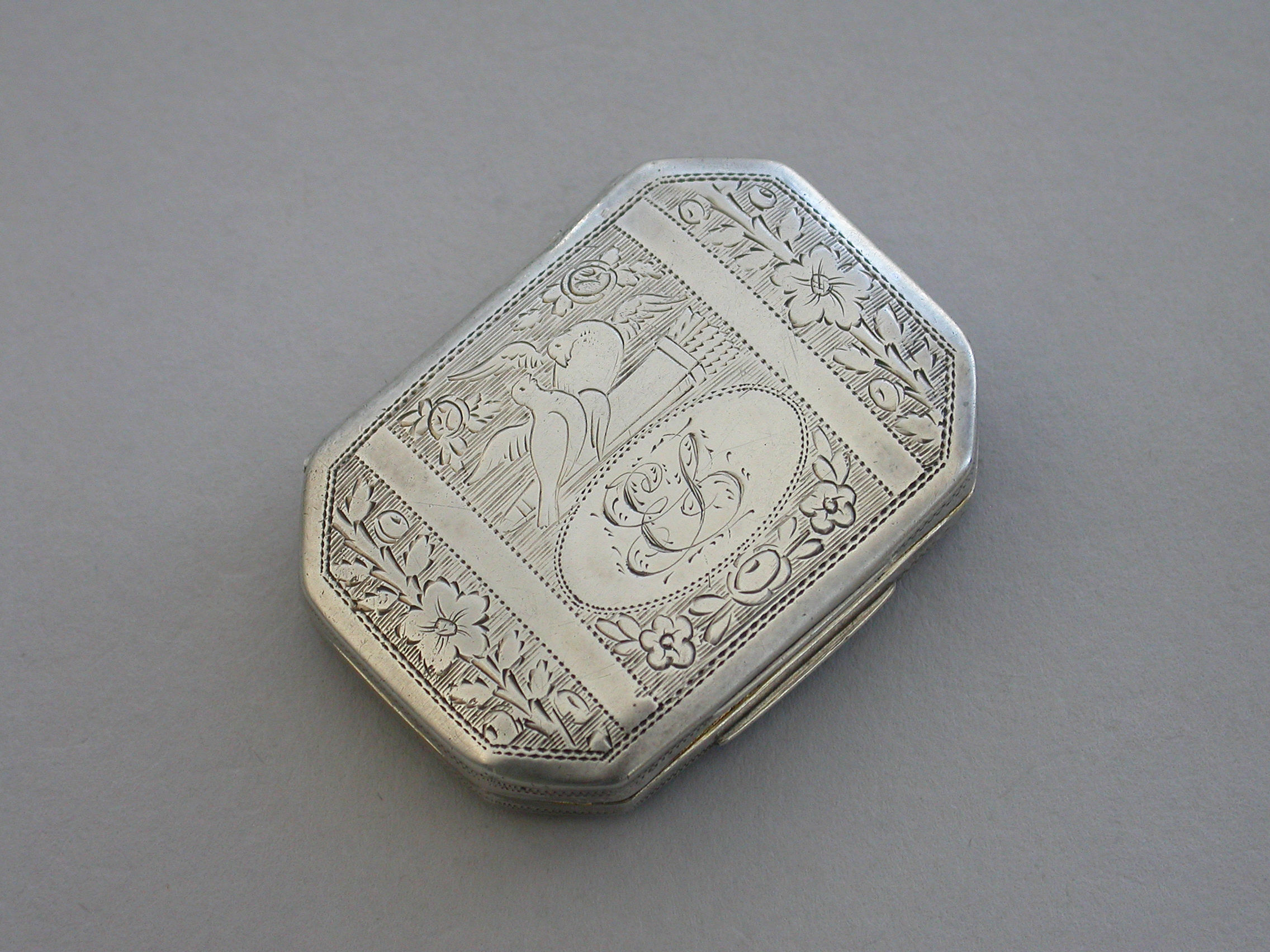 A rare George III silver Vinaigrette of flat cushion shape with bright-cut engraved decoration, the lid engraved with two doves symbolising Venus and a quiver of arrows a symbol of Cupid and Eros. The silver gilt grille pierced with a cornucopia and flower heads.