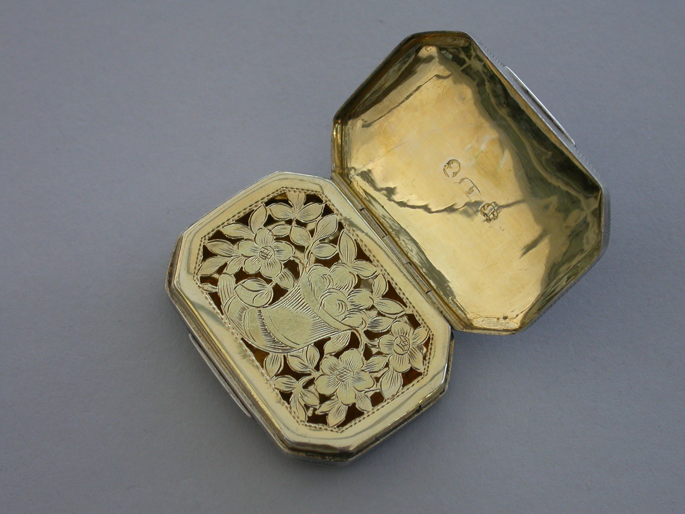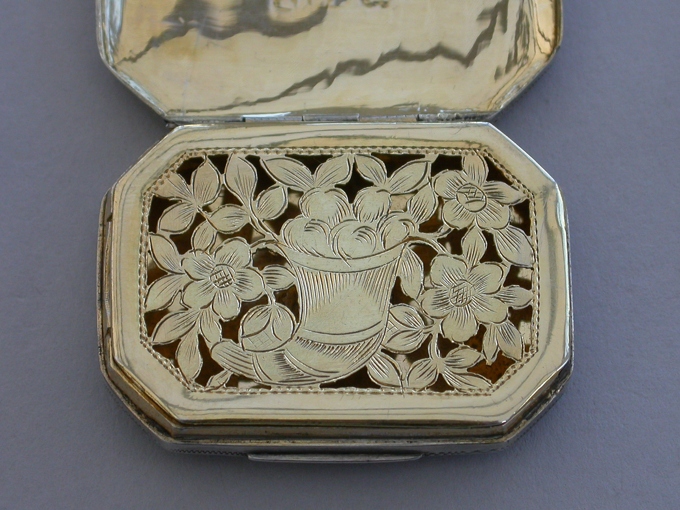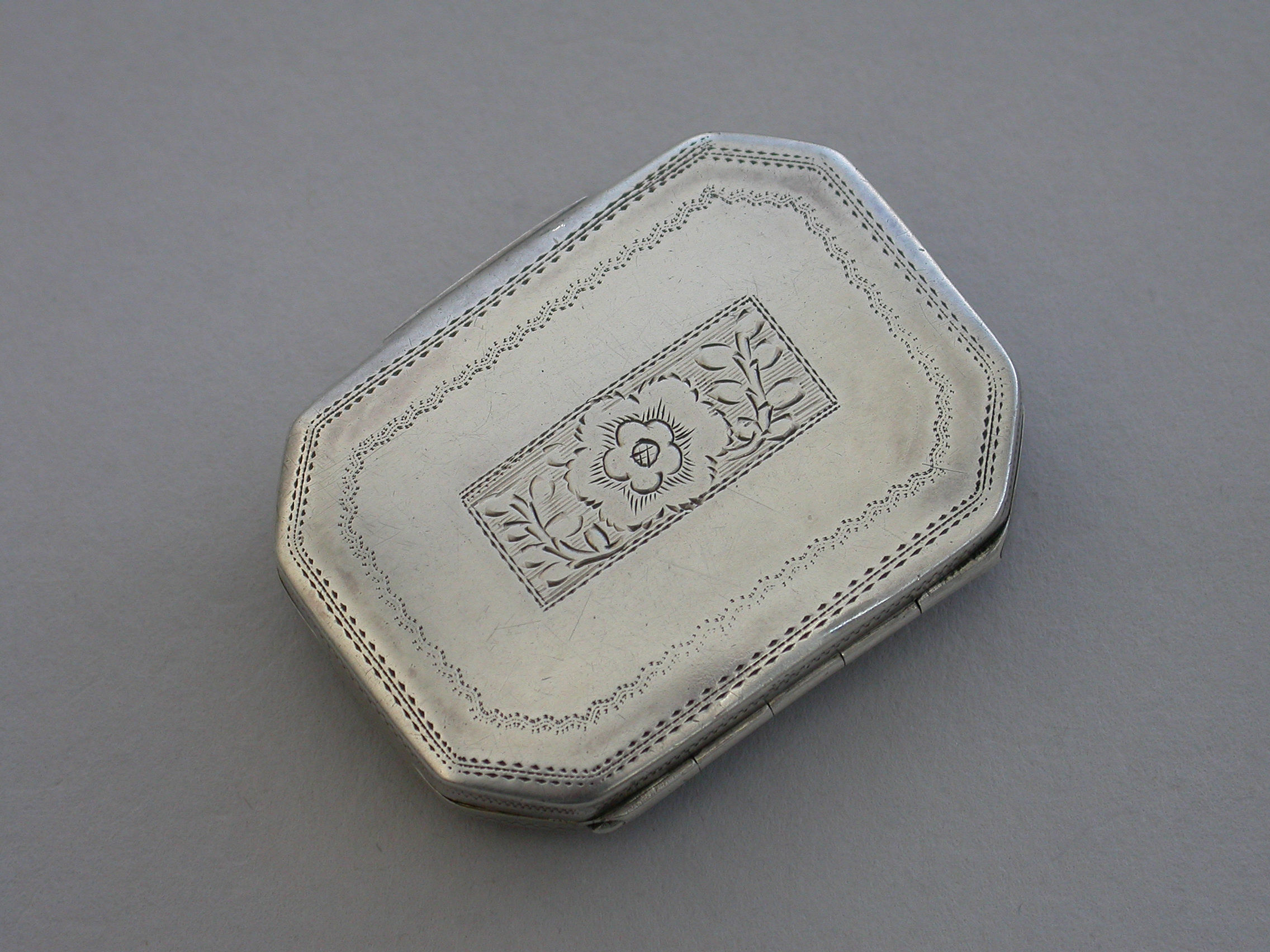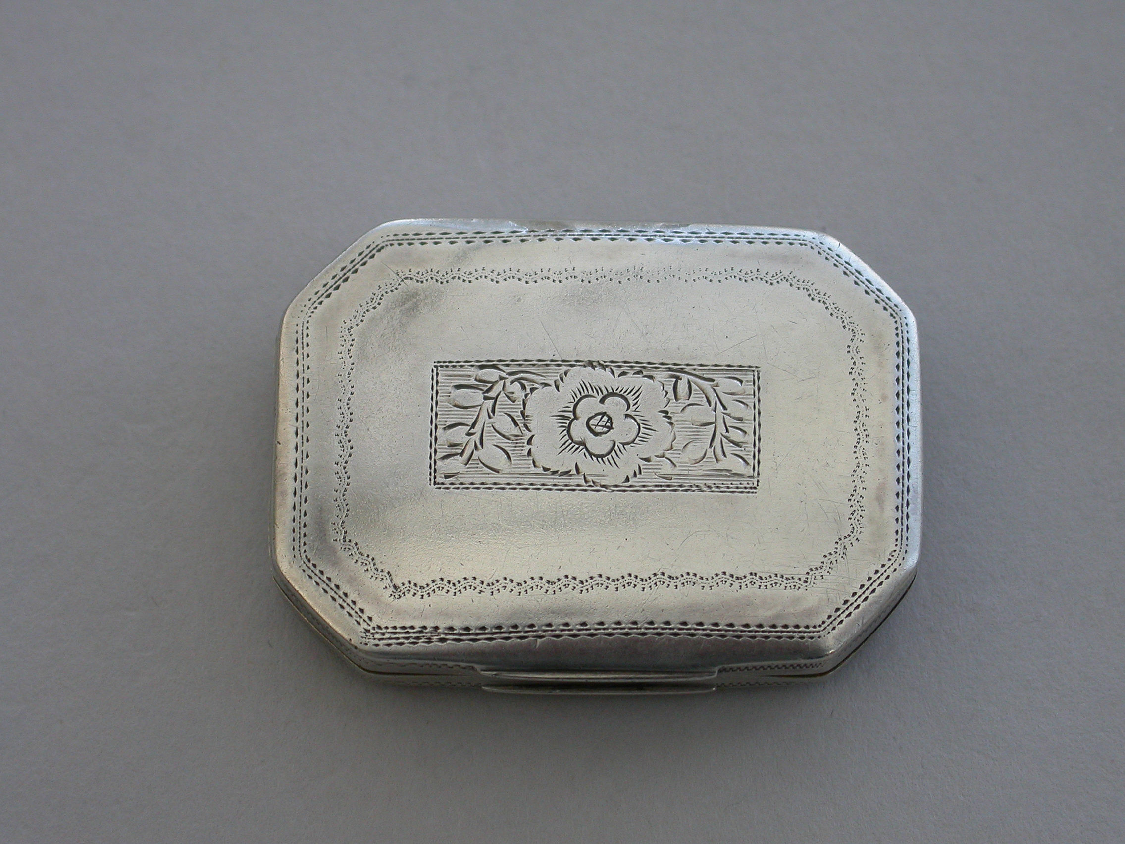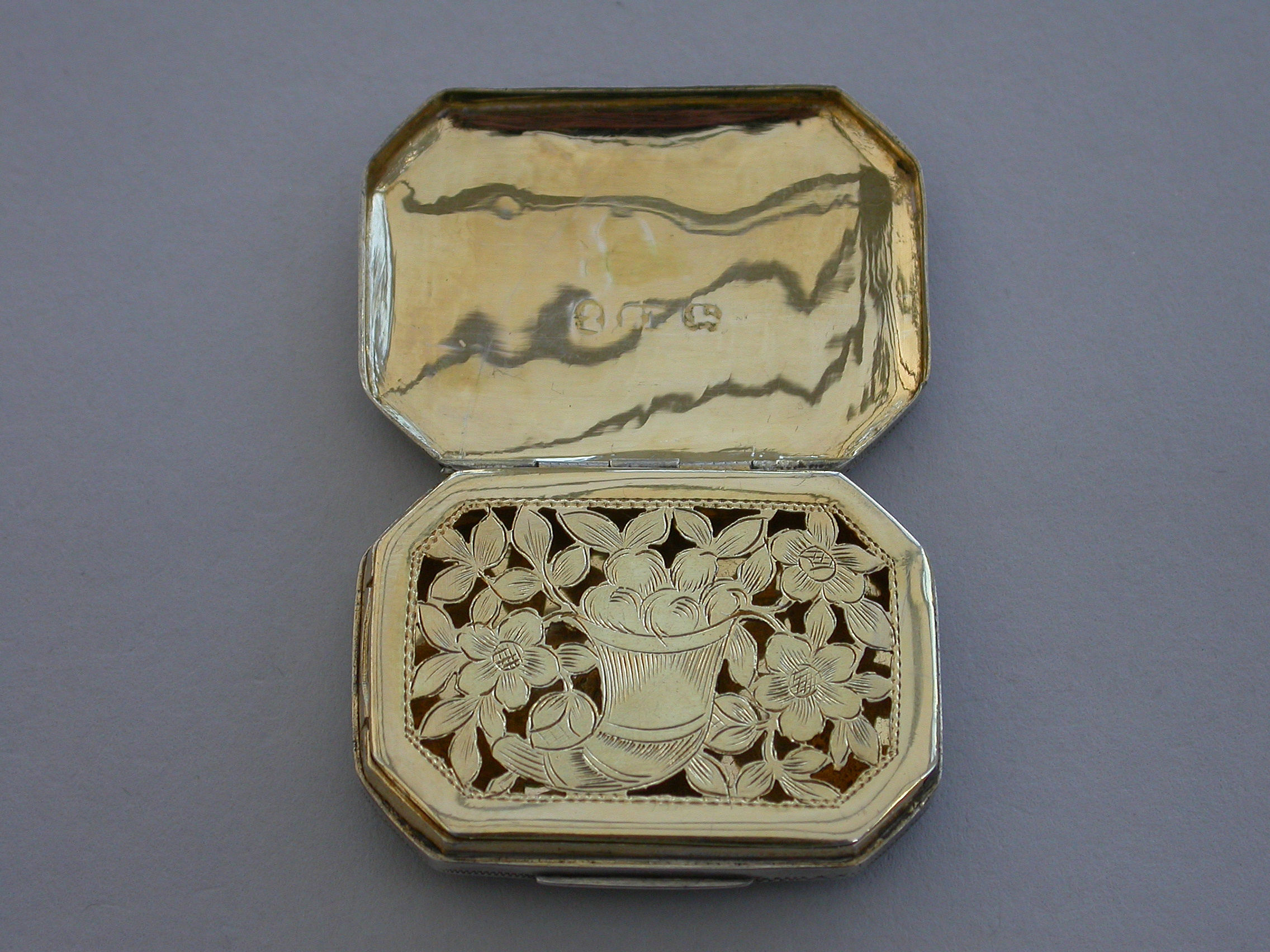 A rare George III silver Vinaigrette of flat cushion shape with bright-cut engraved decoration, the lid engraved with two doves symbolising Venus and a quiver of arrows a symbol of Cupid and Eros. The silver gilt grille pierced with a cornucopia and flower heads.