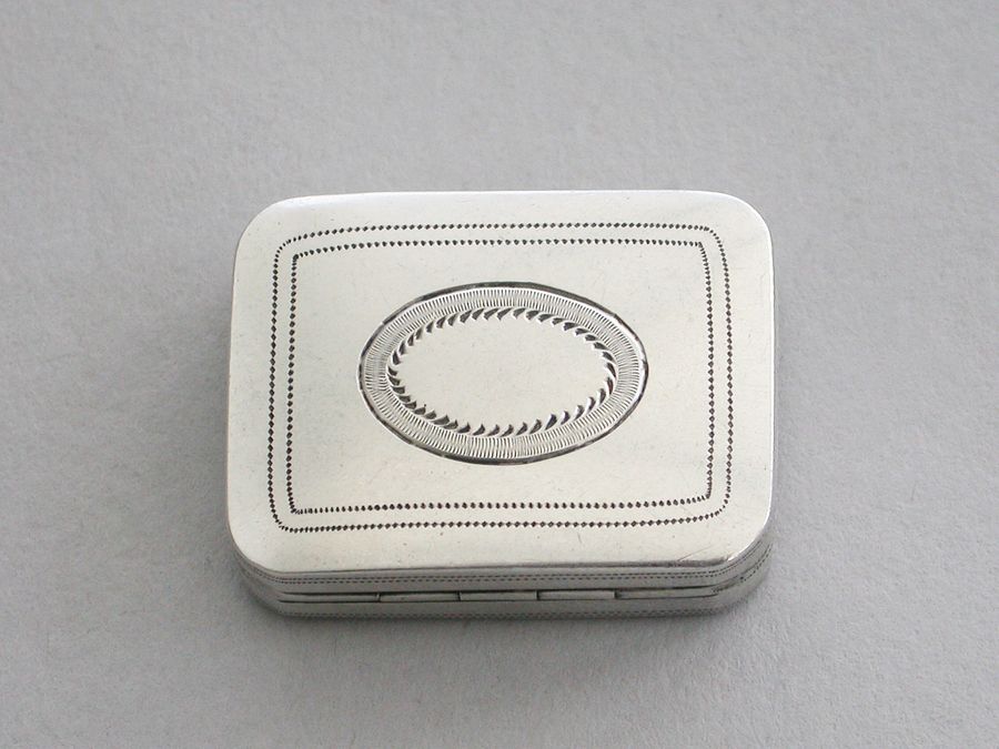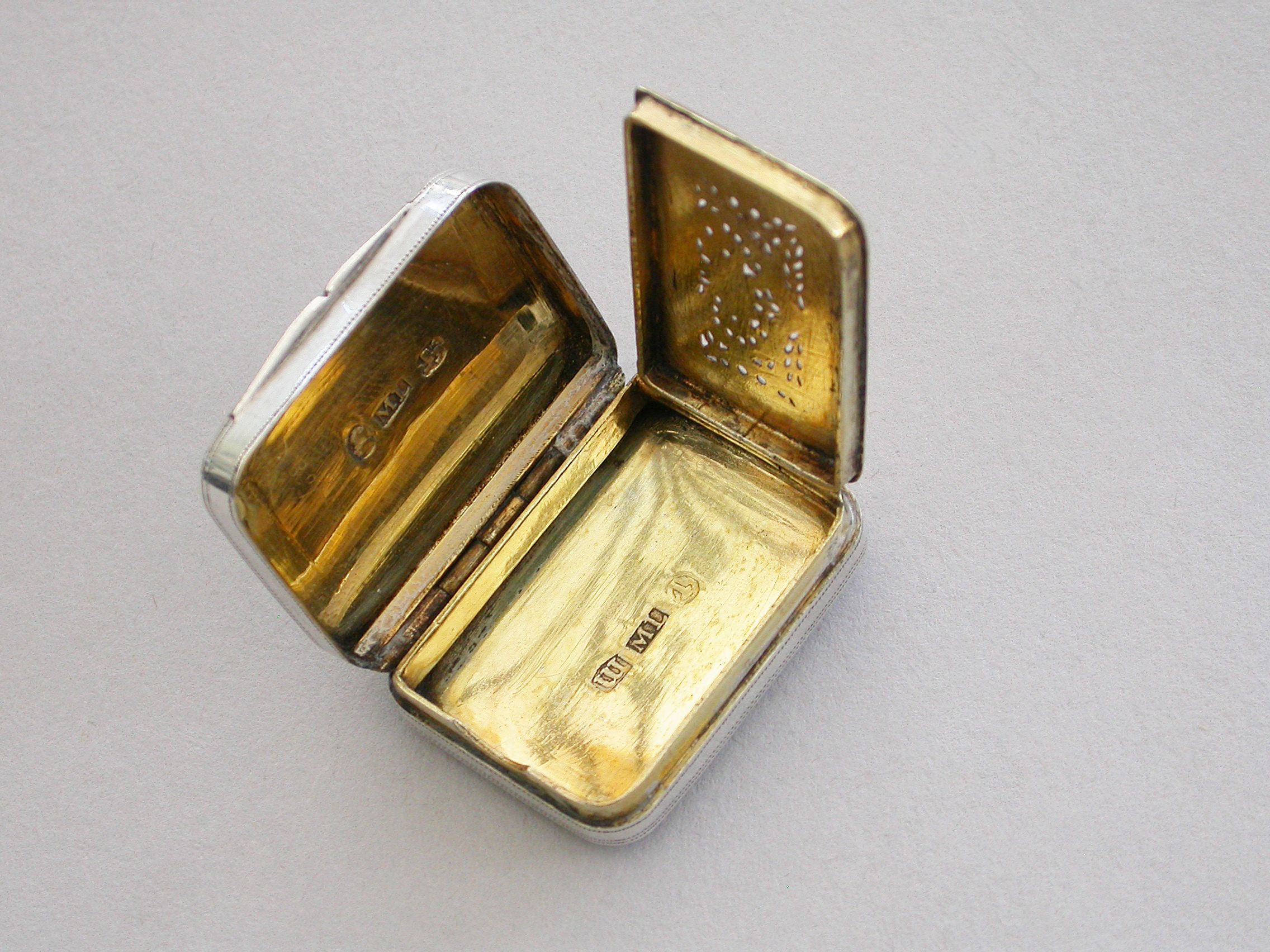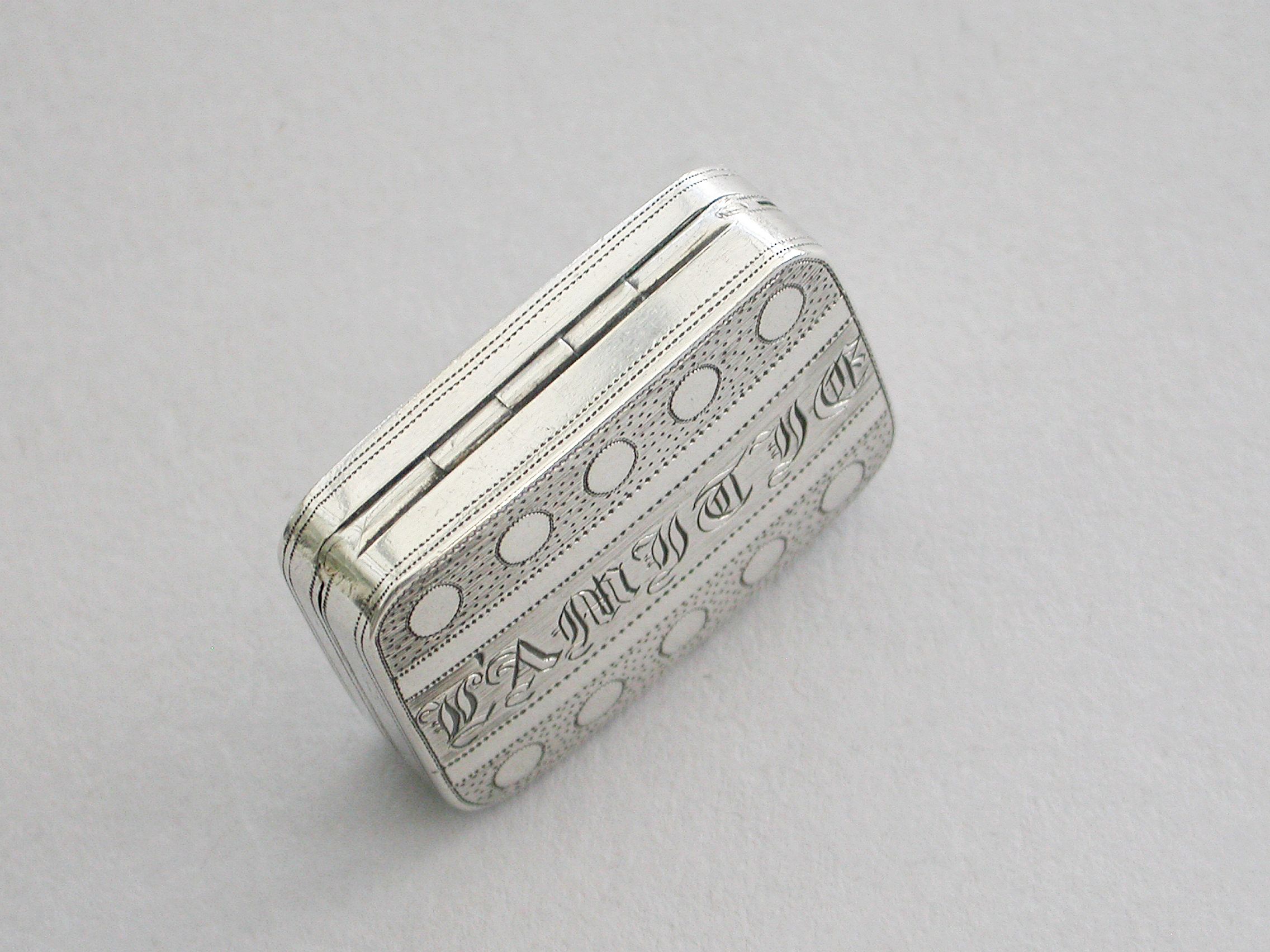 A good George III silver Vinaigrette of rounded rectangular form, the base with prick dot engraved border and vacant oval cartouche. The lid engraved with bands of prick dot and bright-cut engraved roundels, the legend "L'Amitie" (good wishes / friendship) to a central band with reeded background, the silver gilt interior with a hinged faux filigree type grille with beaded border.