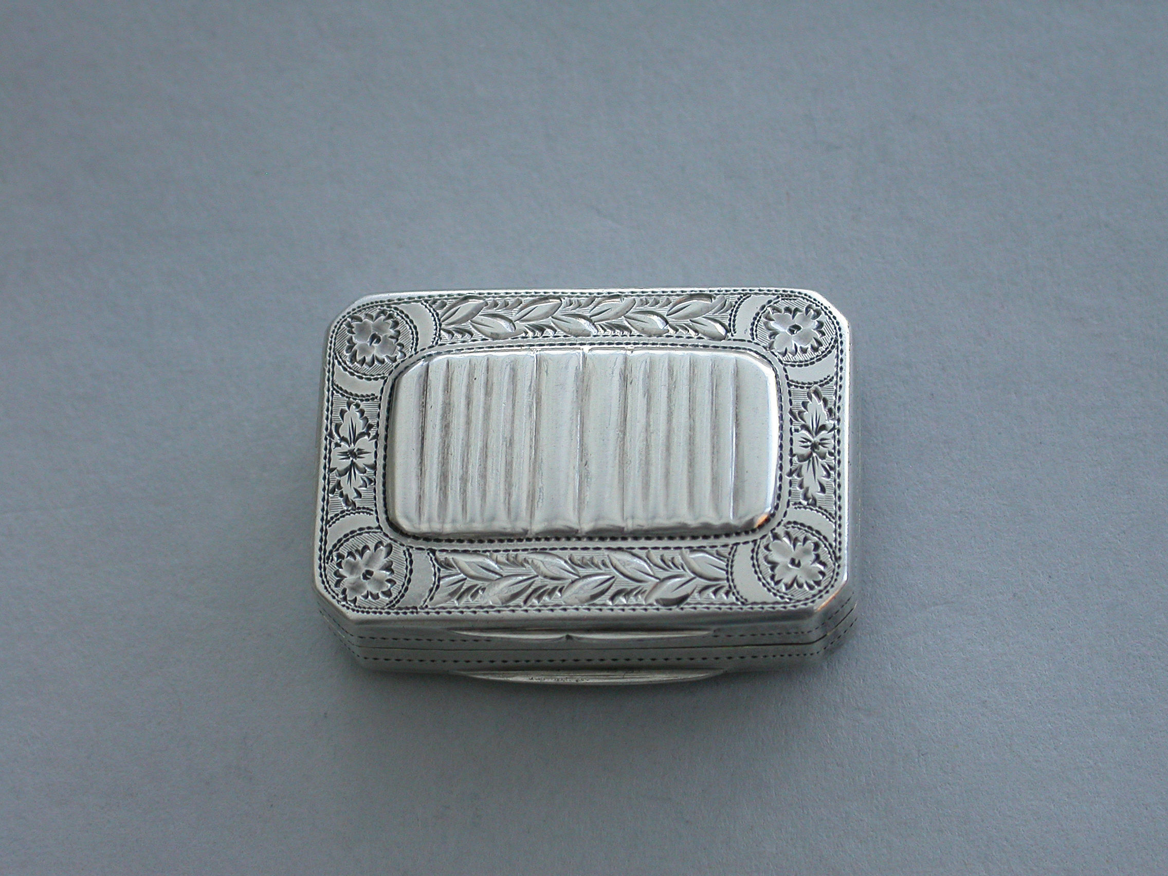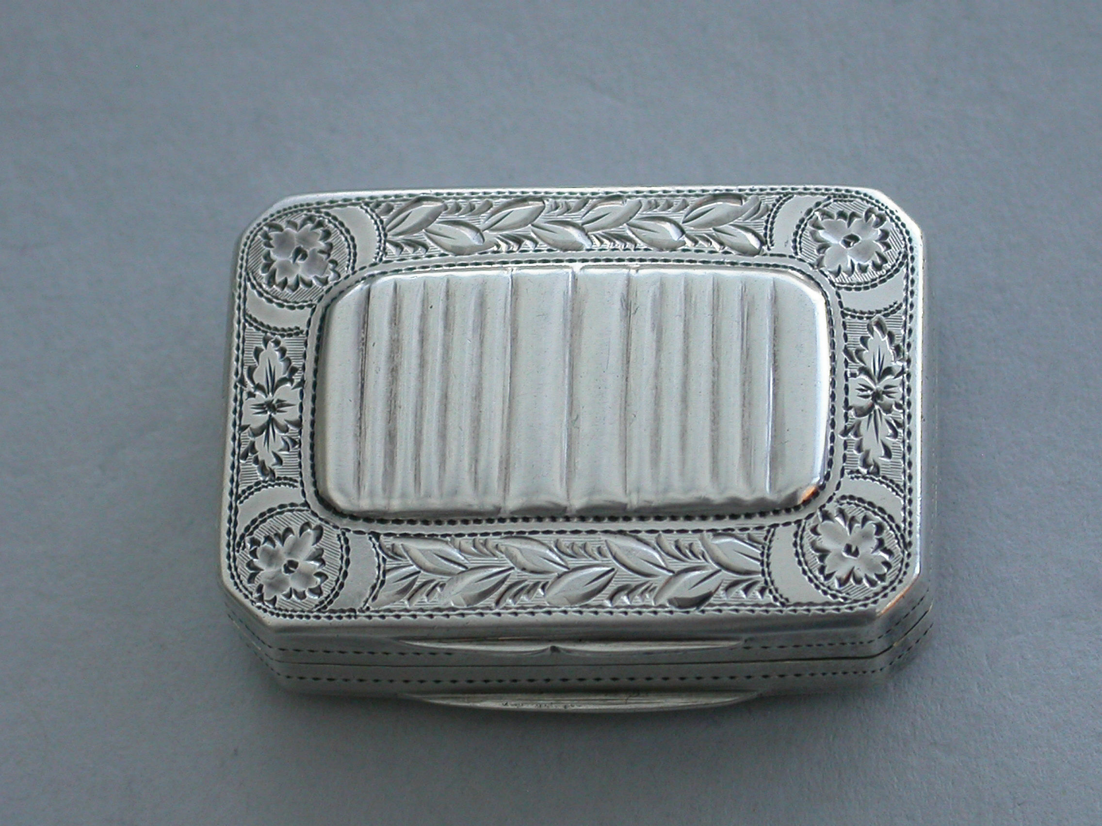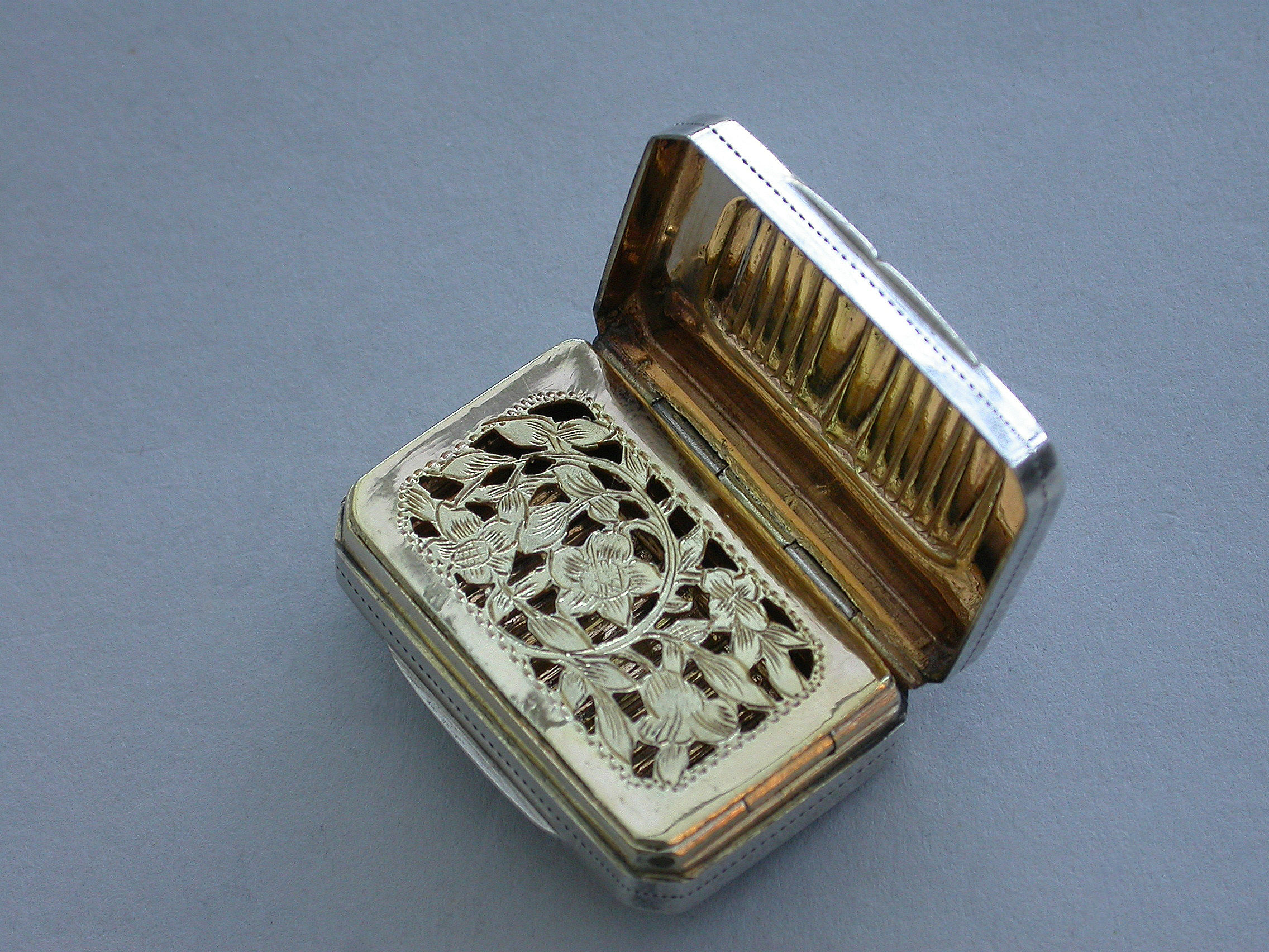 A fine George III silver Vinaigrette decorated with unusual ribbed centre panels to top and base within bright-cut borders of leaves and flowers. Floral pierced silver gilt grille.