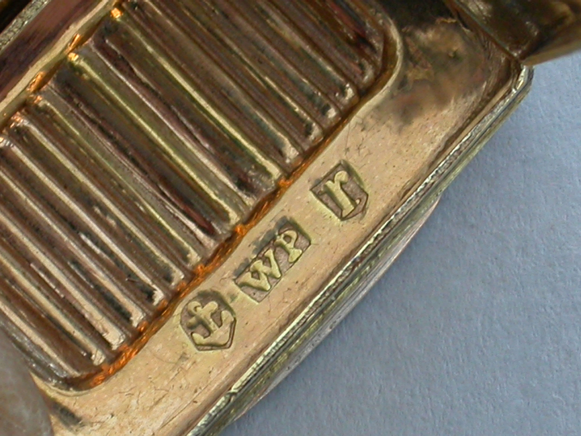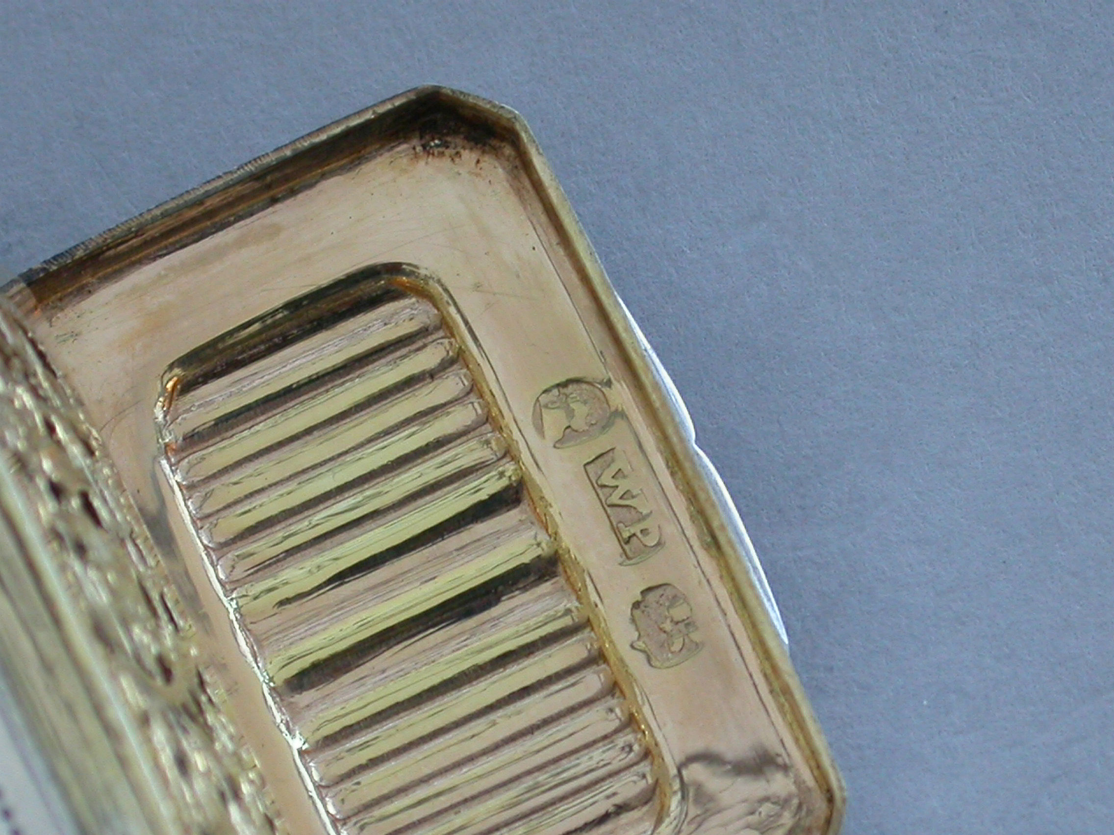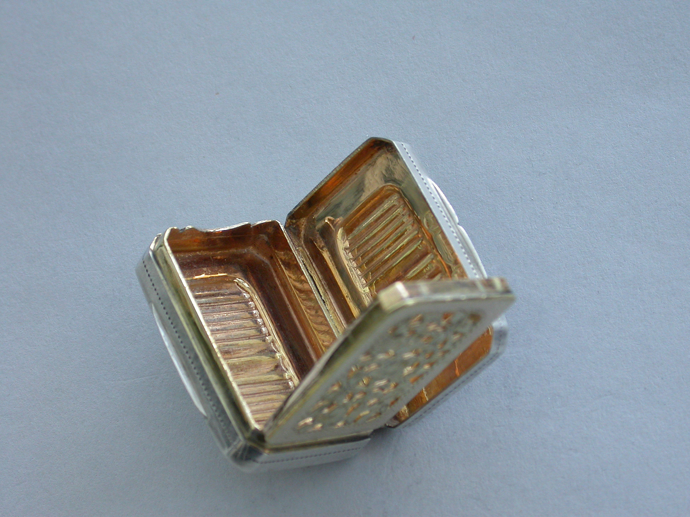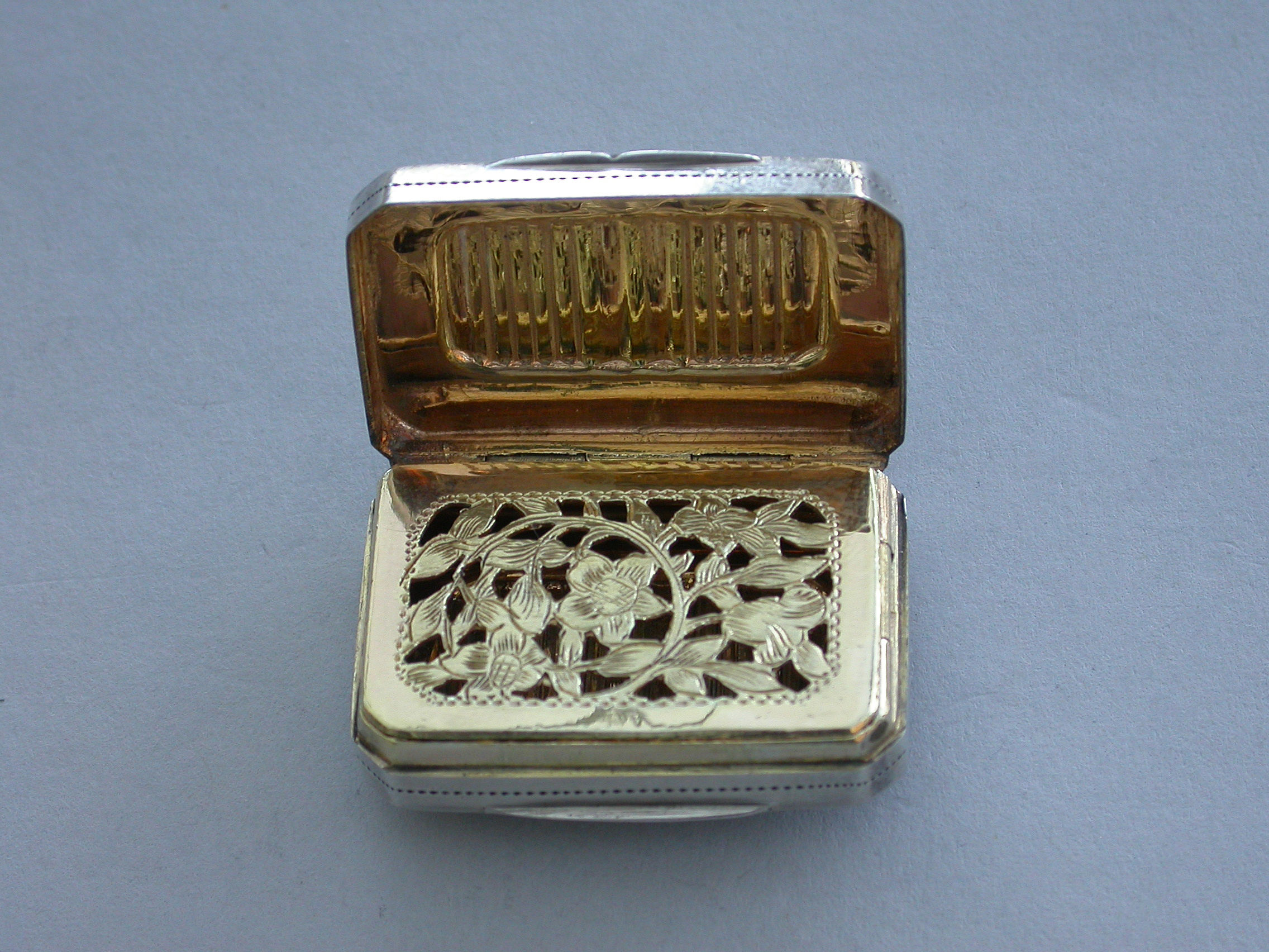 A fine George III silver Vinaigrette decorated with unusual ribbed centre panels to top and base within bright-cut borders of leaves and flowers. Floral pierced silver gilt grille.