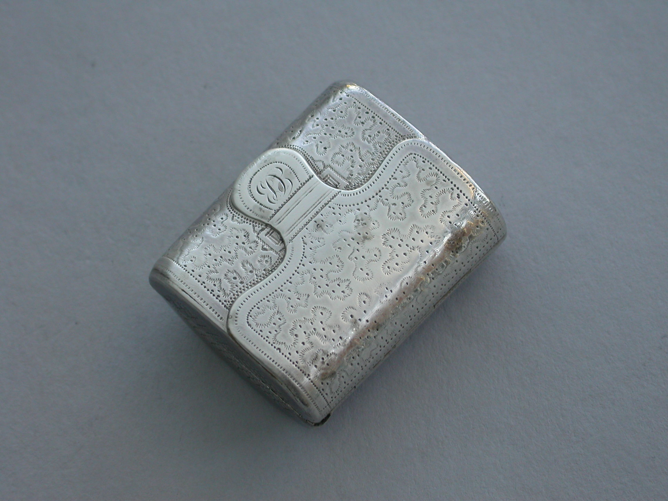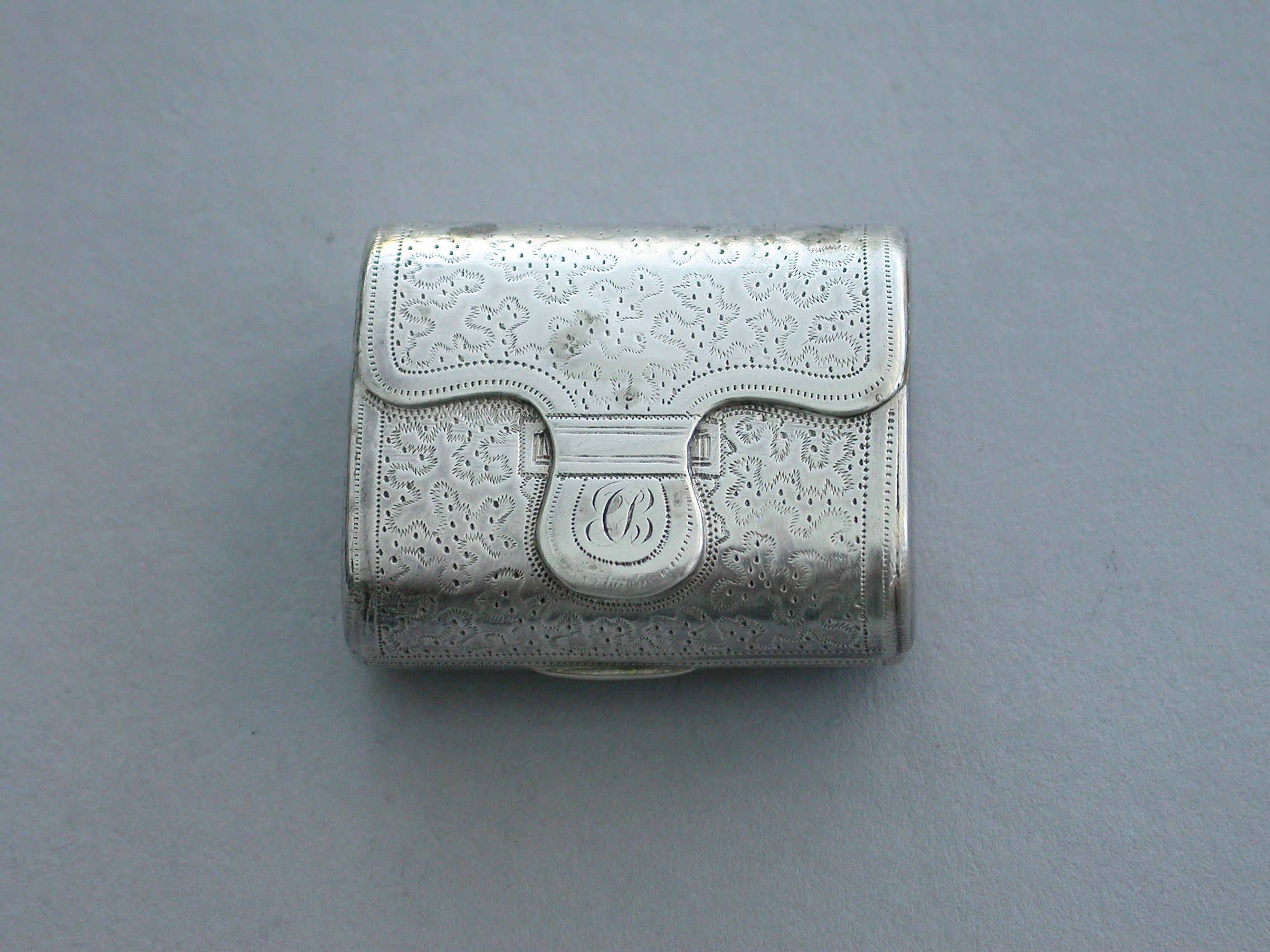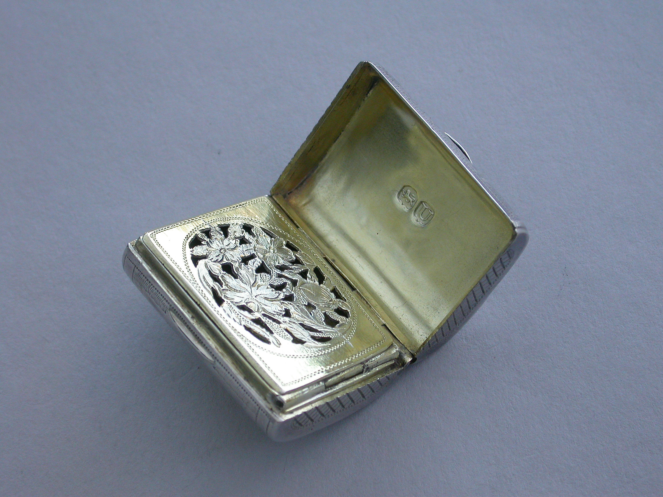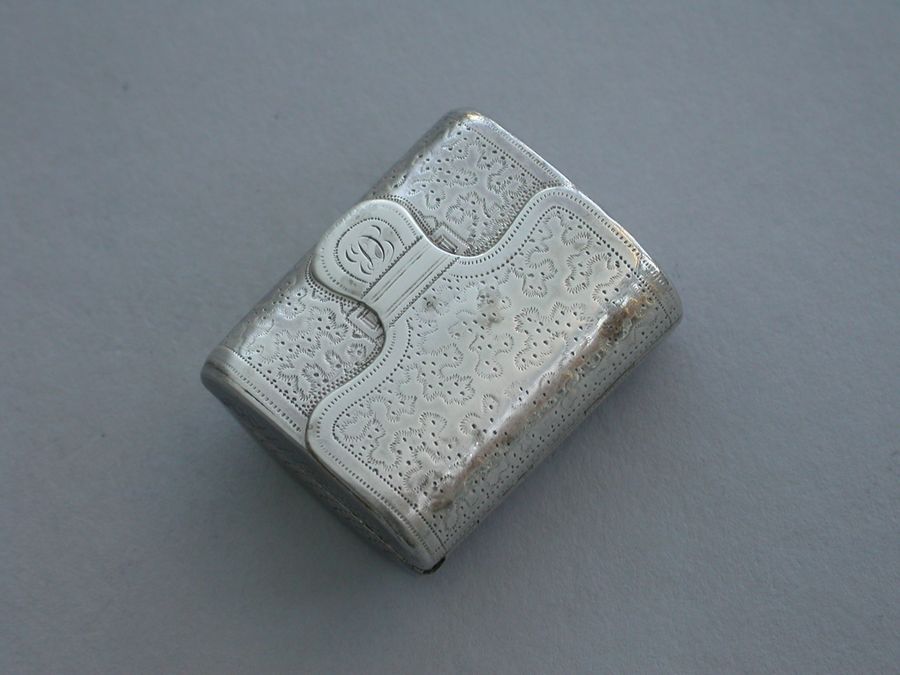 A good George III novelty silver Vinaigrette formed as a wallet with monogram 'ECB' on the tongue, the cover with all-over patterning of prick-dot vermicelli, the base with framed central flower head within decorative borders and cross-hatching to the sides. The silver gilt grille with central panel of flowers and leaves.