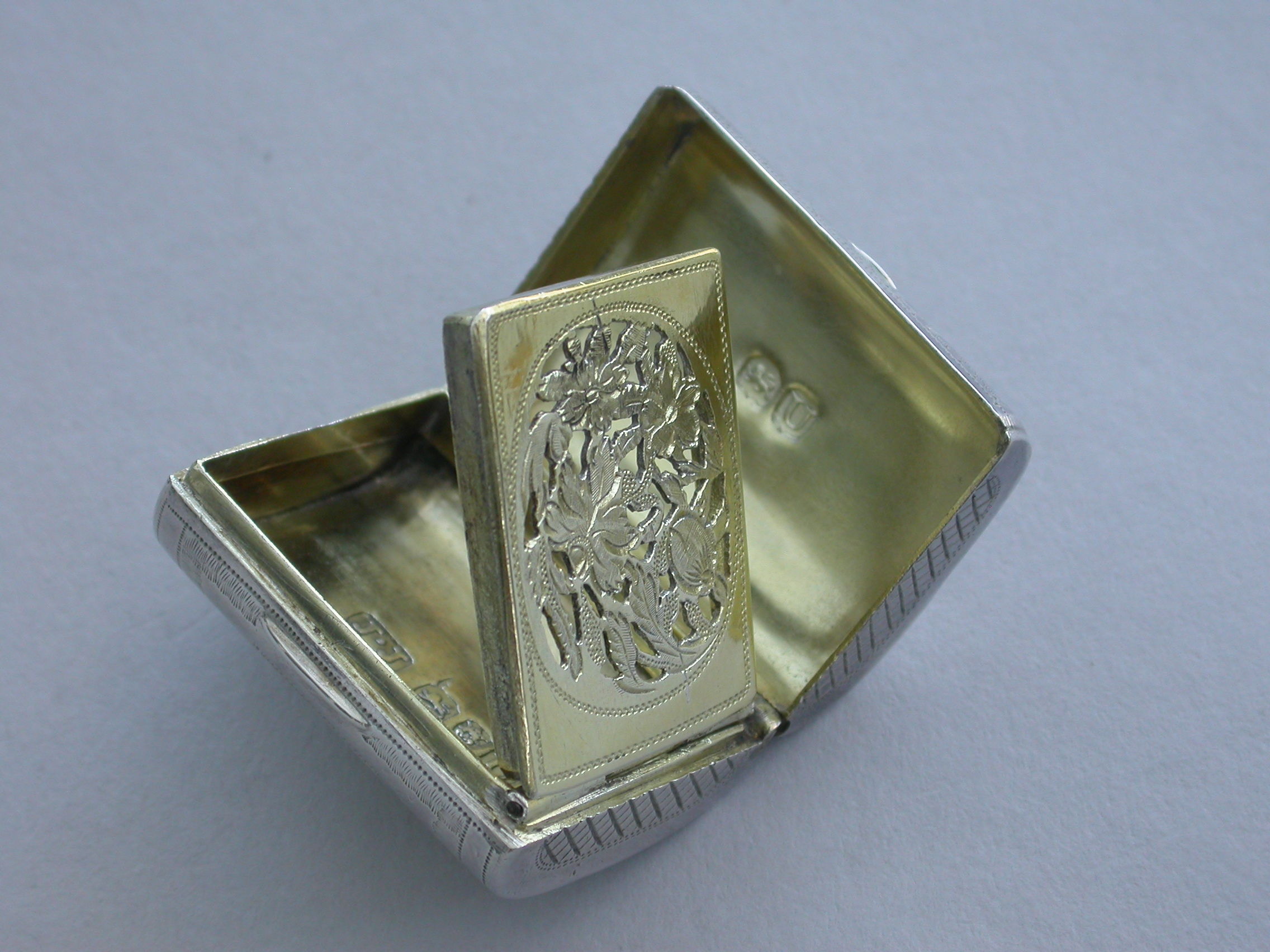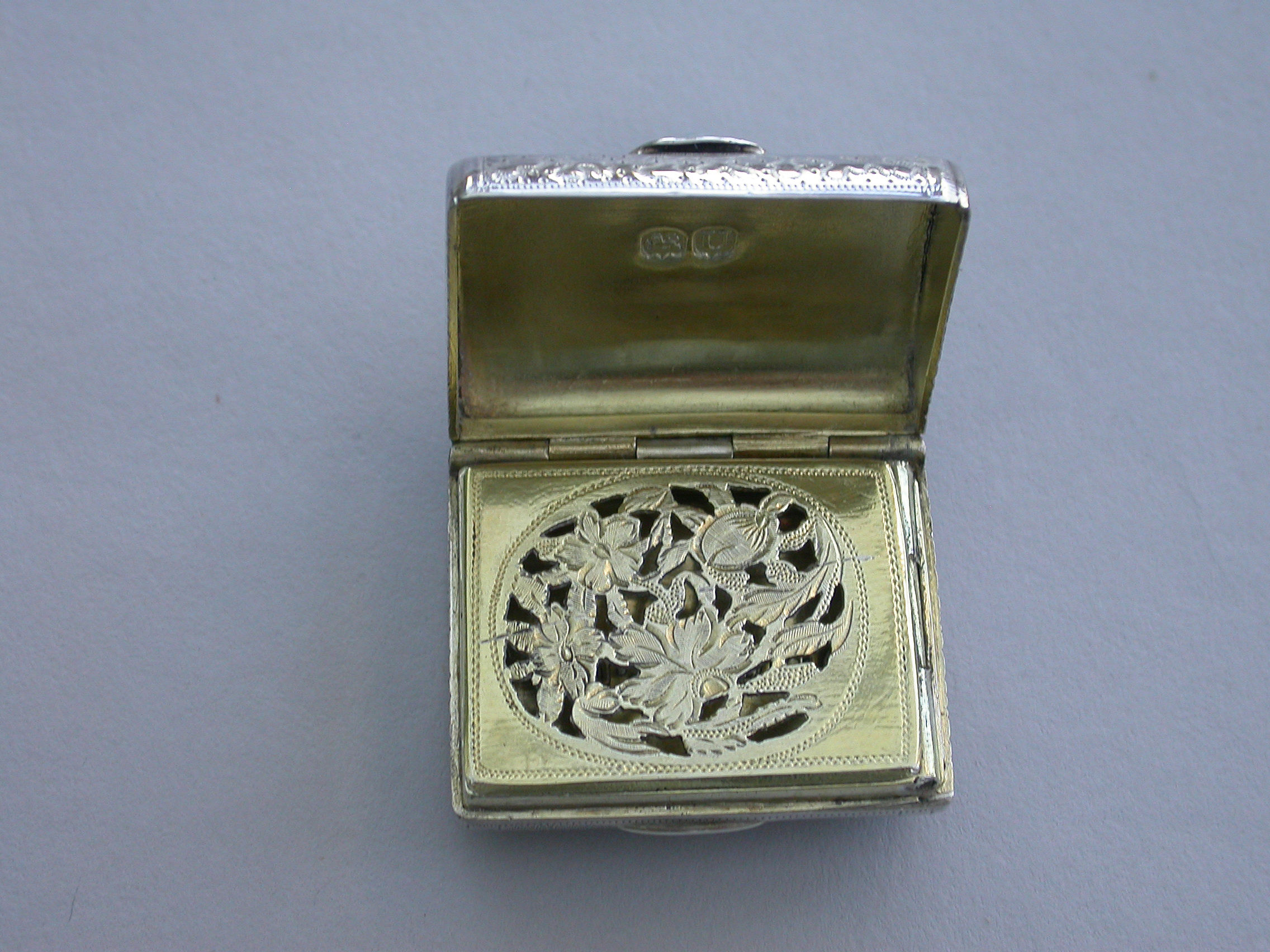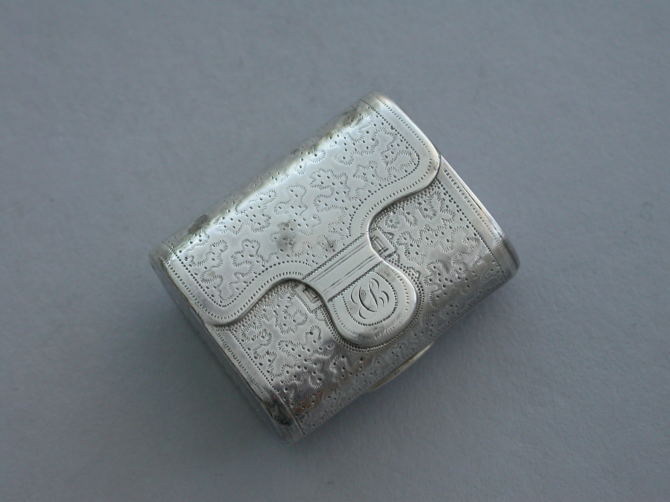 A good George III novelty silver Vinaigrette formed as a wallet with monogram 'ECB' on the tongue, the cover with all-over patterning of prick-dot vermicelli, the base with framed central flower head within decorative borders and cross-hatching to the sides. The silver gilt grille with central panel of flowers and leaves.