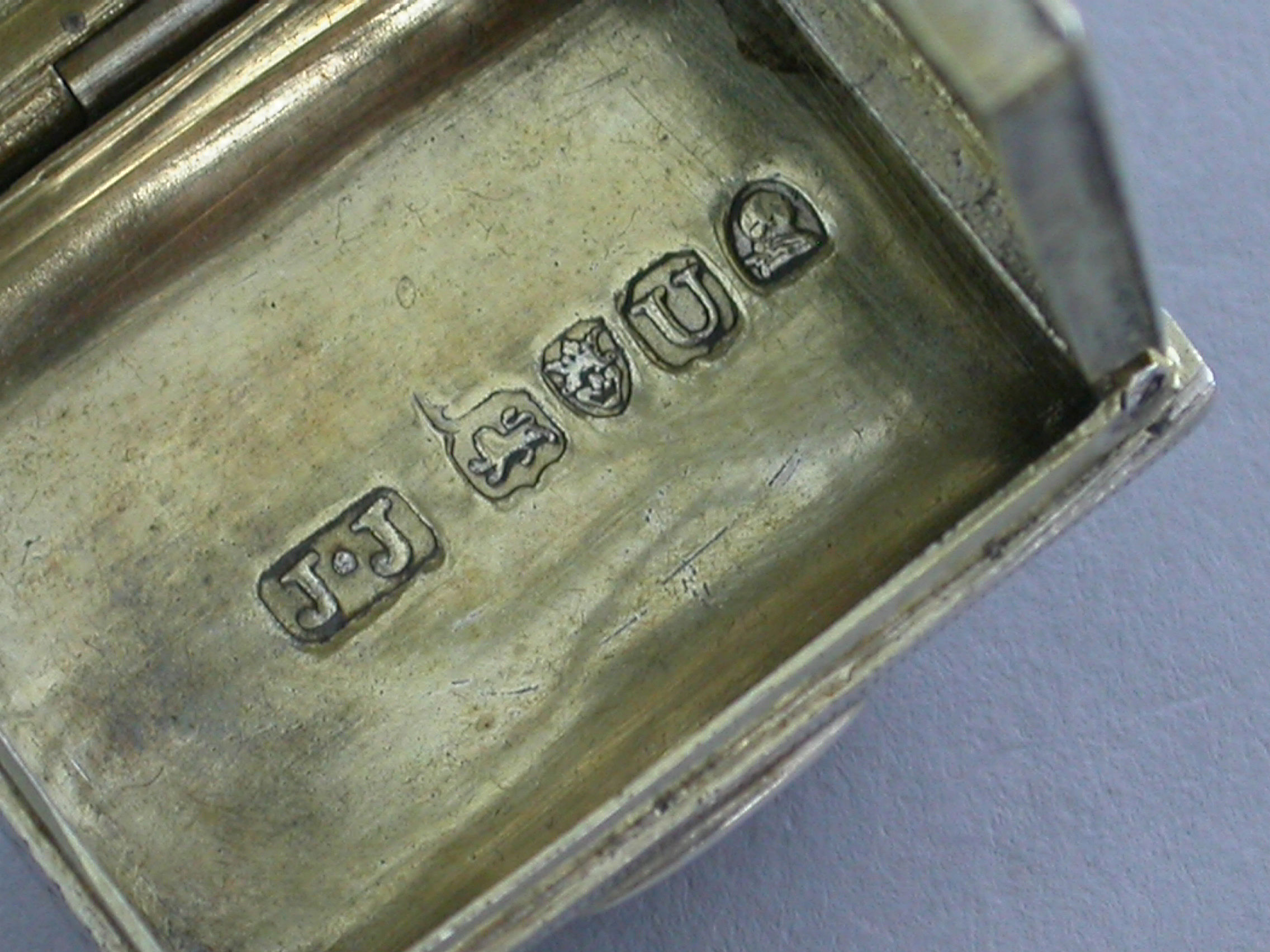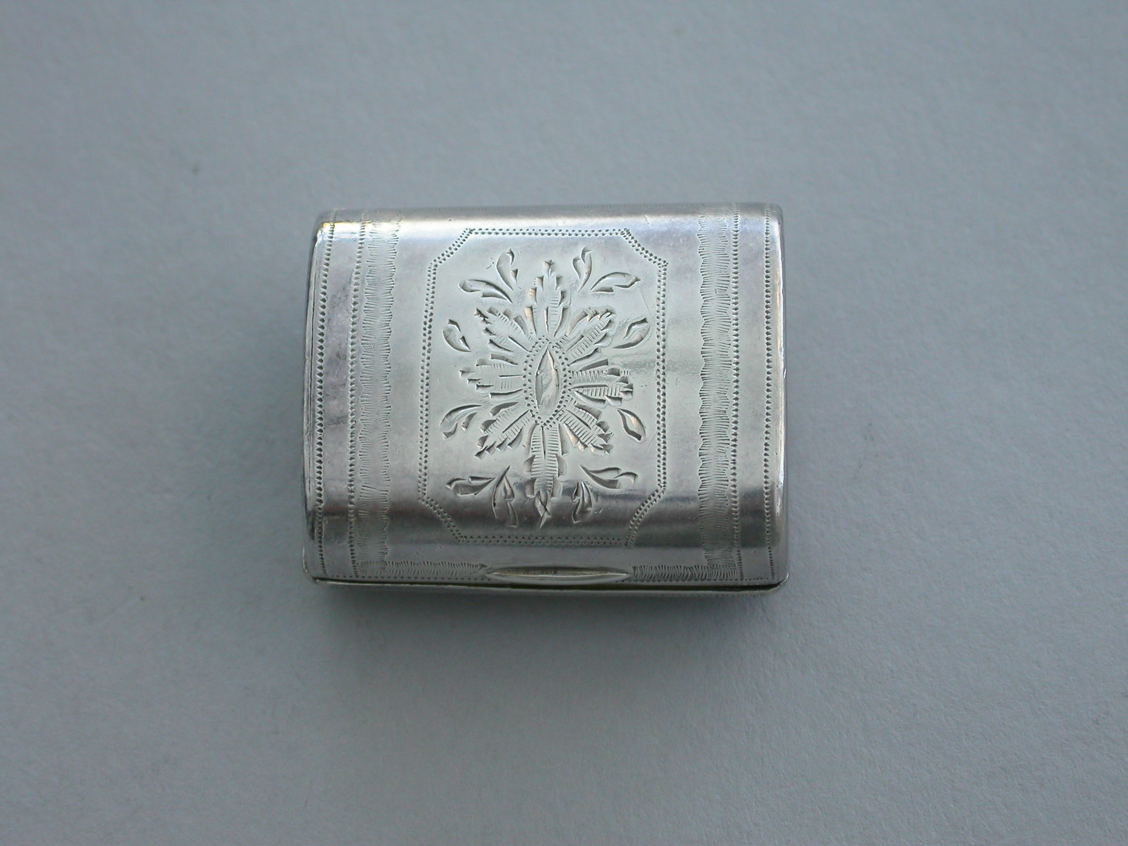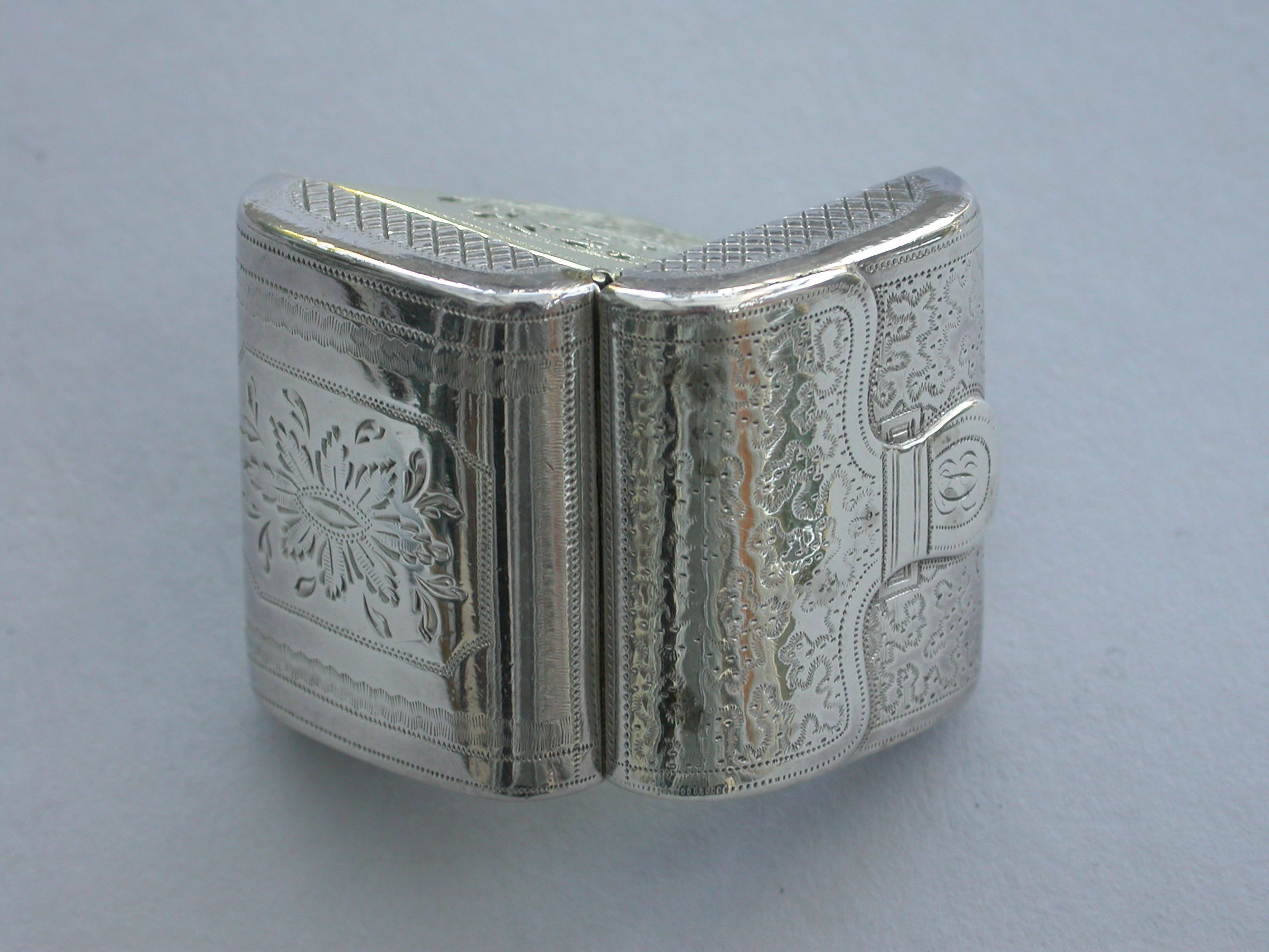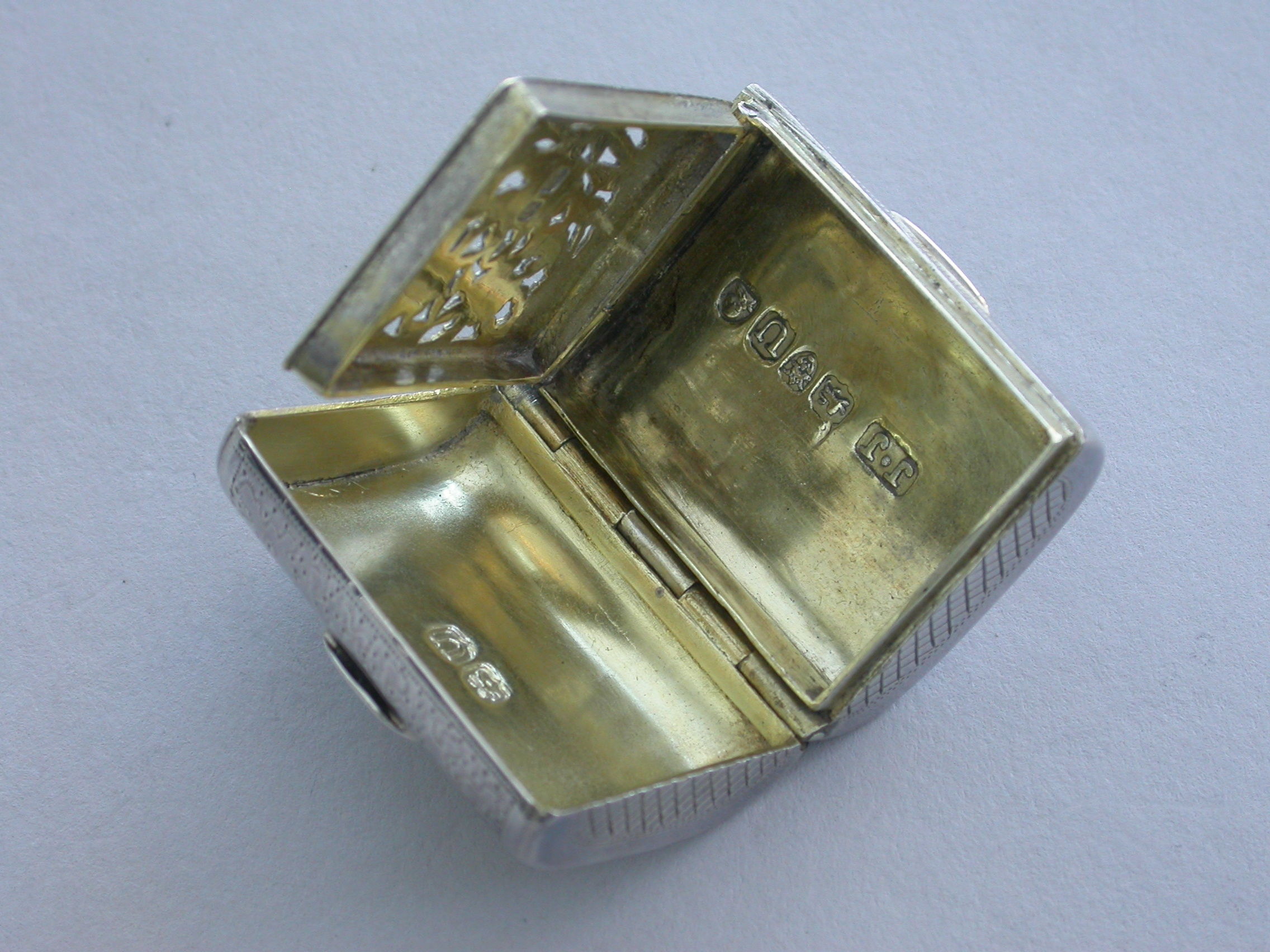 A good George III novelty silver Vinaigrette formed as a wallet with monogram 'ECB' on the tongue, the cover with all-over patterning of prick-dot vermicelli, the base with framed central flower head within decorative borders and cross-hatching to the sides. The silver gilt grille with central panel of flowers and leaves.