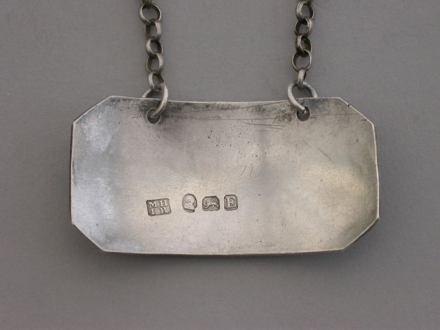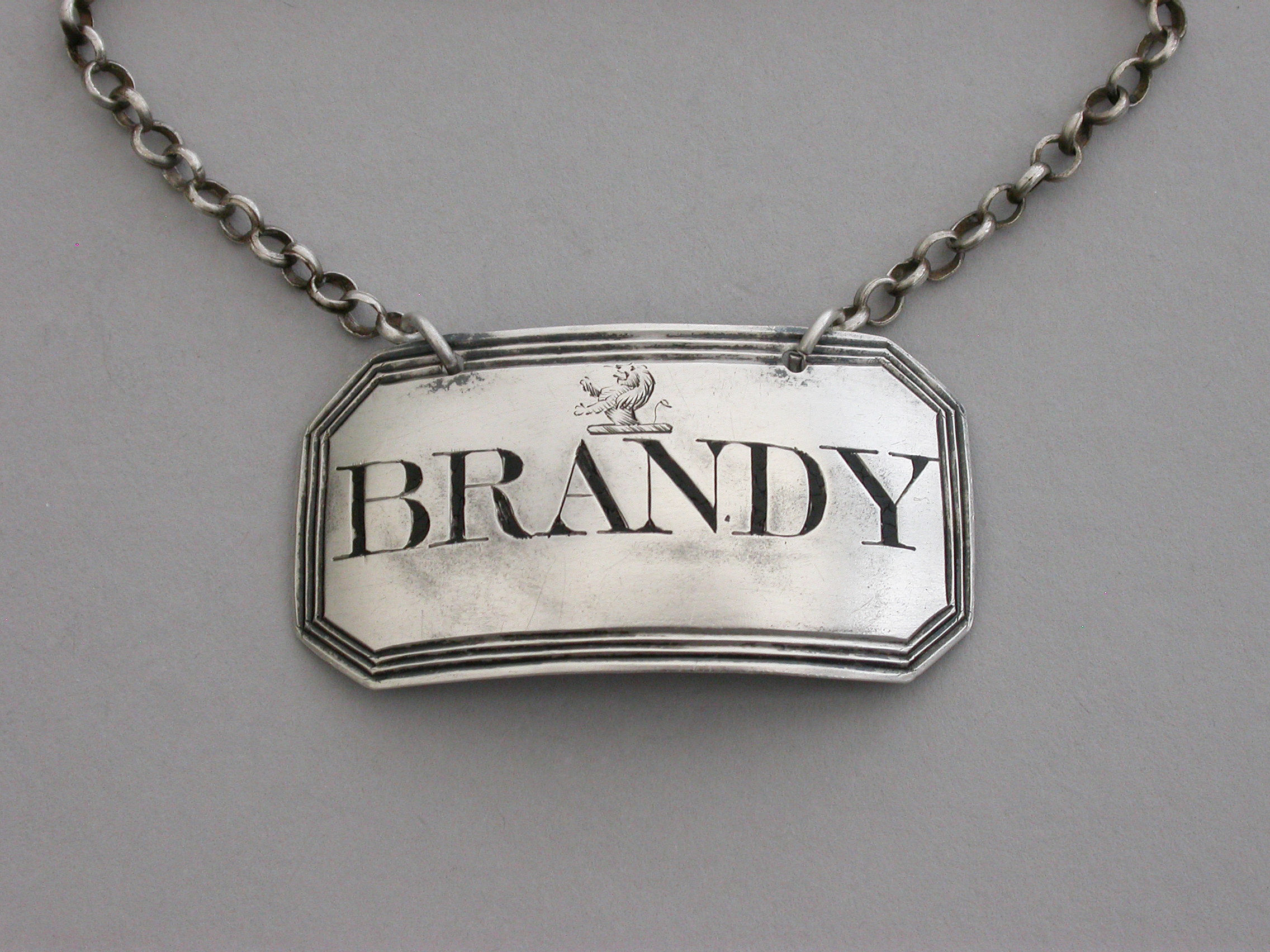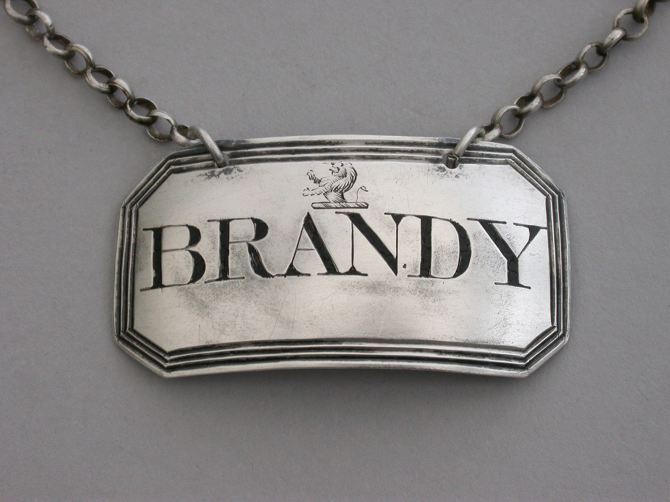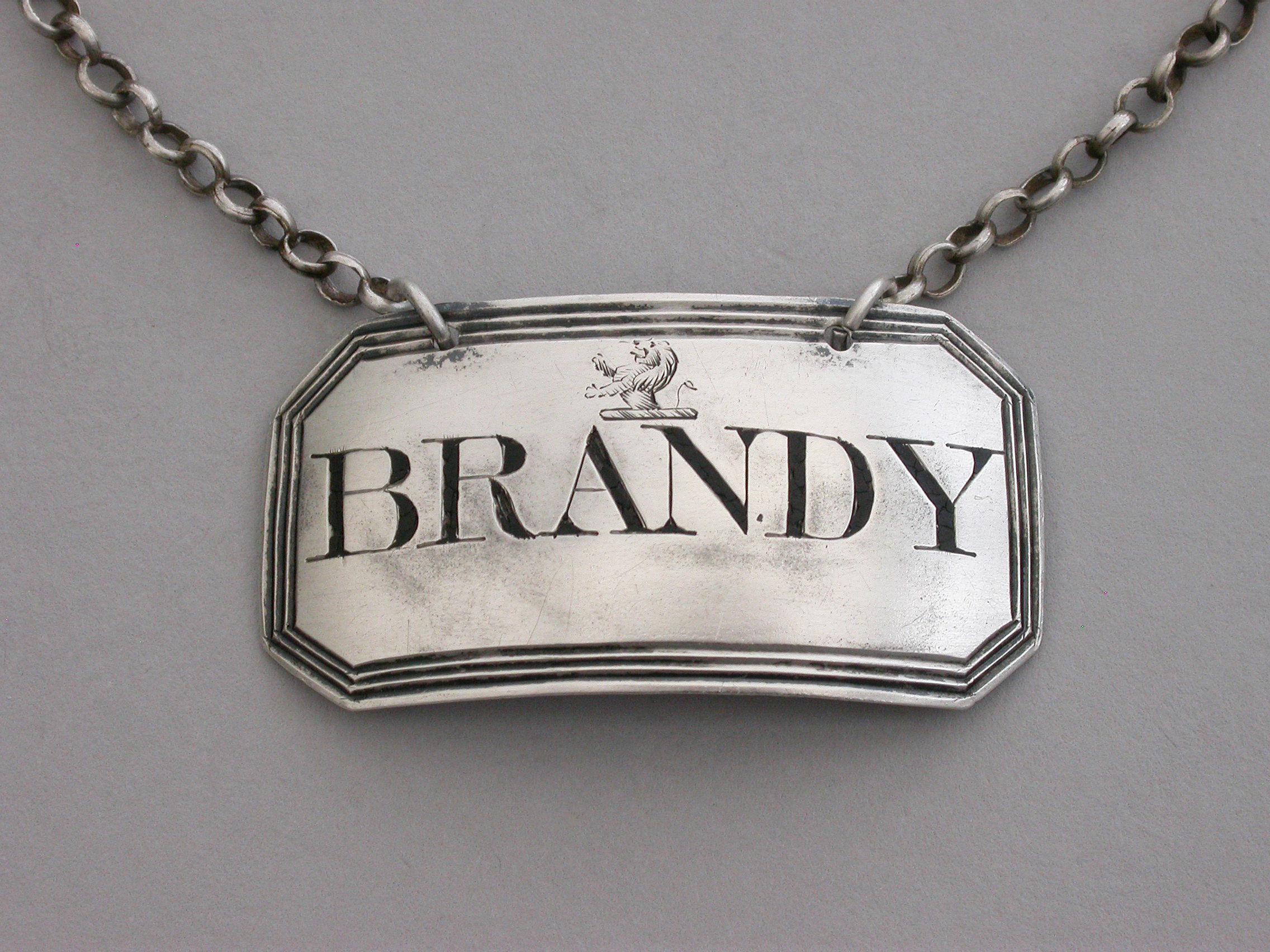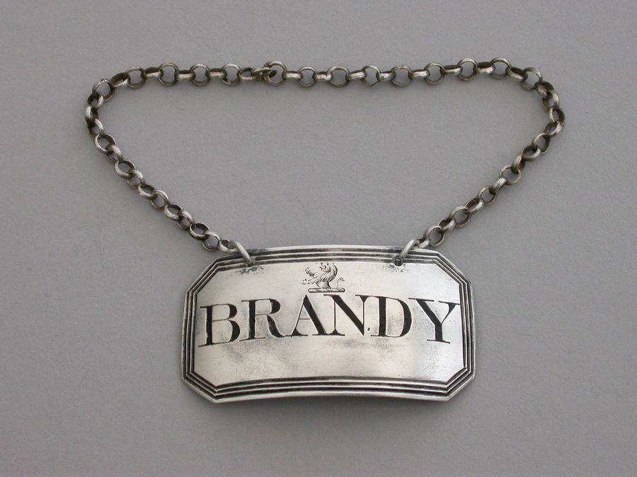 A rare George III silver Wine Label of cut-cornered rectangular form with triple reeded border, incised for Brandy below an armorial crest depicting a demi lion rampant.