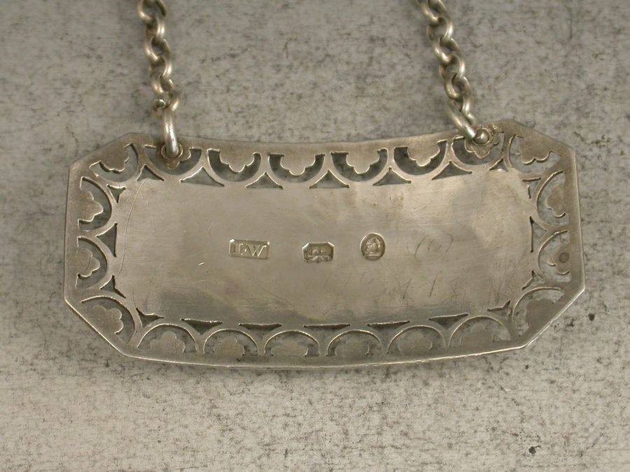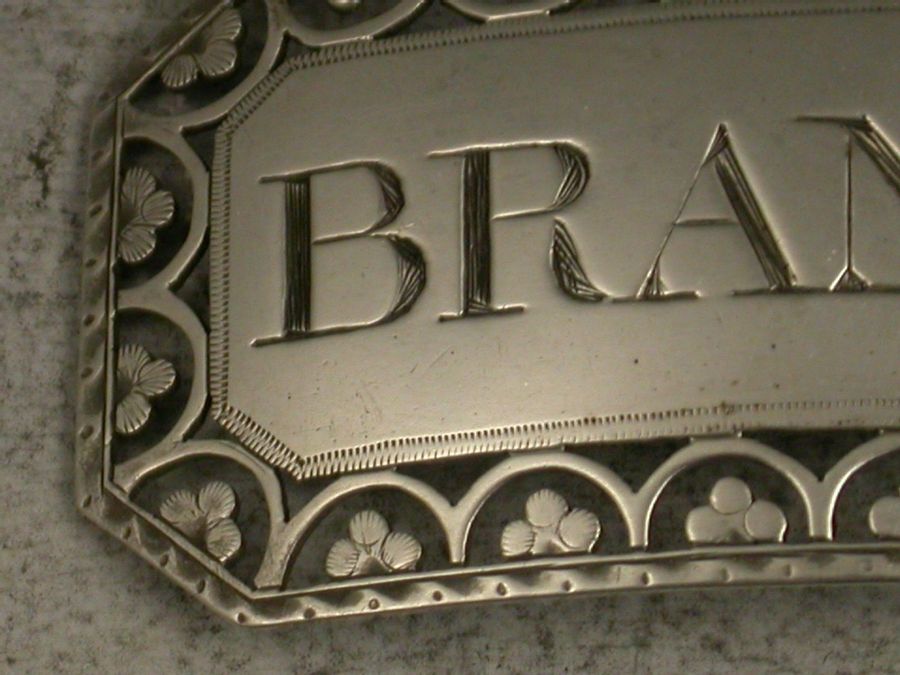 A fine George III silver Wine Label of rectangular form with cut-corners, intricately pierced and bright-cut engraved border of hoops and trefoils, incised for Brandy.