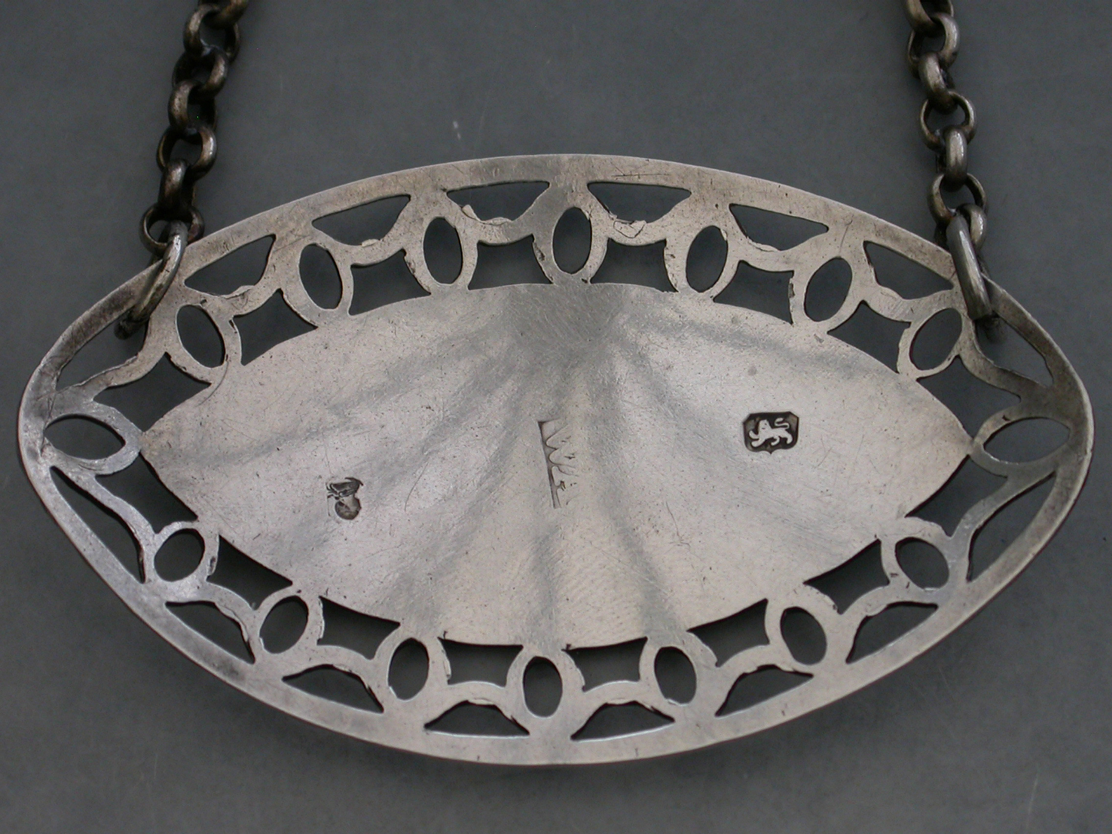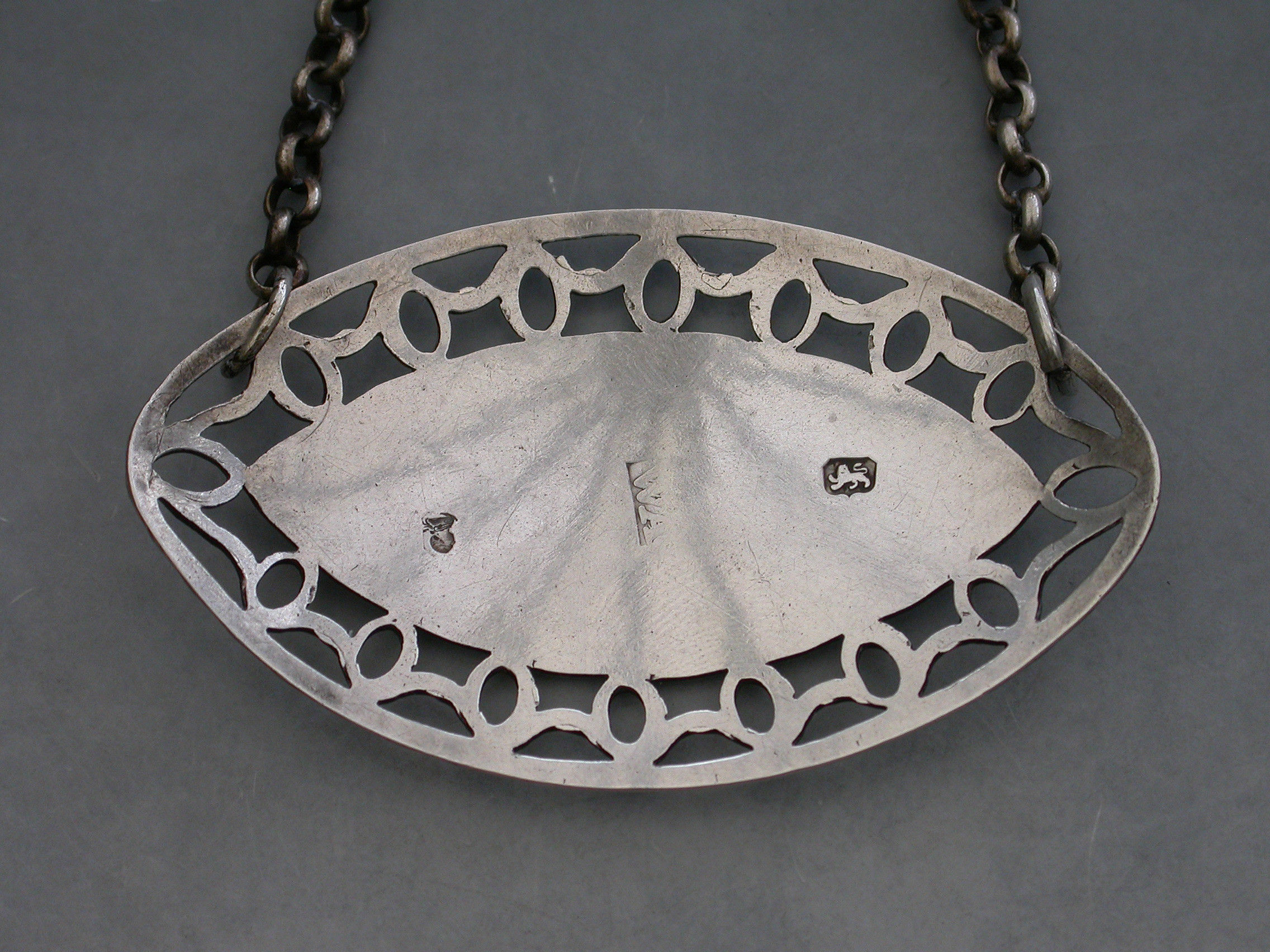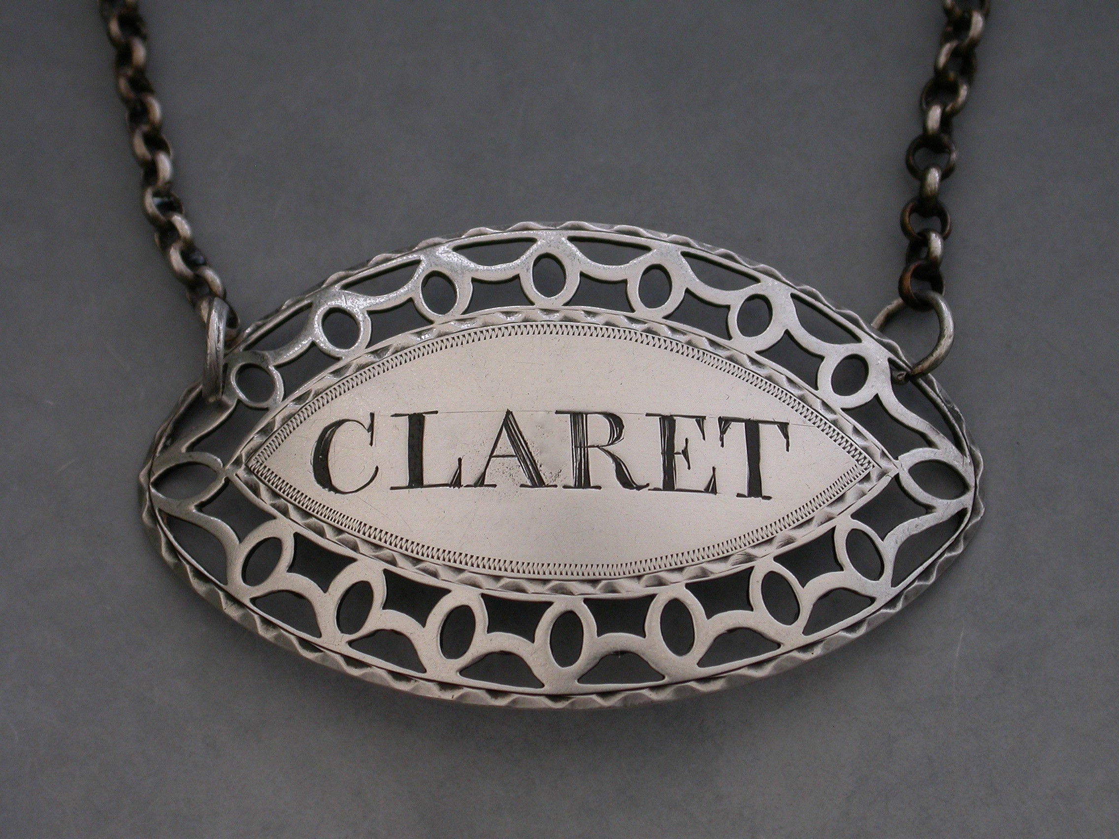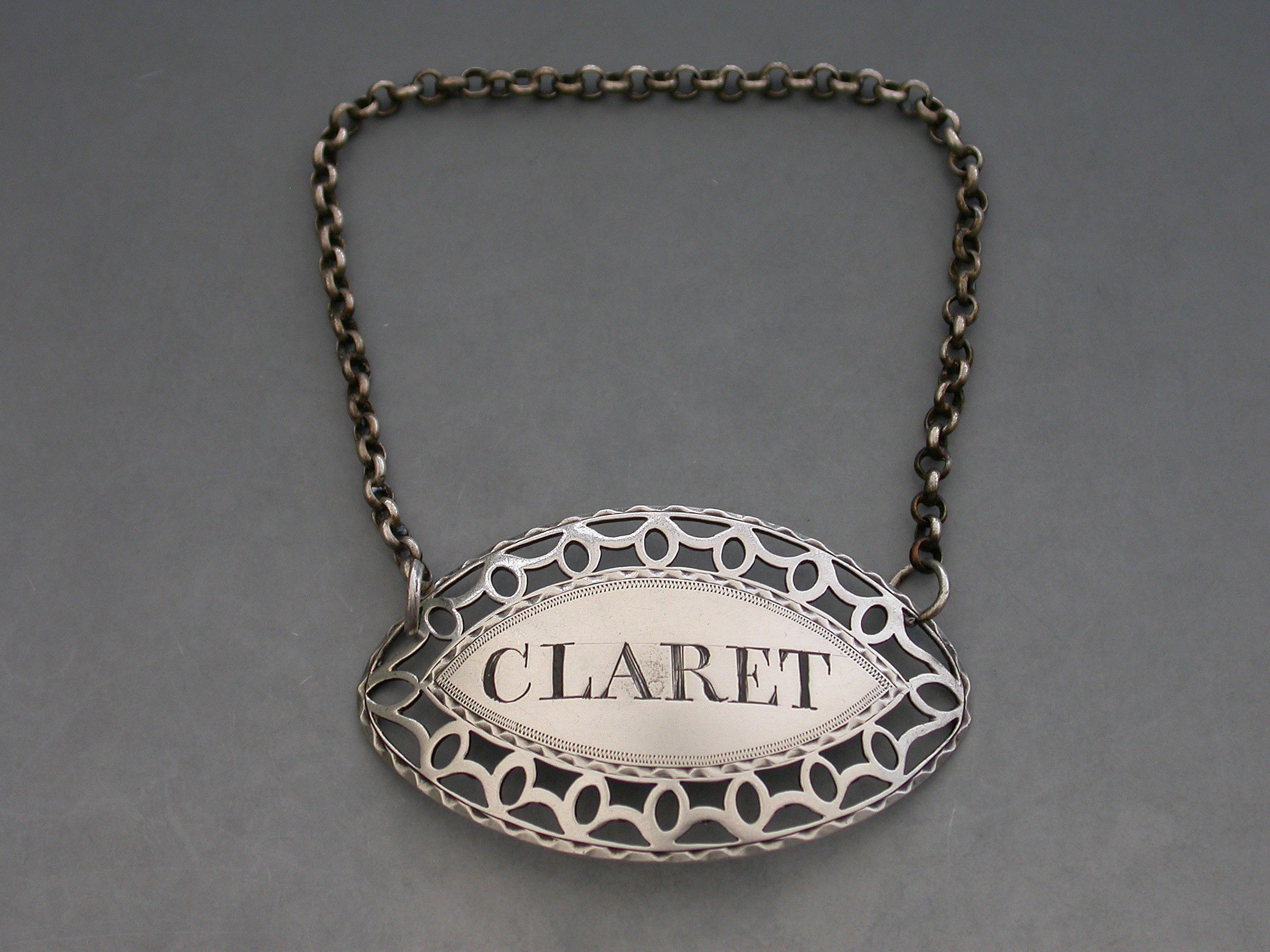 A fine George III silver Wine Label of pierced eye shape with bright-cut engraved decoration and a pierced border of interlinked ovals (a design unique to William Abdy). Incised for Claret.