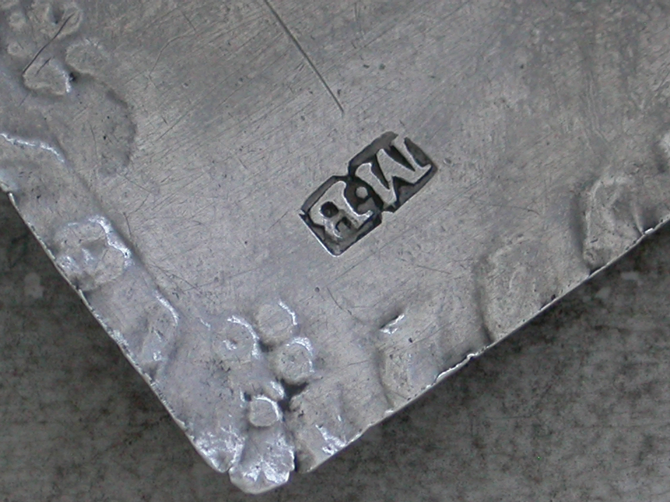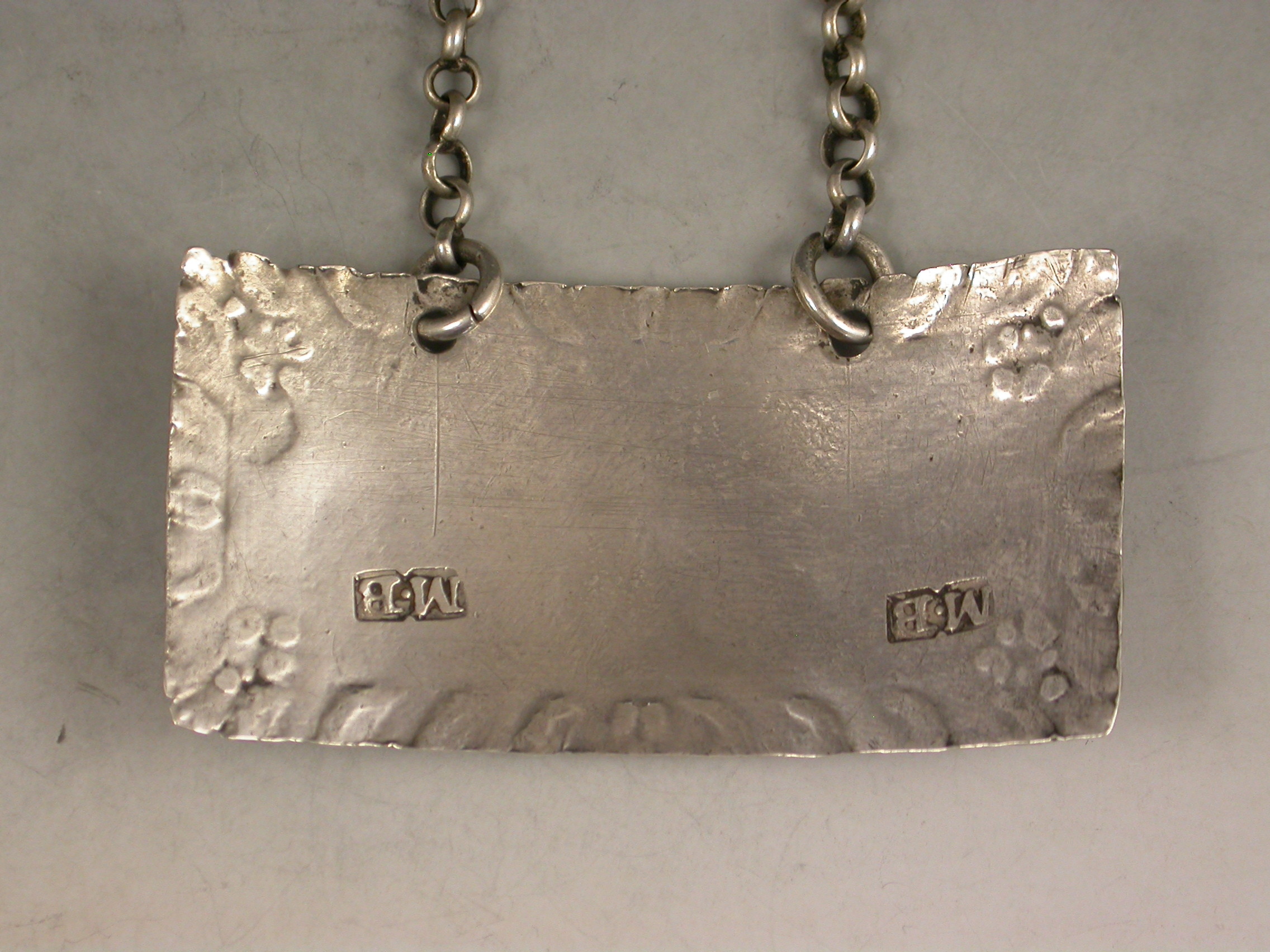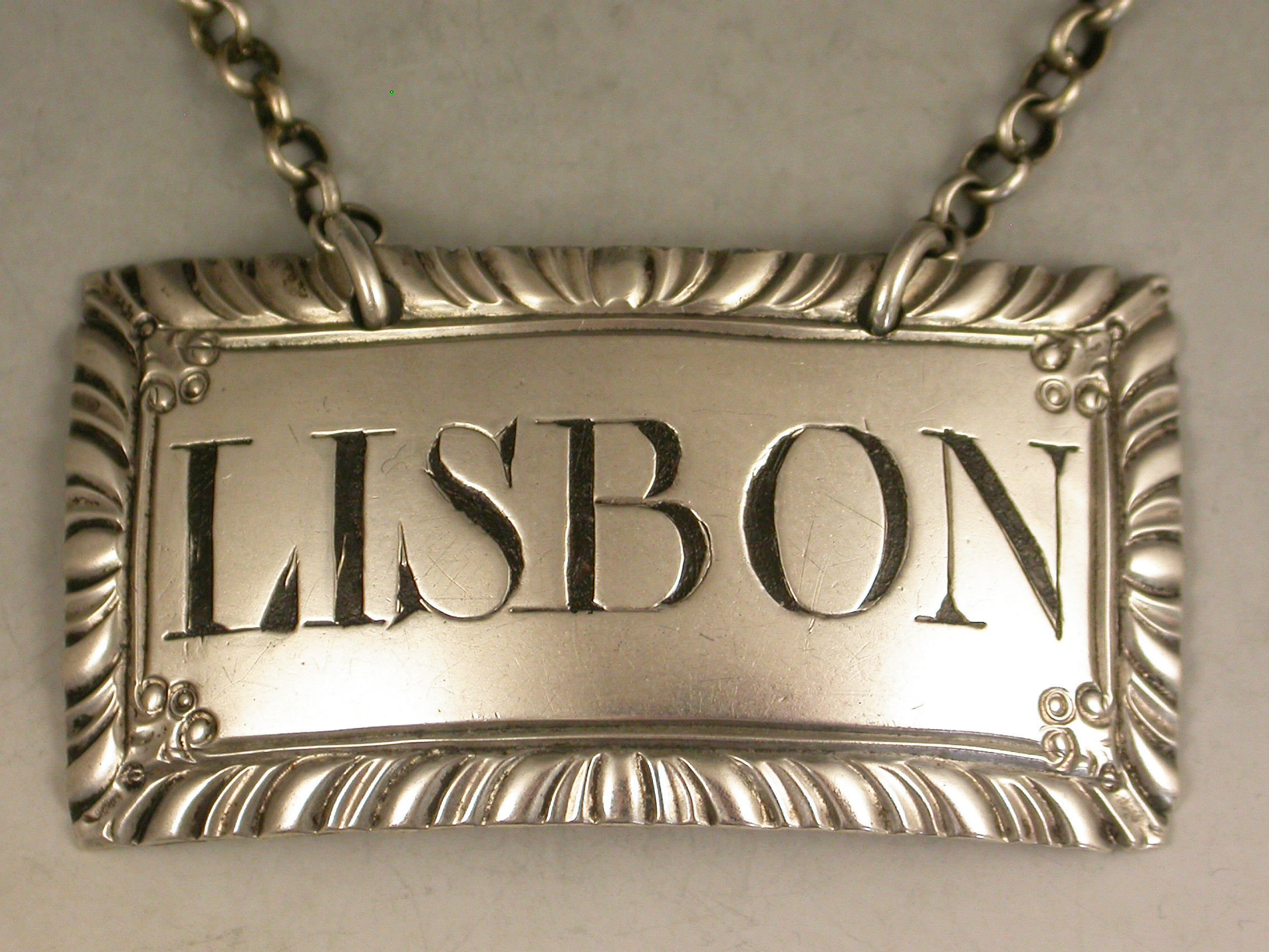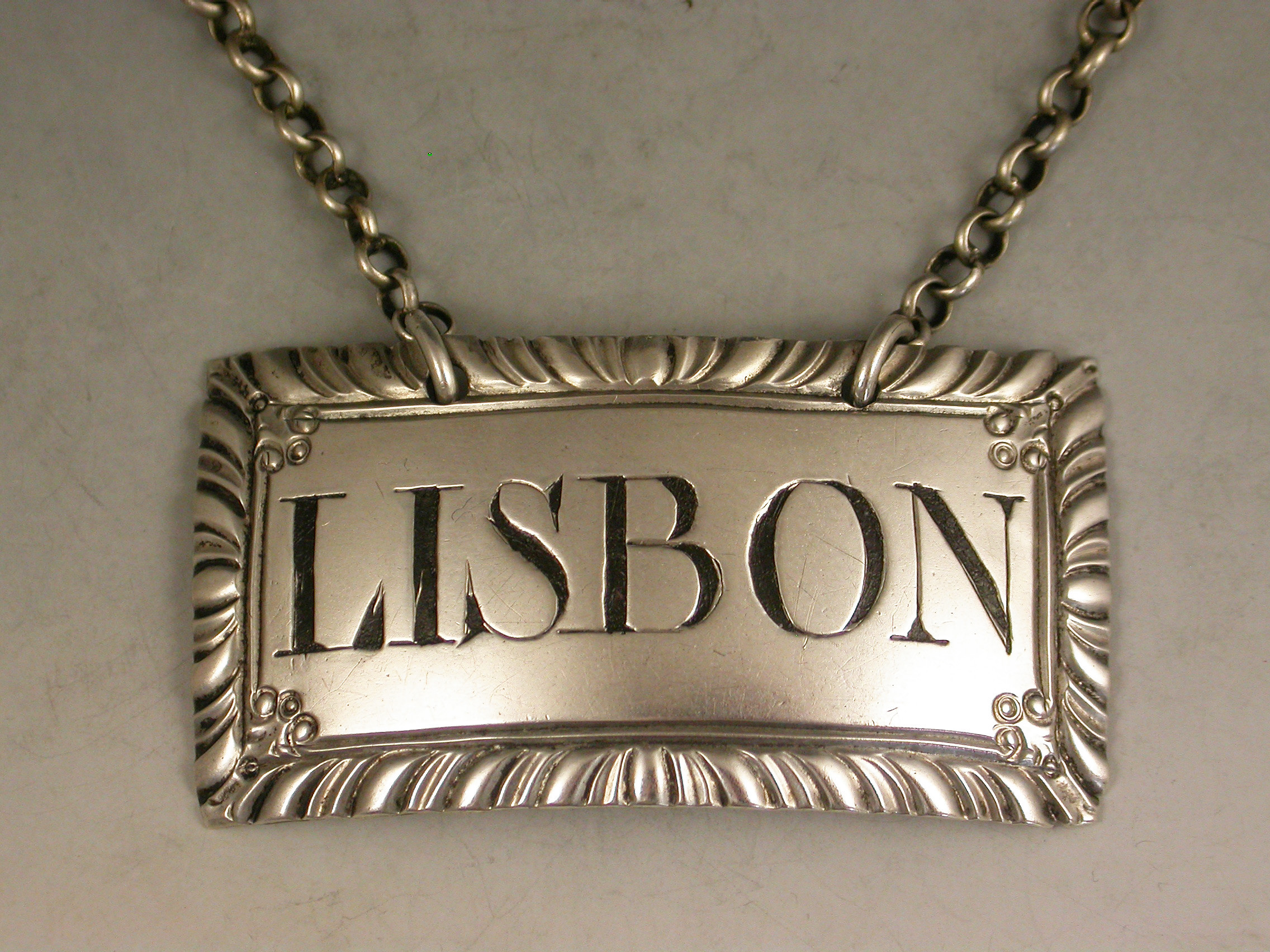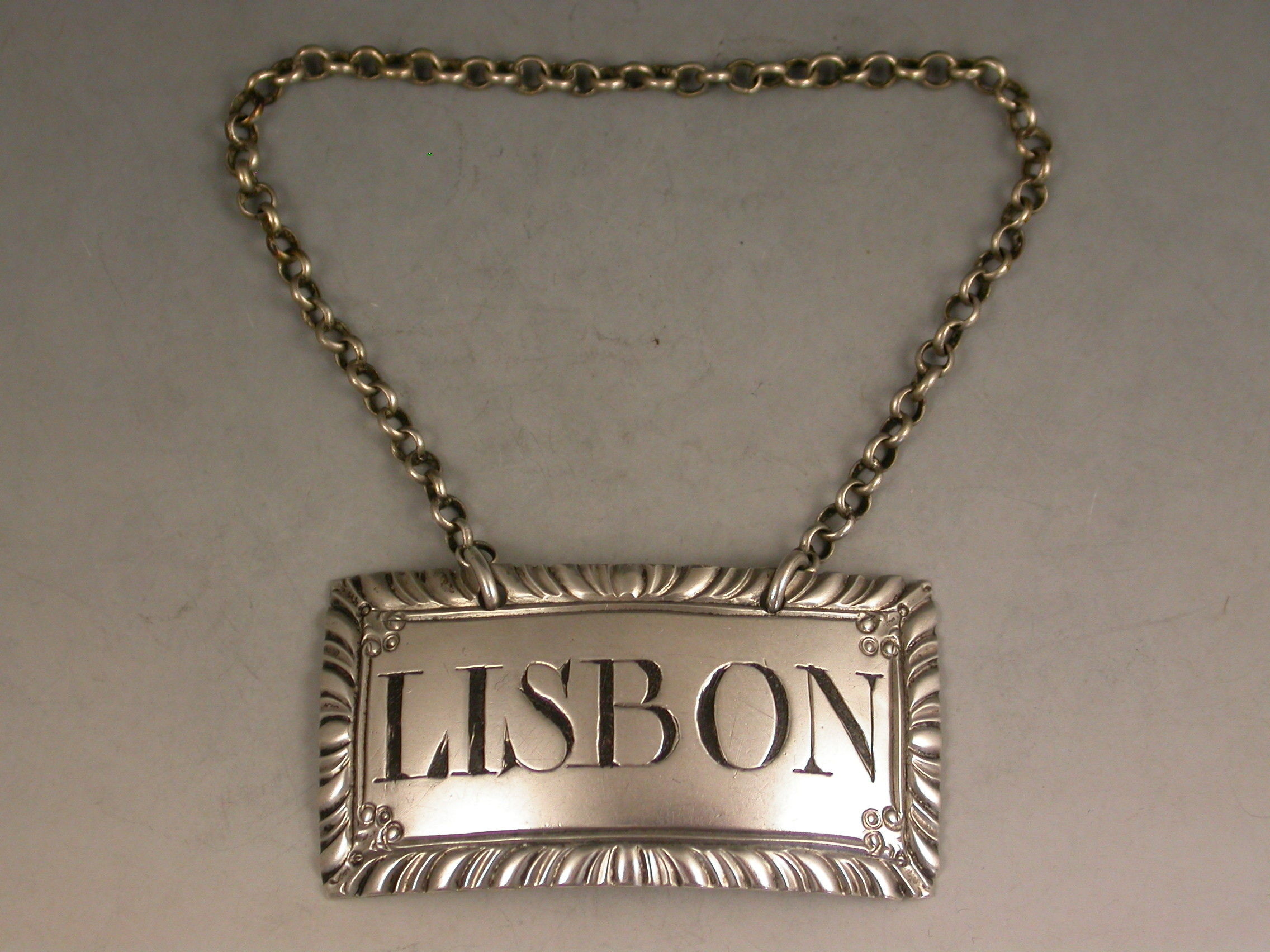 A good early George III silver Wine Label of broad rectangular form with feather edge border and a chased device to each corner of the plain name plate incised for Lisbon in large lettering.