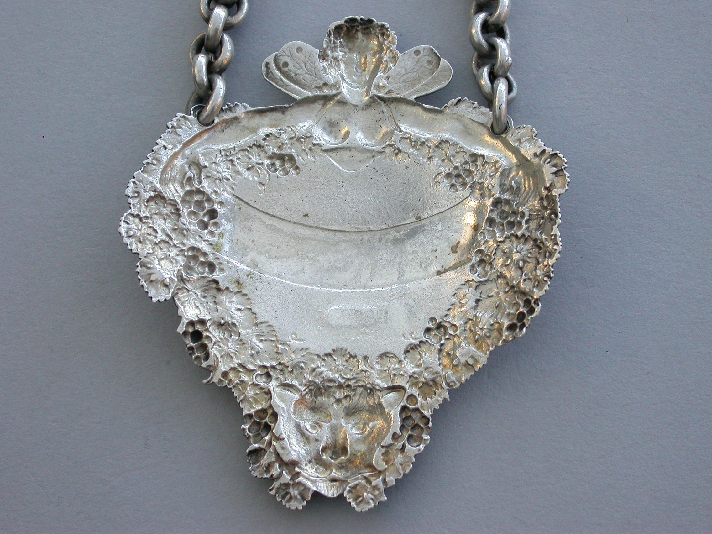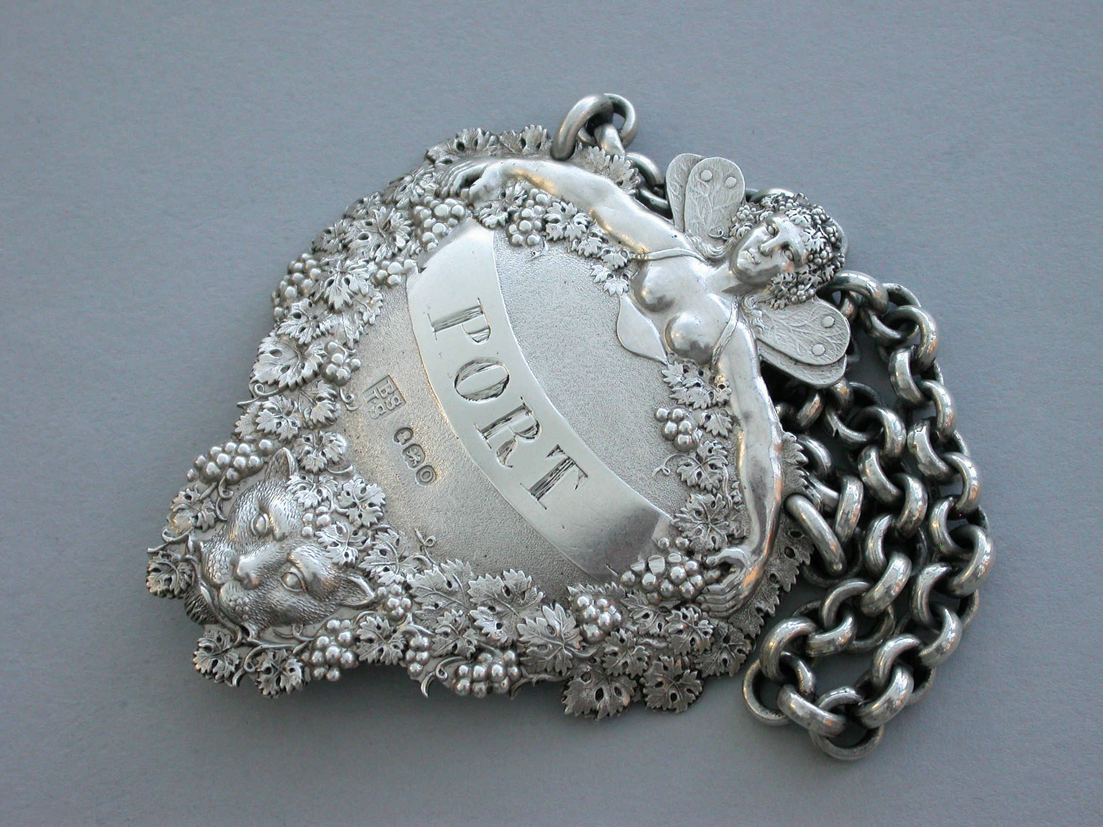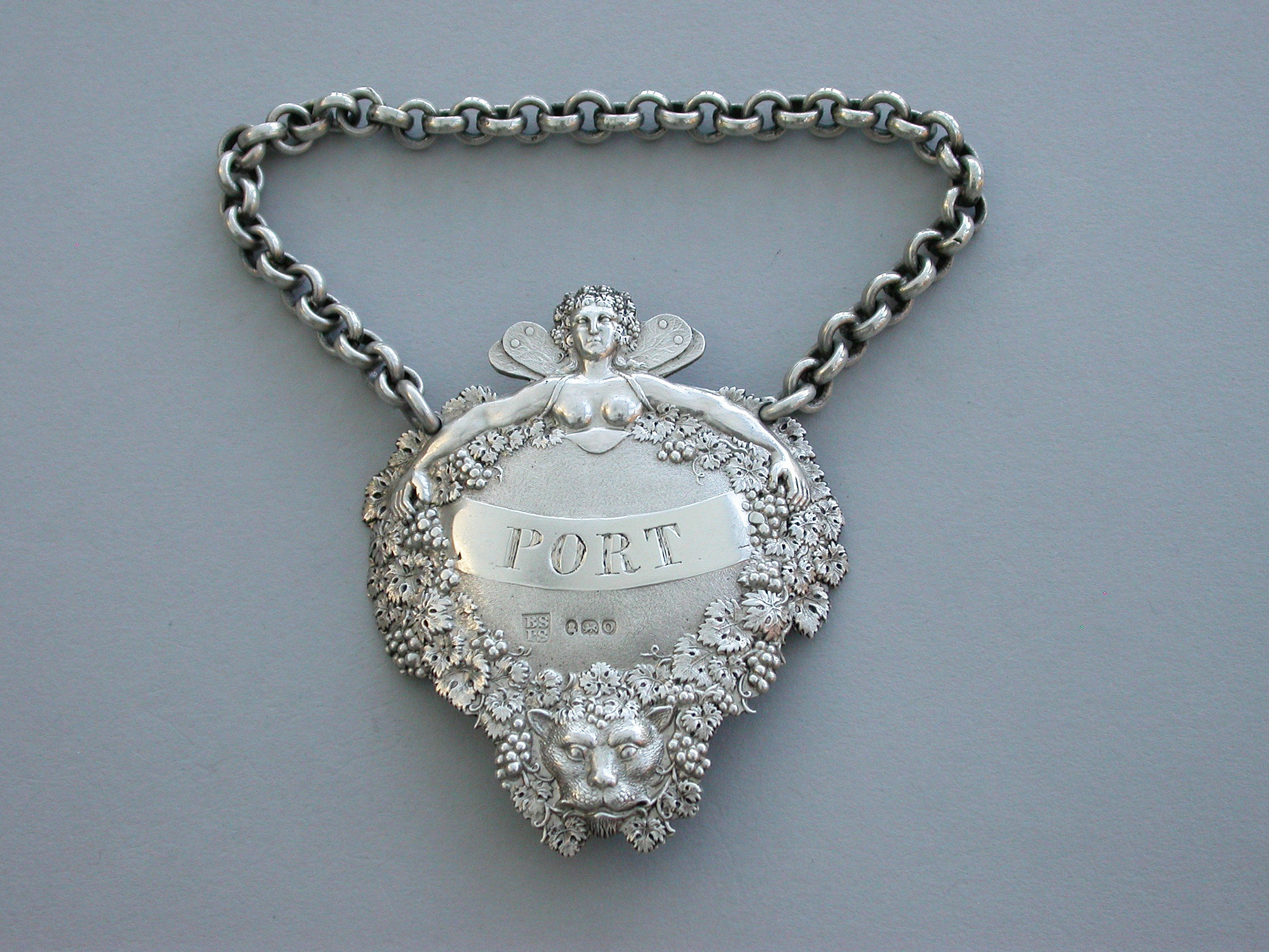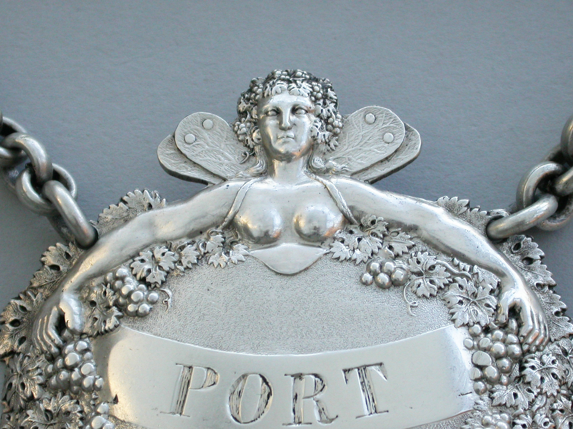 An extremely fine and rare George III silver Wine Label, the shield shaped label surmounted by a naked winged female figure with long outstretched arms and wings, a vine leaf and grape border with lions mask to the base, the plain name plate incised for Port, on a frosted background. Complete with very heavy gauge suspension chain, this is the larger of the two known sizes.
