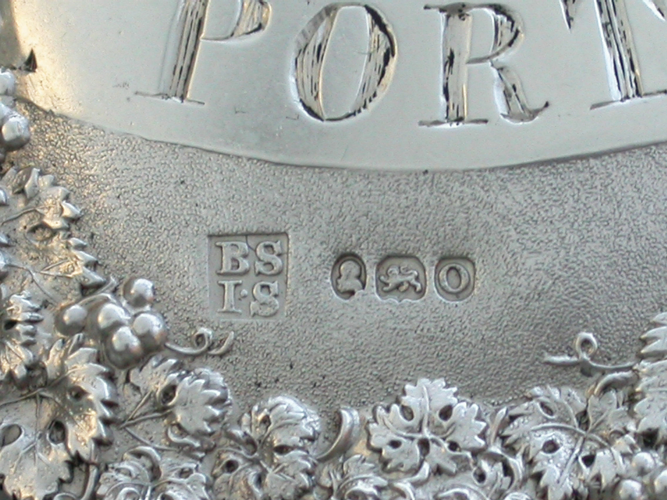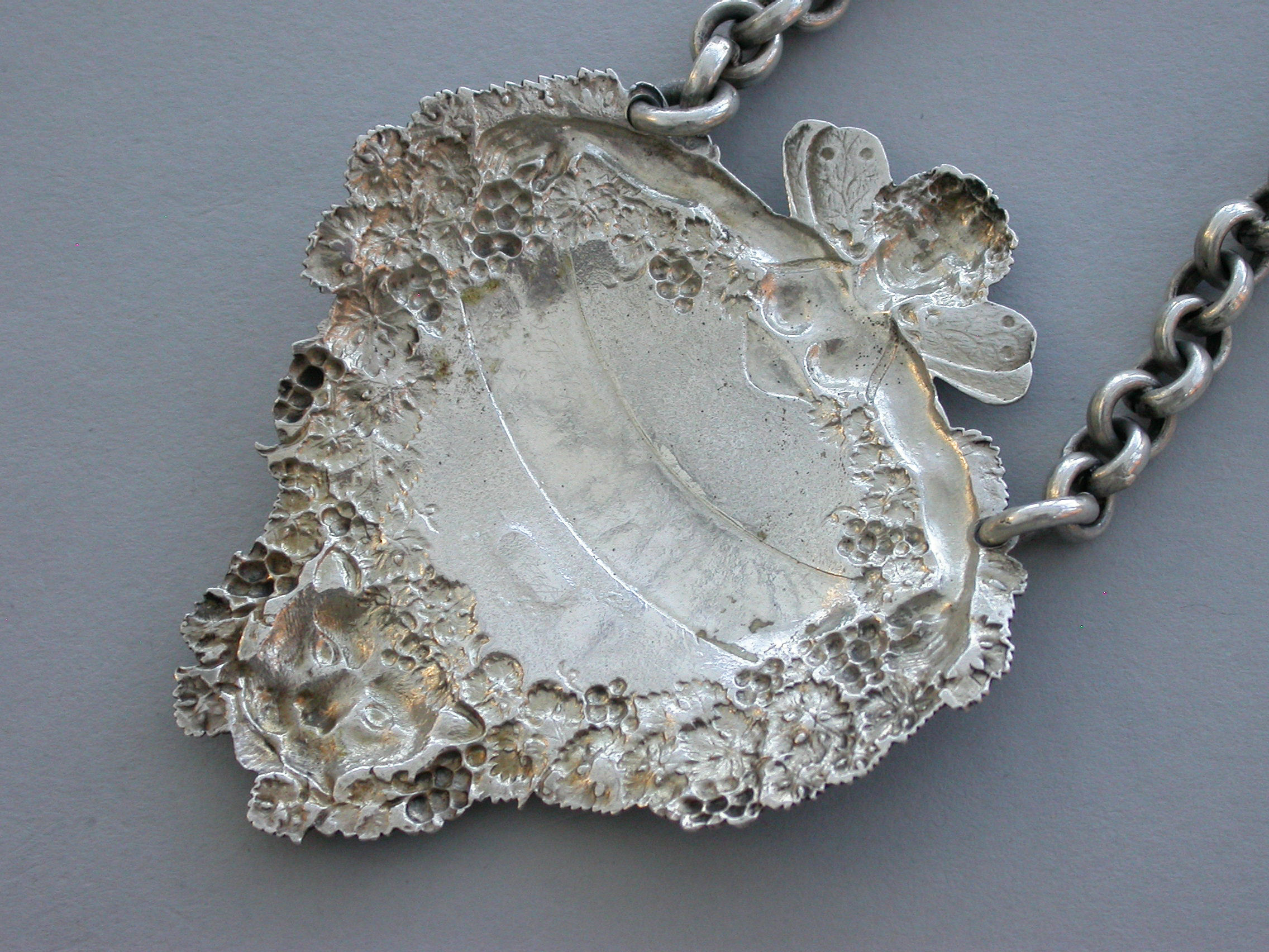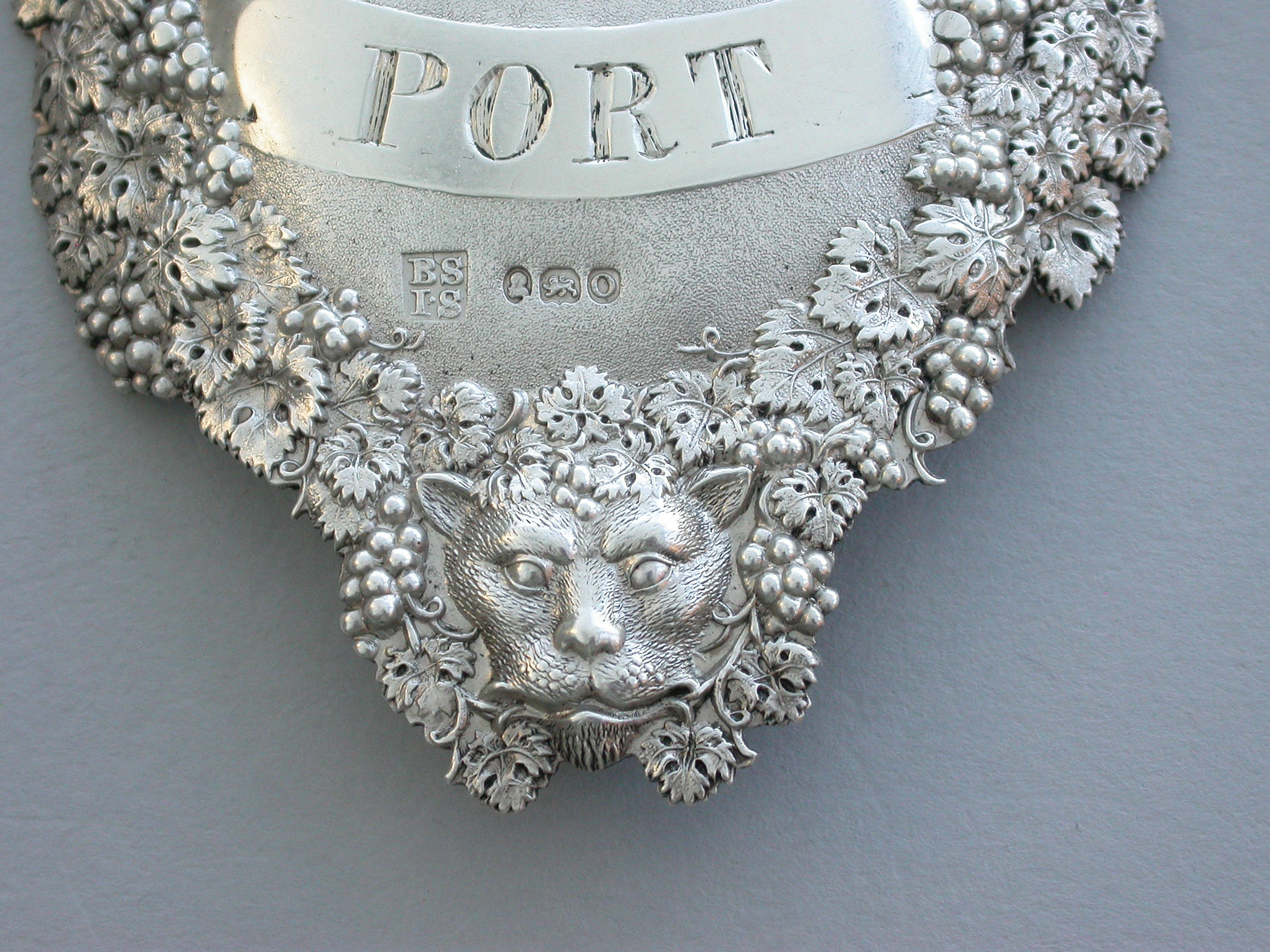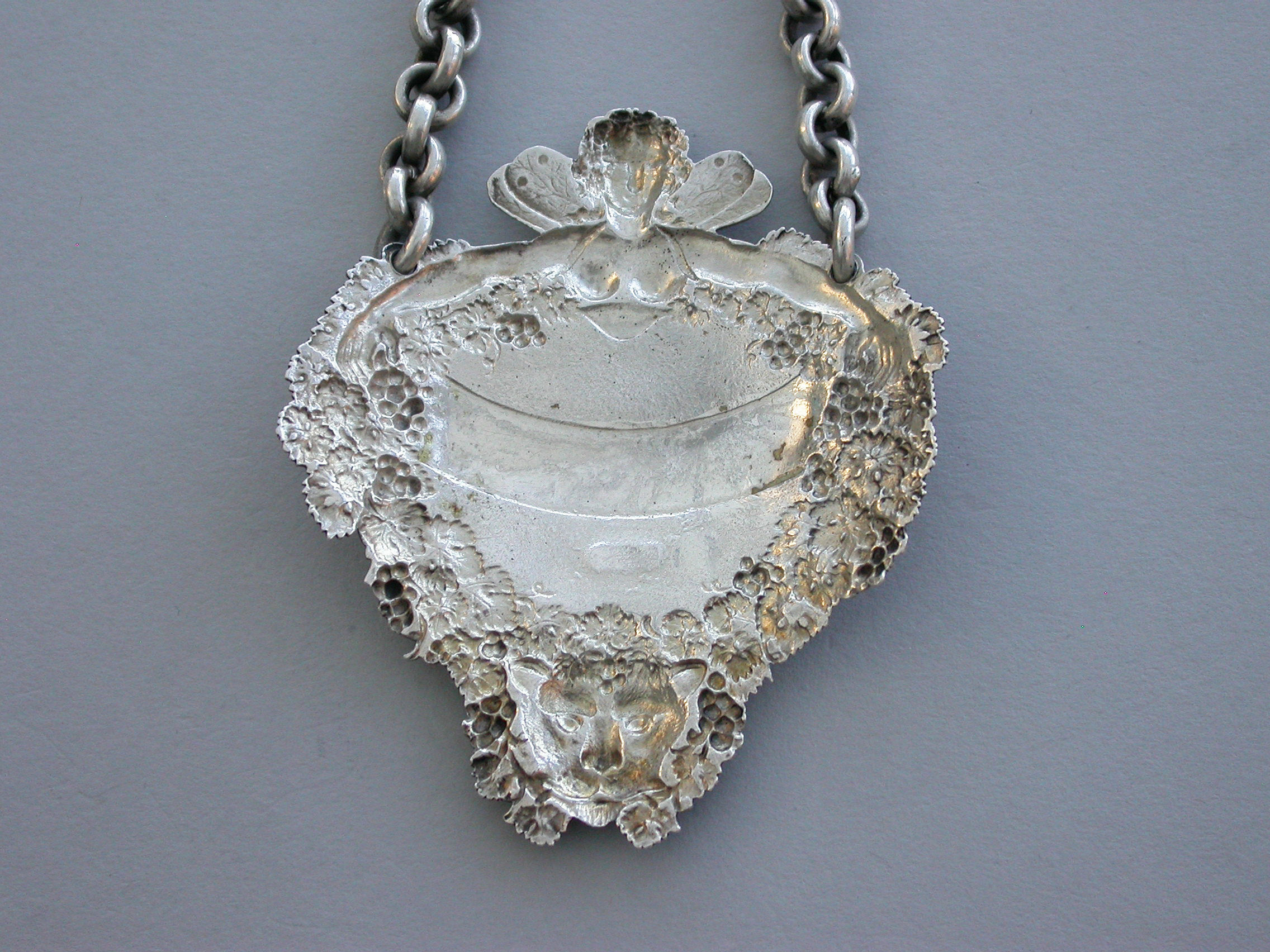An extremely fine and rare George III silver Wine Label, the shield shaped label surmounted by a naked winged female figure with long outstretched arms and wings, a vine leaf and grape border with lions mask to the base, the plain name plate incised for Port, on a frosted background. Complete with very heavy gauge suspension chain, this is the larger of the two known sizes.