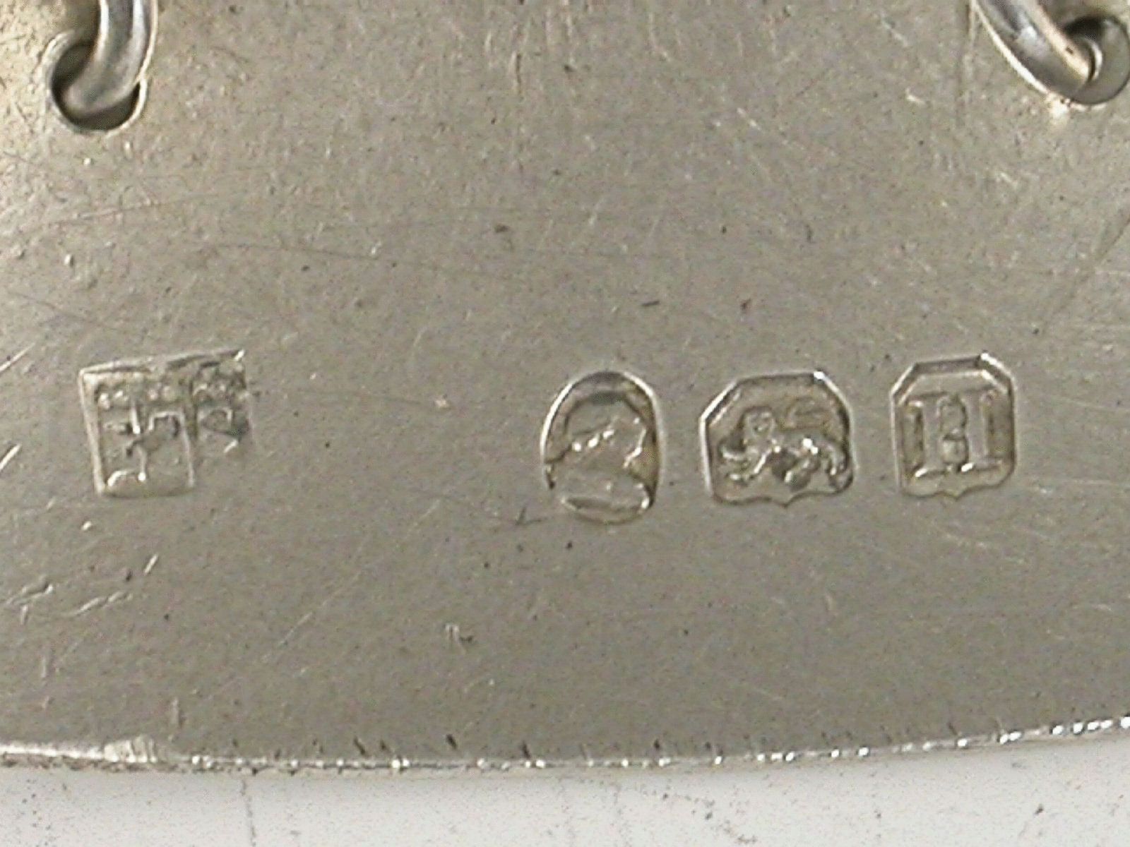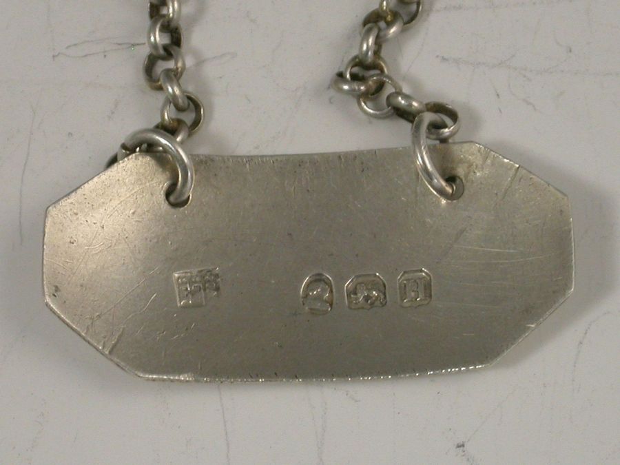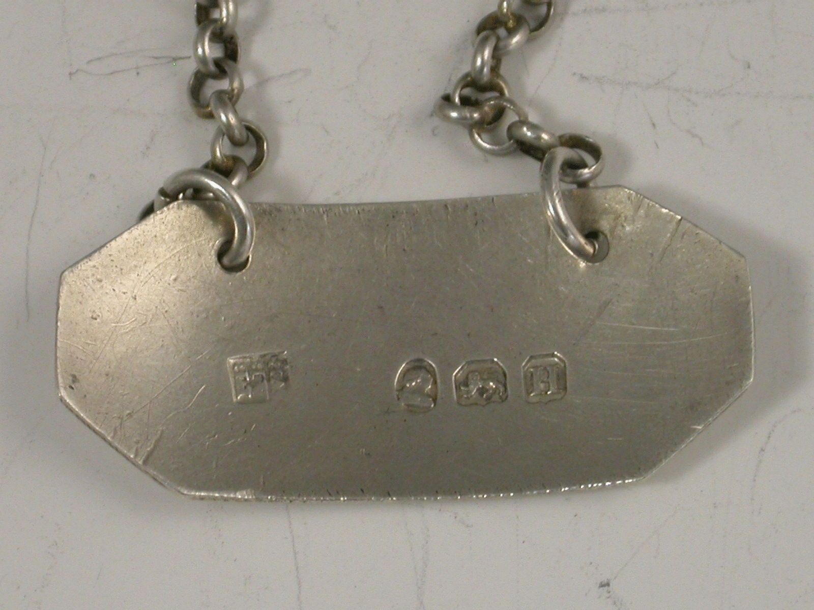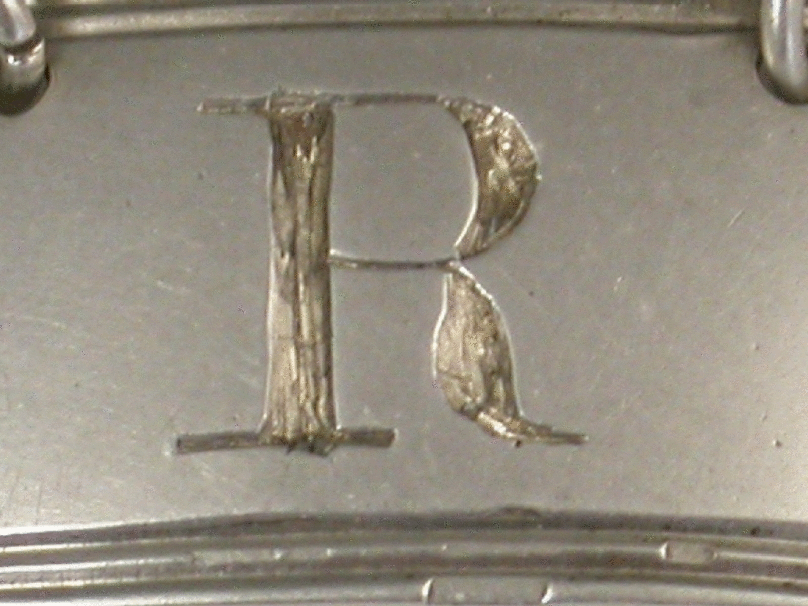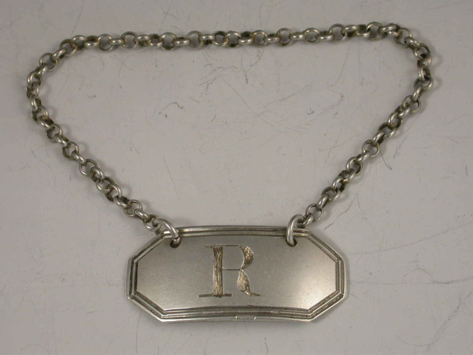 An unusual George III small silver Wine Label of cut cornered rectangular form with double thread border, incised with a capital letter R for Rum.