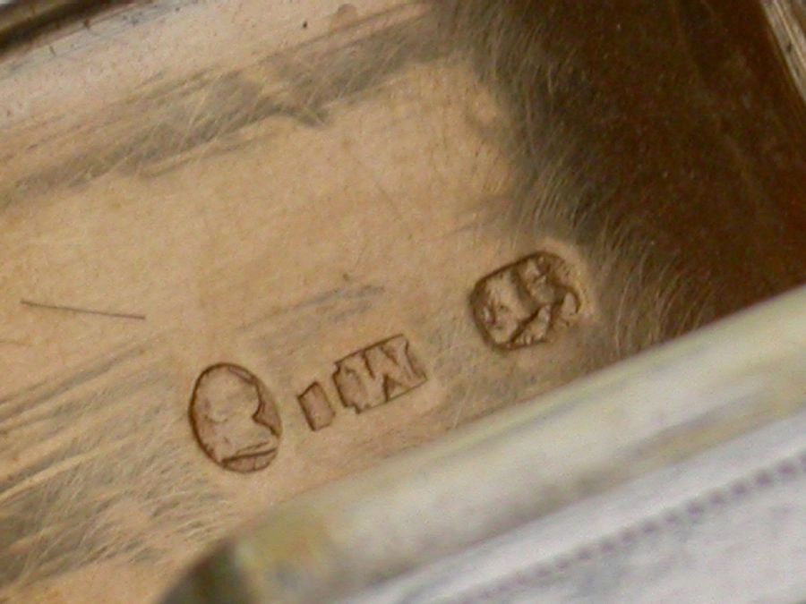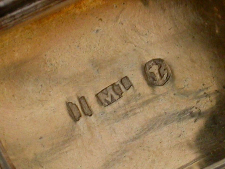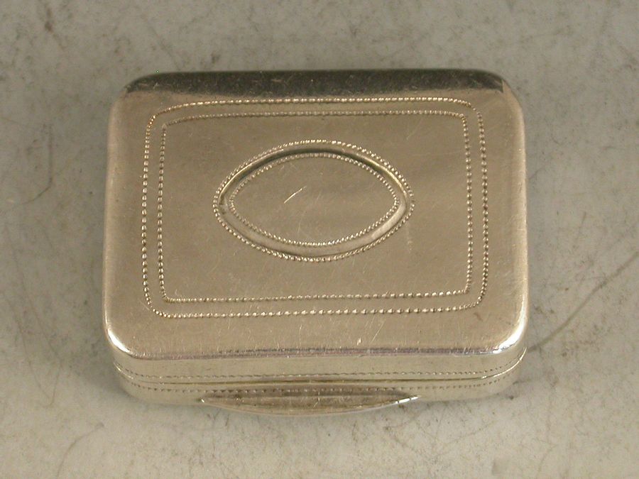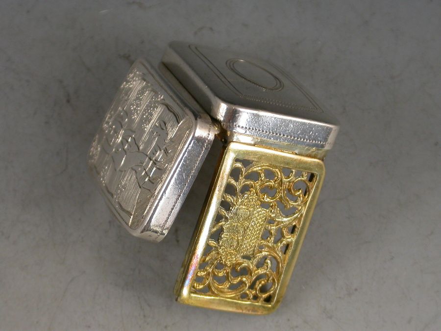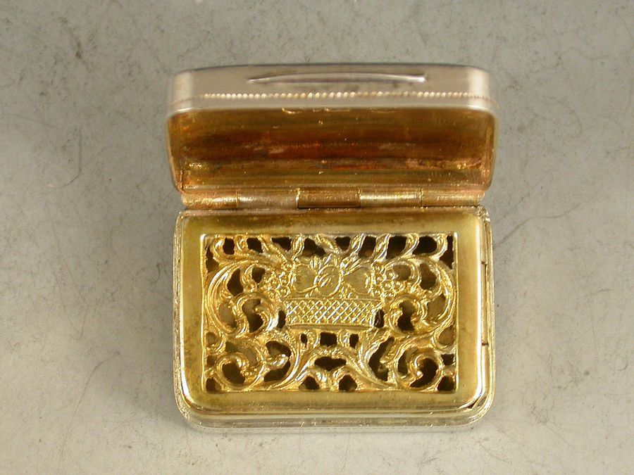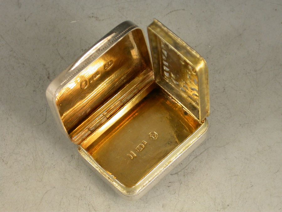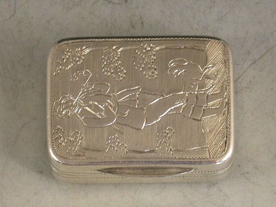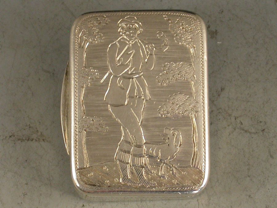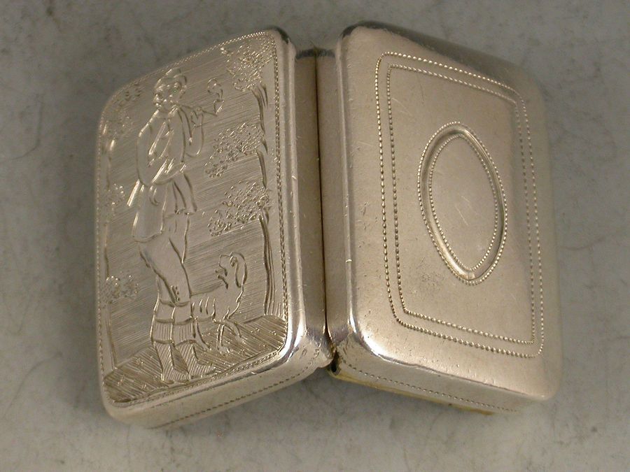 A very rare George III silver Vinaigrette of plain rounded rectangular form, the base and sides with prick-dot engraved decoration, the lid engraved with a scene depicting a Woodcutter smoking a pipe with a dog at his heals. The silver gilt interior with intricately pierced grille including a basket of fruit.