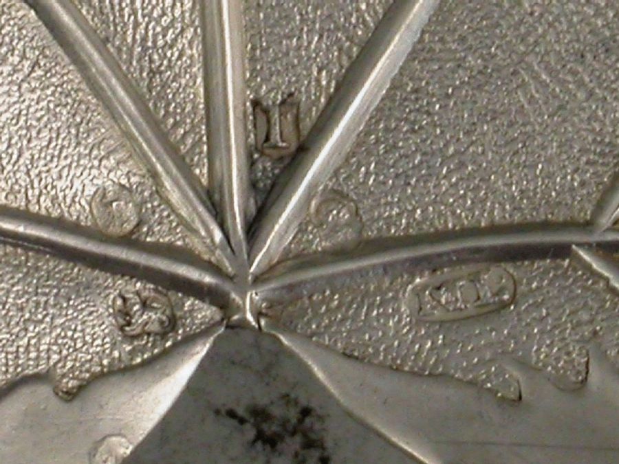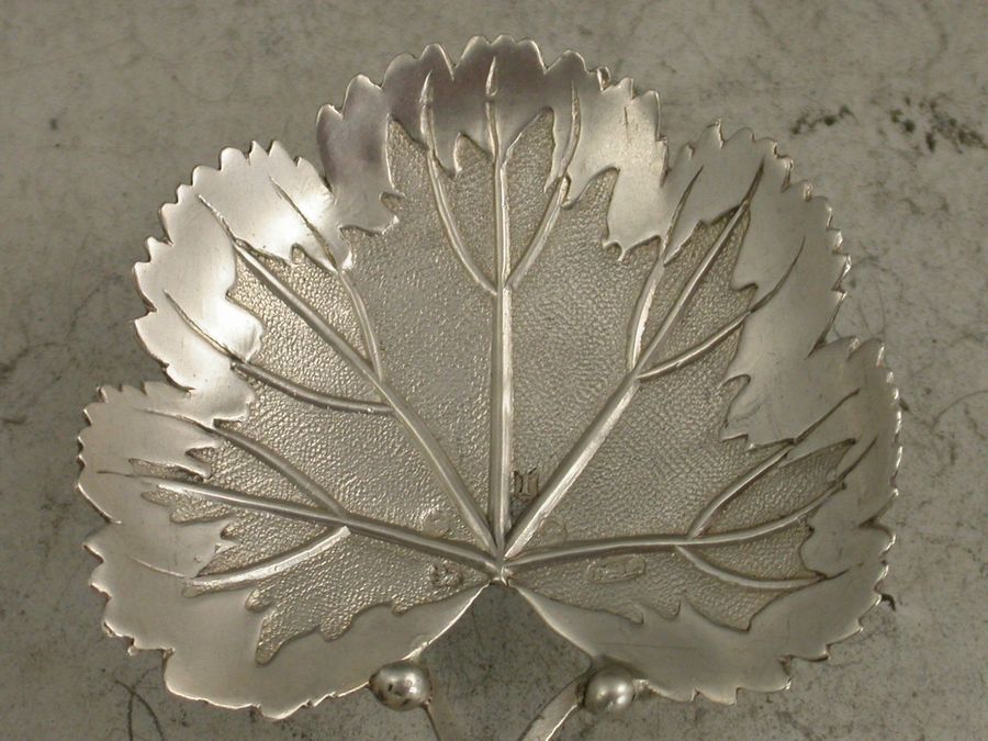 A rare George III silver Caddy Spoon, the bowl formed as a strawberry leaf with veins, matted background and serrated rim, the bifurcated handle with vacant oval cartouche.