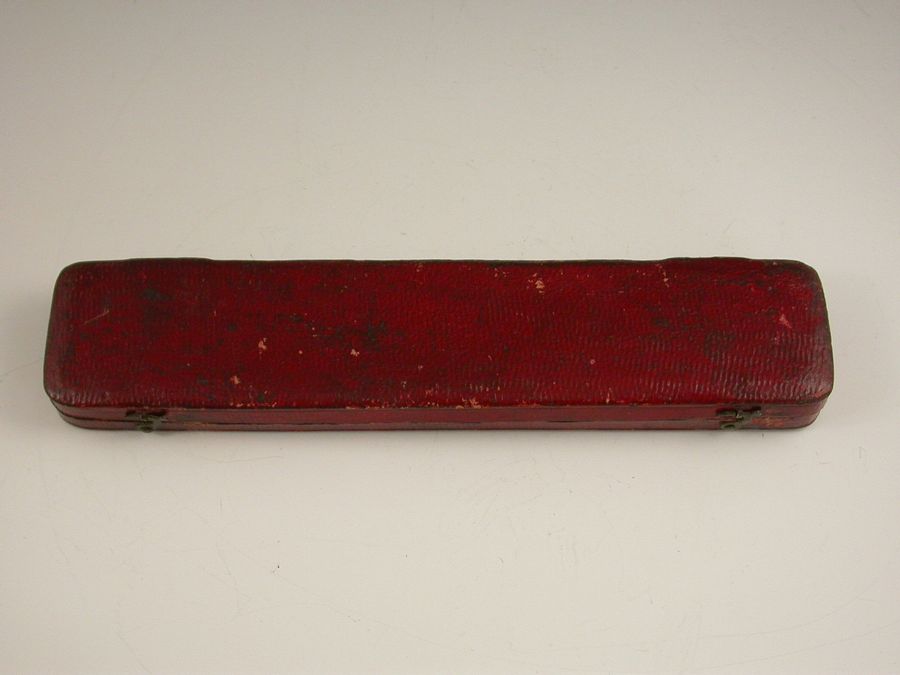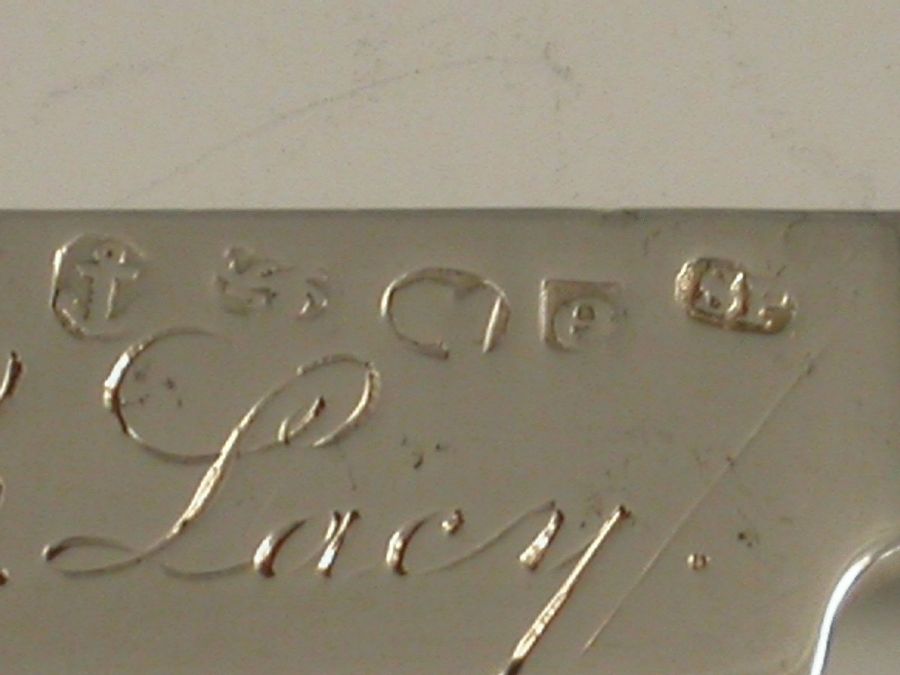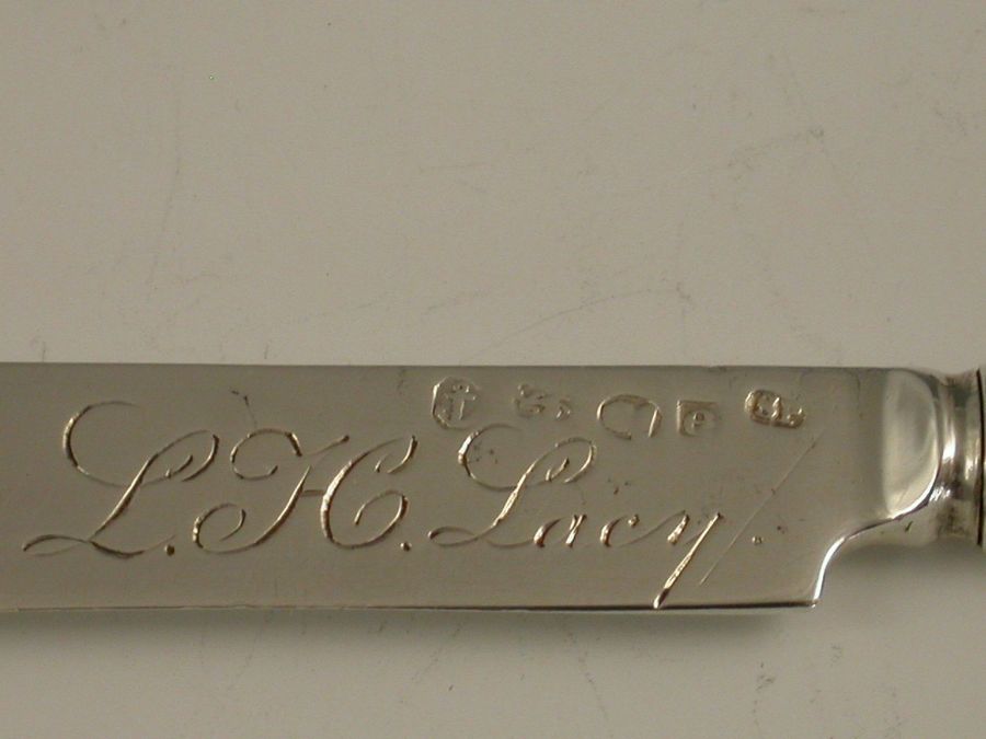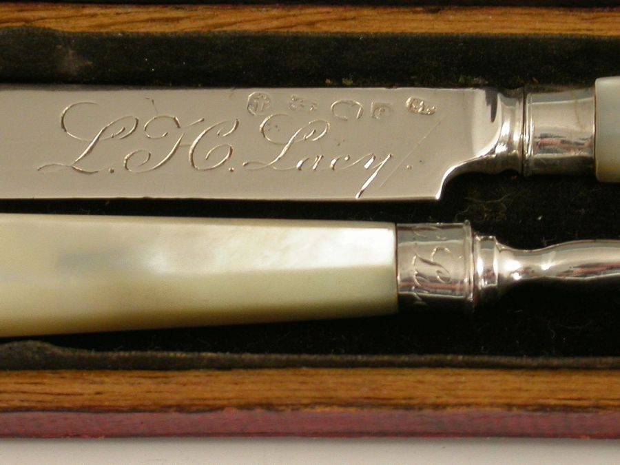 A George III cased silver Travelling Knife and Fork with shaped Mother of Pearl handles, engraved with the owners name in script – L.H. Lacey. Complete with original velvet lined Morocco red leather case.