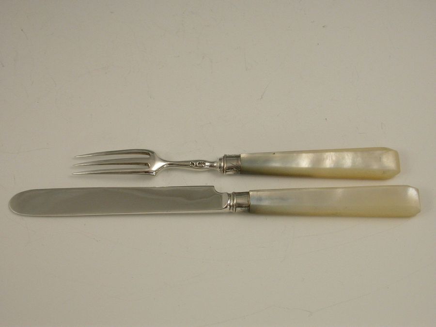 In good condition with no damage or repair. Minor natural flaw to Mother of Pearl fork handle.