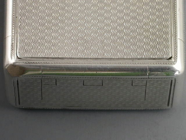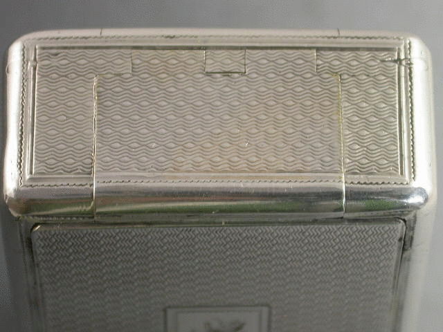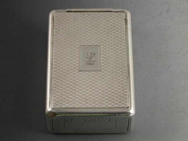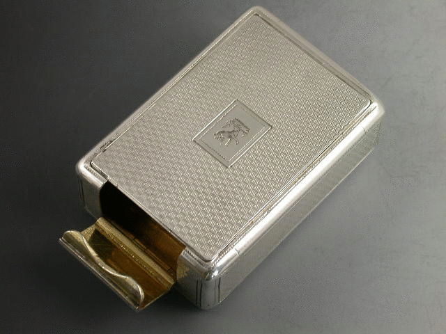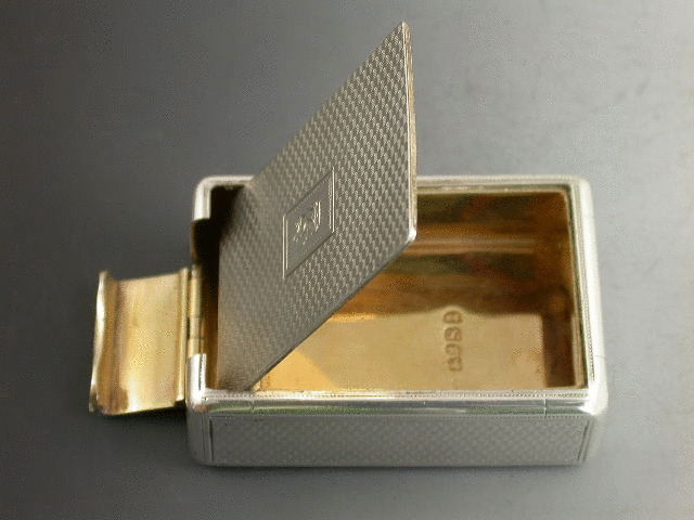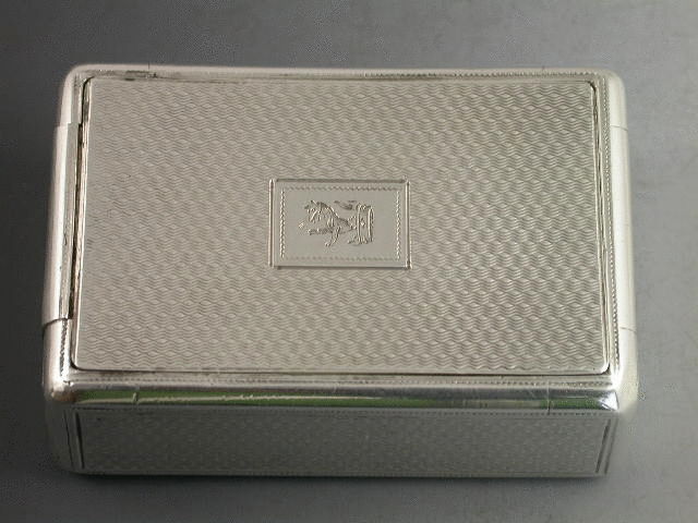 An extremely rare George III silver “Trick Opening” Snuff Box of rounded rectangular form with all over engine turned decoration, rectangular cartouche to lid engraved with a crest of a rampant wolf out of a coronet. Silver gilt interior. The opening mechanism is superbly made to deceive, with false flush hinge engraved to one end. The box is opened by inserting a nail at the top rim (one end only) which opens the fall down flap; pressure is then applied to the lid at the open end which pops up the main lid. All the hinges are very well concealed and completely flush.