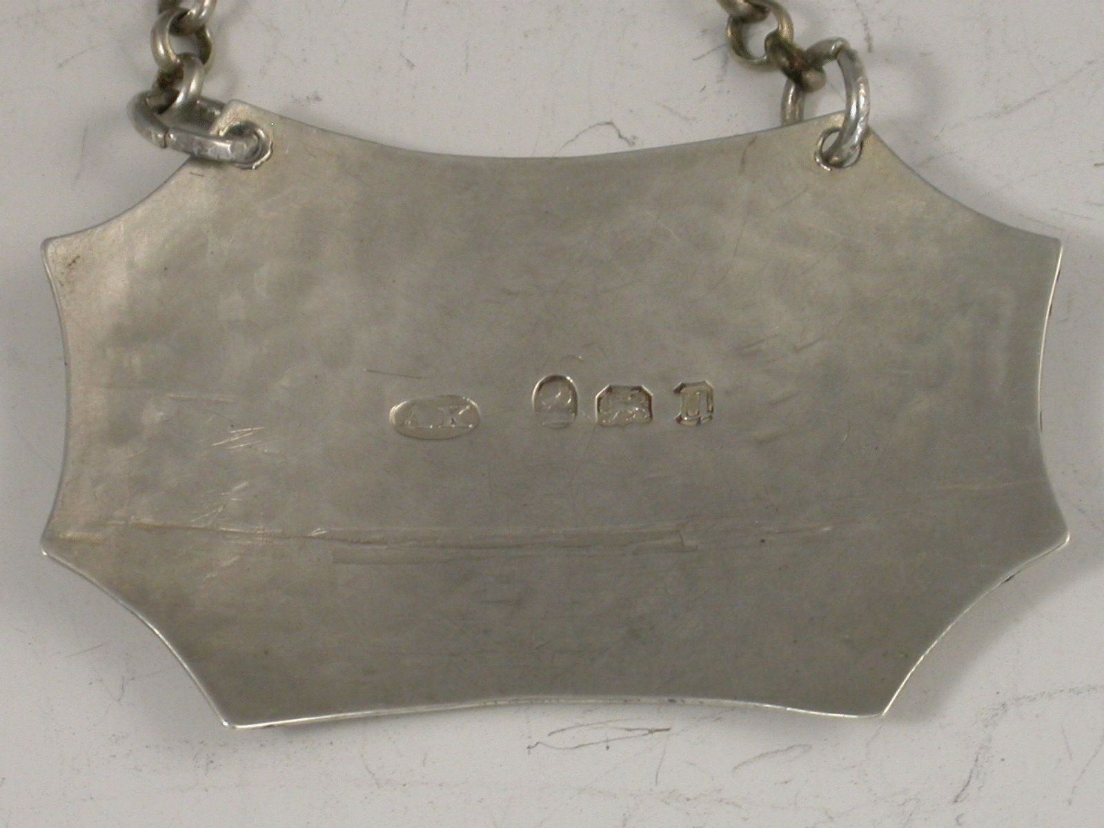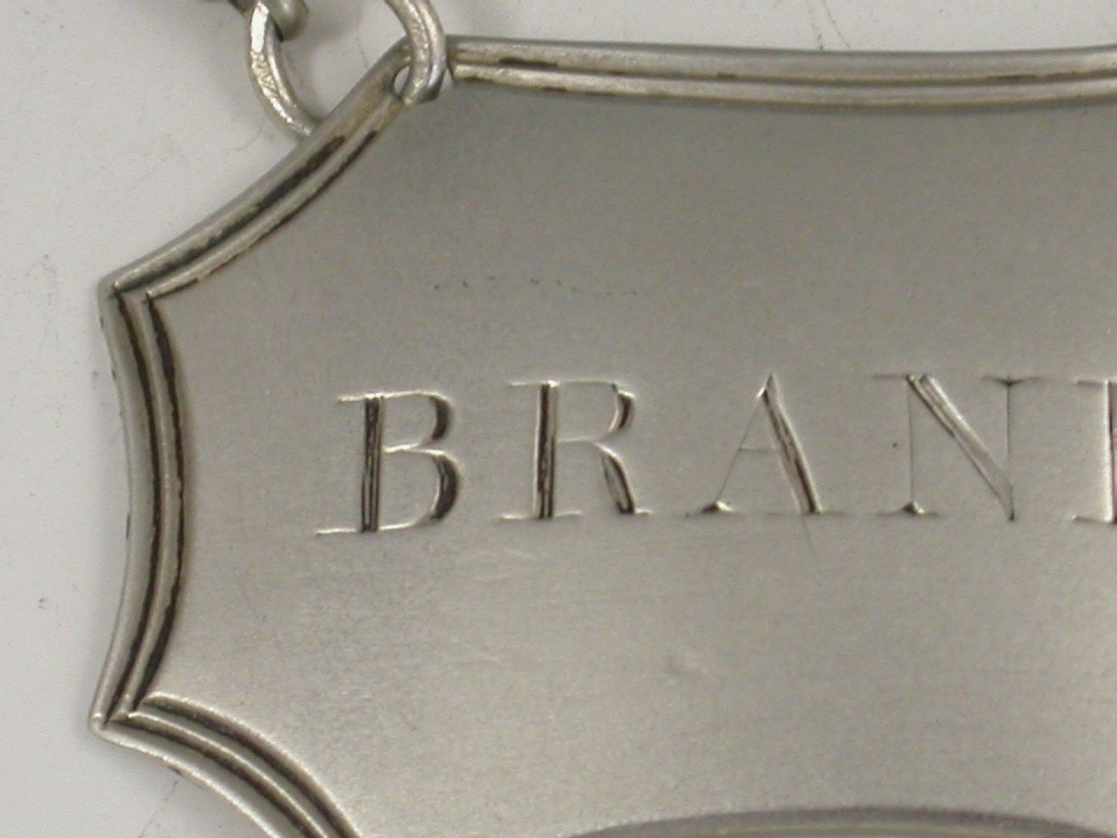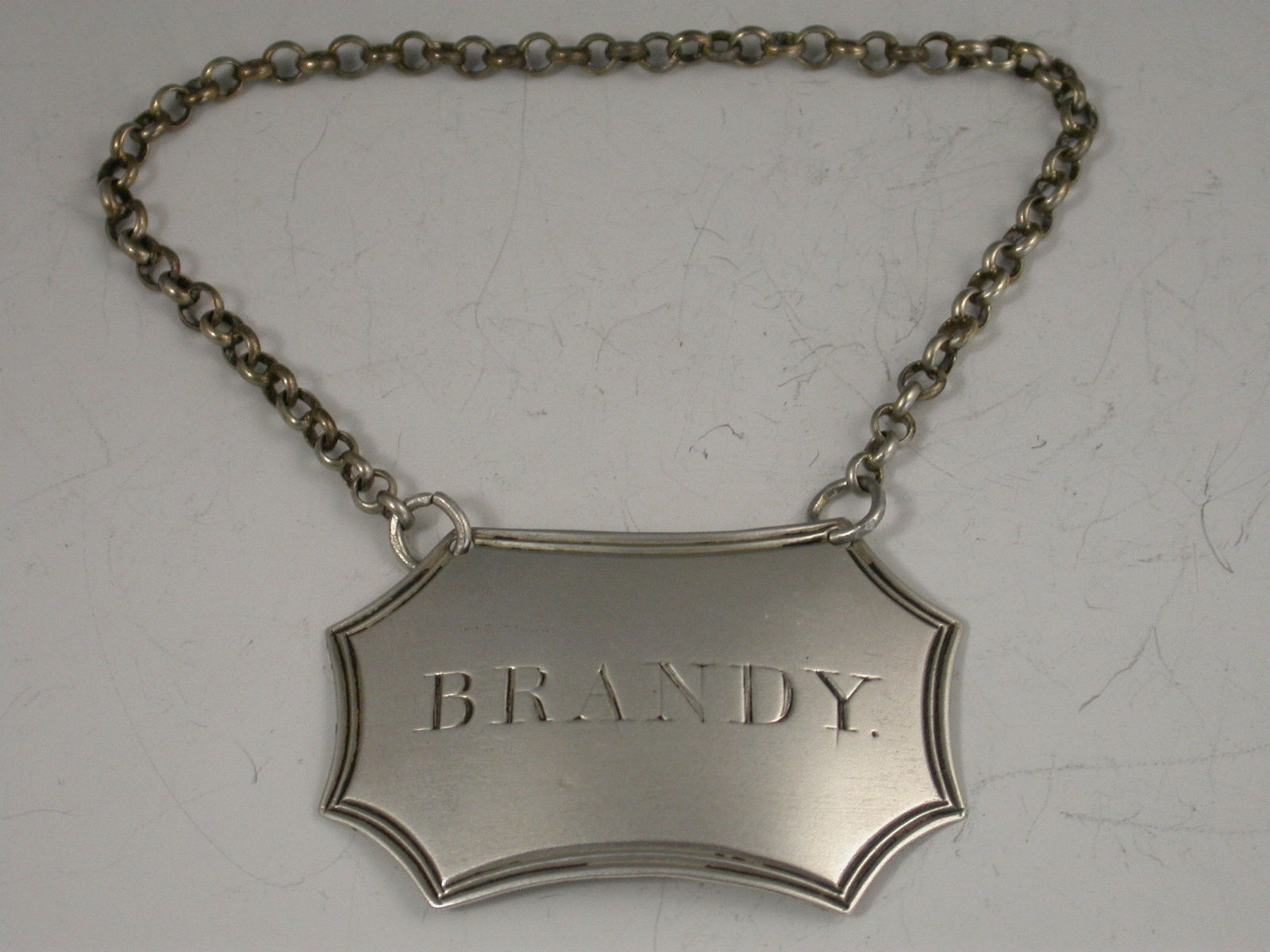 A George III silver Wine Label of shaped rectangular form with double reeded border, incised for Brandy.
