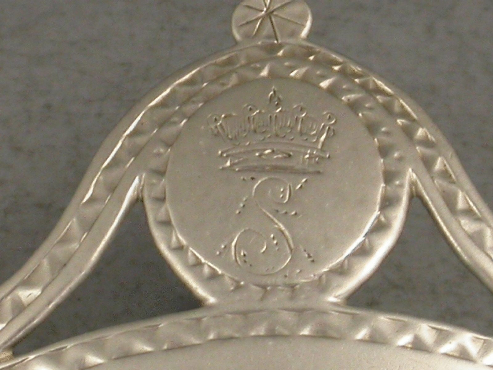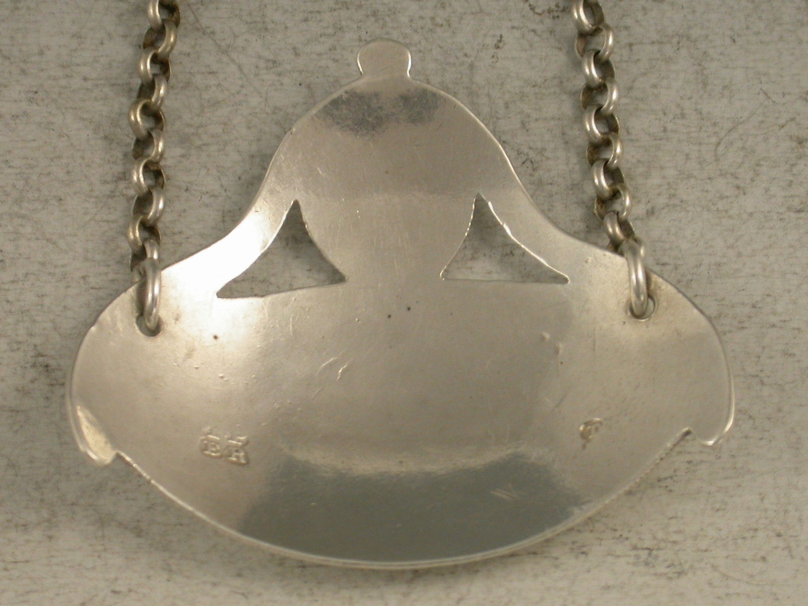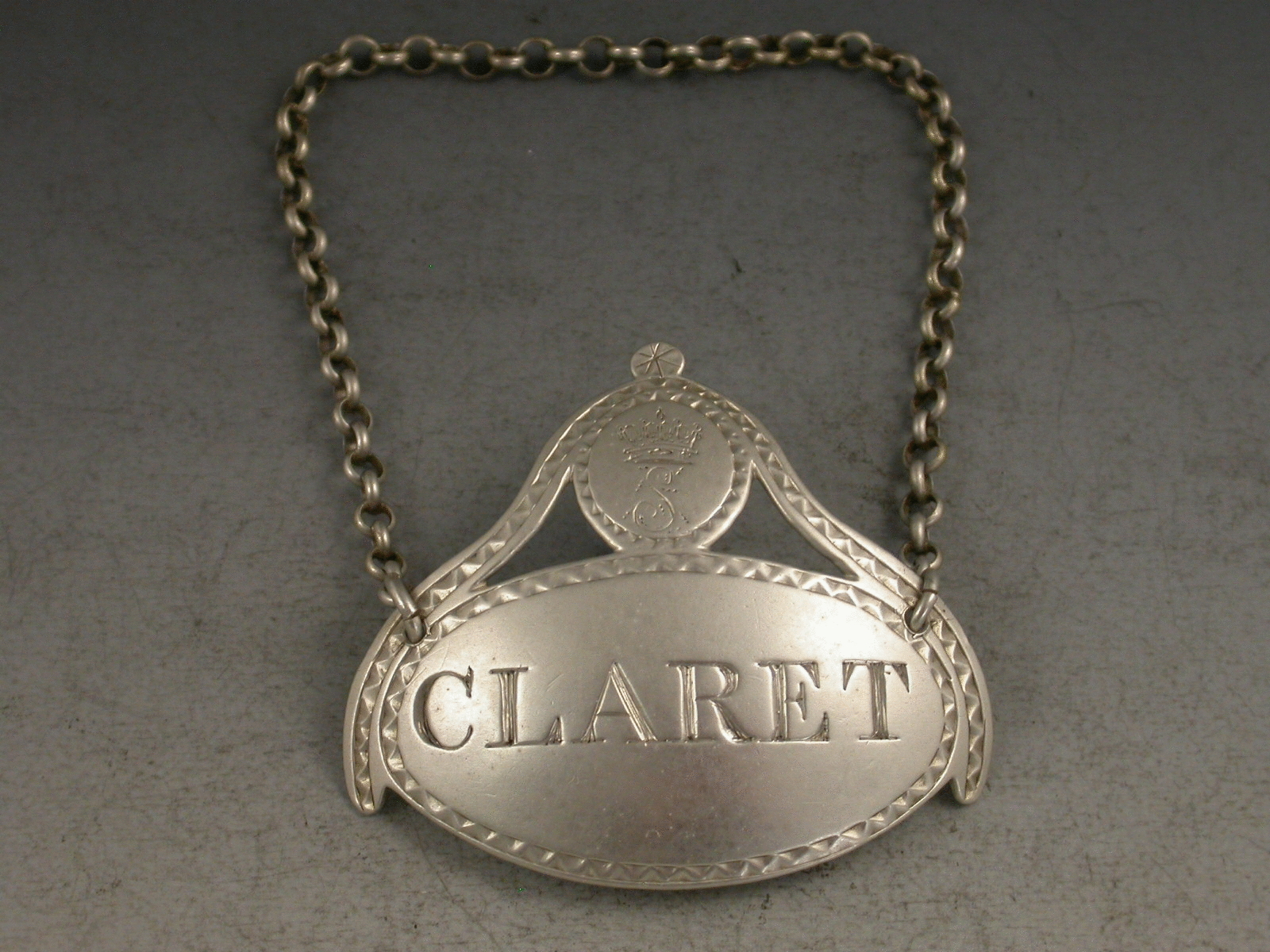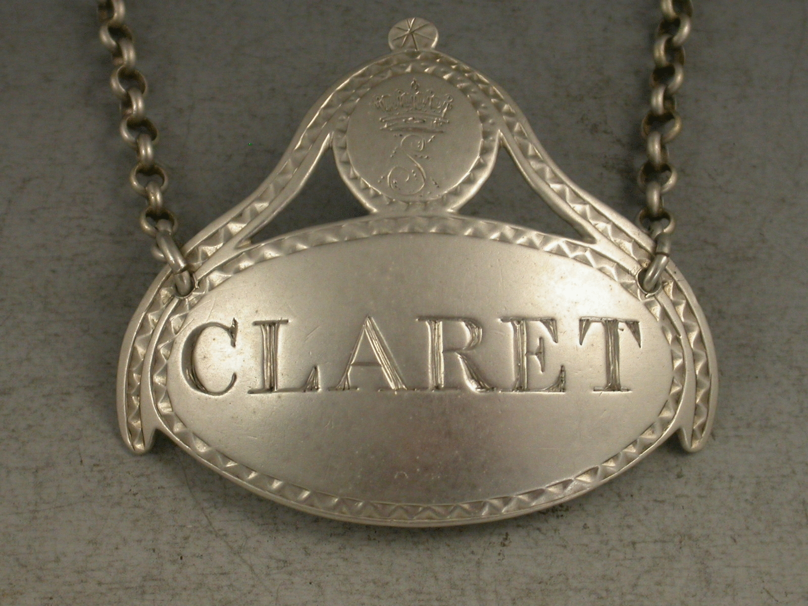 A good George III silver wine Label of oval form with crested shield surmount supported by swags, incised for Claret, with bright cut feather edge border. The shield engraved with an Earl’s Coronet above a script initial ‘S’. For Spencer.