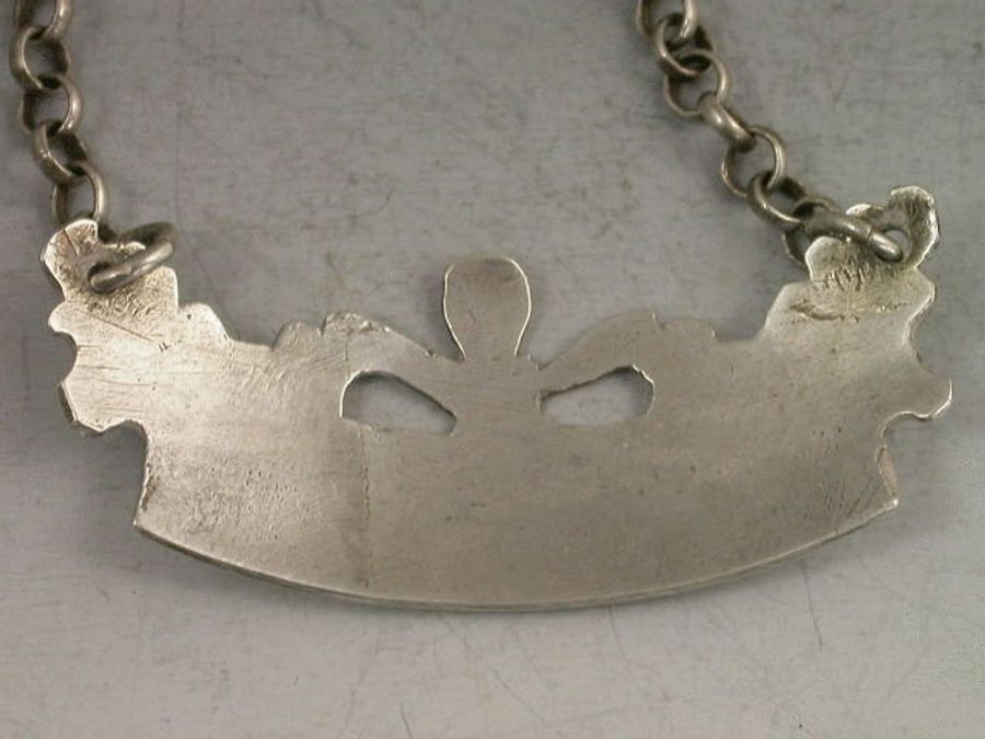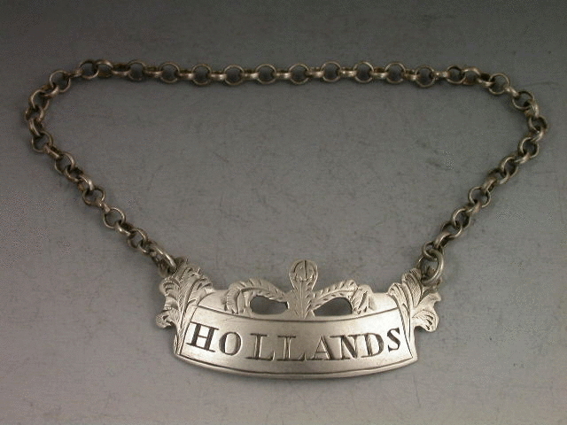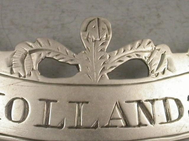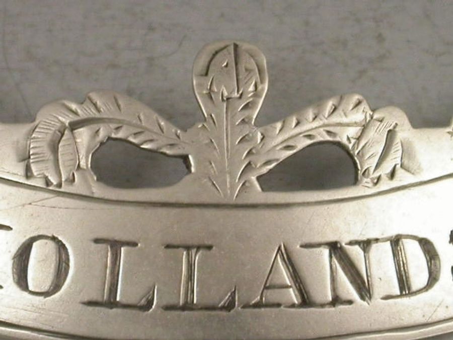 An unusual 18th century silver Wine Label of flat crescent form with plumed ends and Prince of Wales feathers type pierced surmount, bright-cut engraved decoration, incised for HOLLANDS.